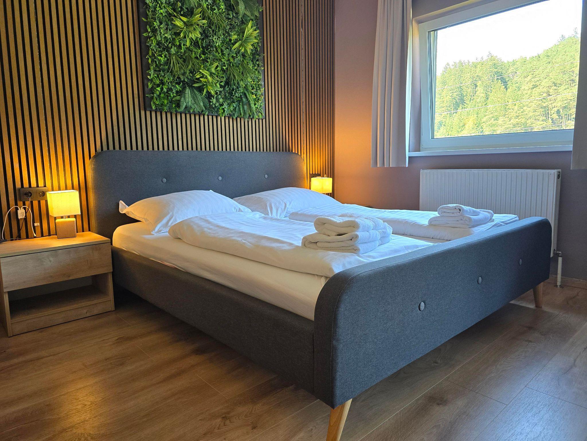 Dich erwartet ein Apartment mit einem Schlafzimmer, Küche und Badezimmer sowie einem Balkon. Es gibt ein Doppelbett und drei Einzelbetten.
