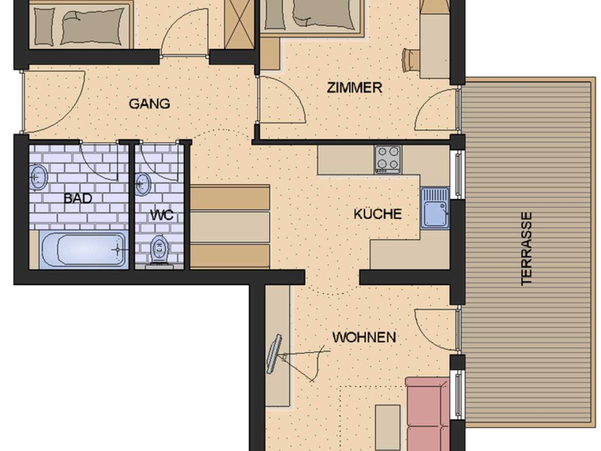 Entrance hall with coat rack, spacious kitchen with dining corner, living room, 2 sleeping rooms, bathroom, seperate WC, balcony, satellite TV, cellar