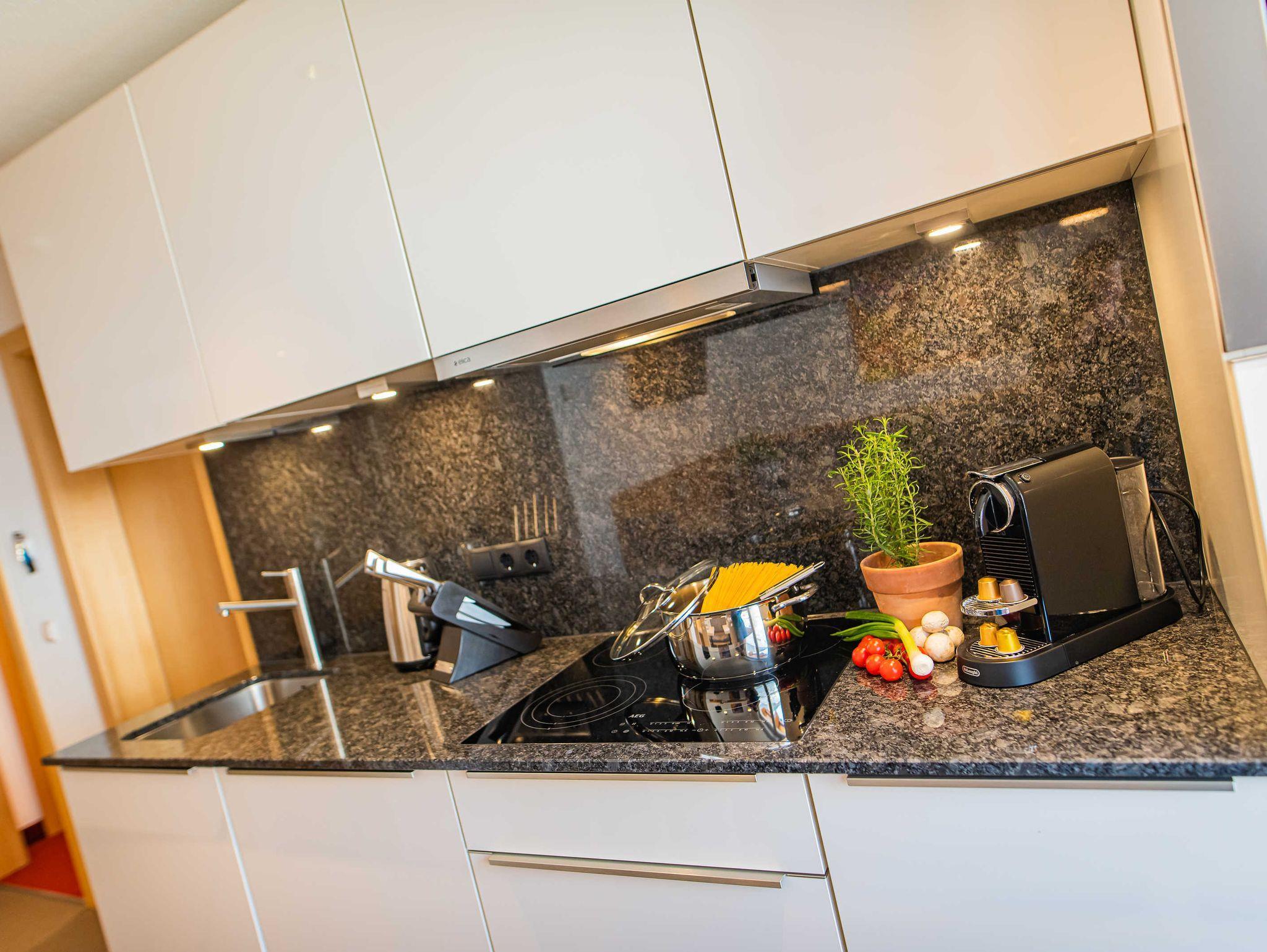• vollausgestatte Kochnische mit Ceran-Kochfeld, Kühlschrank mit Gefrierfach, Geschirrspüler, Mikrowelle, Tap-Kaffeemaschine, Wasserkocher, Toaster und vielem mehr