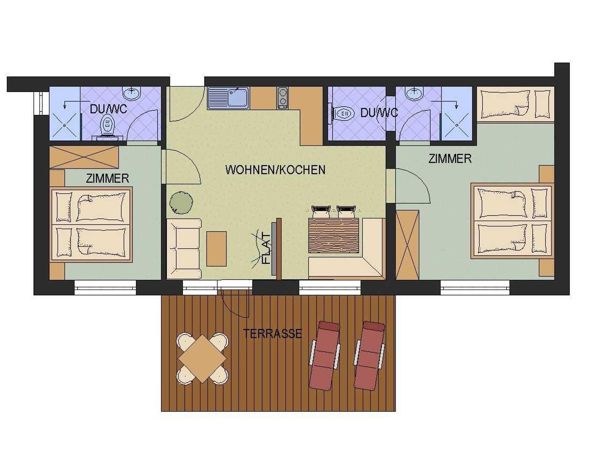 Stilvoll, modern und gemütlich ausgestattet. Mit 2 Schlafräumen: Für 2 Personen (Doppelbett) und für 4 Personen (Doppelbett und Etagenbett) mit jeweils eigener Dusche/WC. Top Wohnküche, abgetrennter Wohnzimmerbereich mit SAT-TV. Internet, Brötchenservice. Sehr sonnig, ruhig und ebenerdig gelegen. Das Appartement verfügt über eine eigene Terrasse mit wunderbarer, unverbauter Aussicht und Grillmöglichkeit. Neue Wellnessanlage in unserem Nachbarhaus Apart Austria gratis zu benützen! FINNSAUNA - DAMPFBAD - BIOSAUNA - KNEIPPBECKEN mit INFRAROTSITZE - EISGROTTE. Garage auf Anfrage! Nähe Skibushaltestelle.