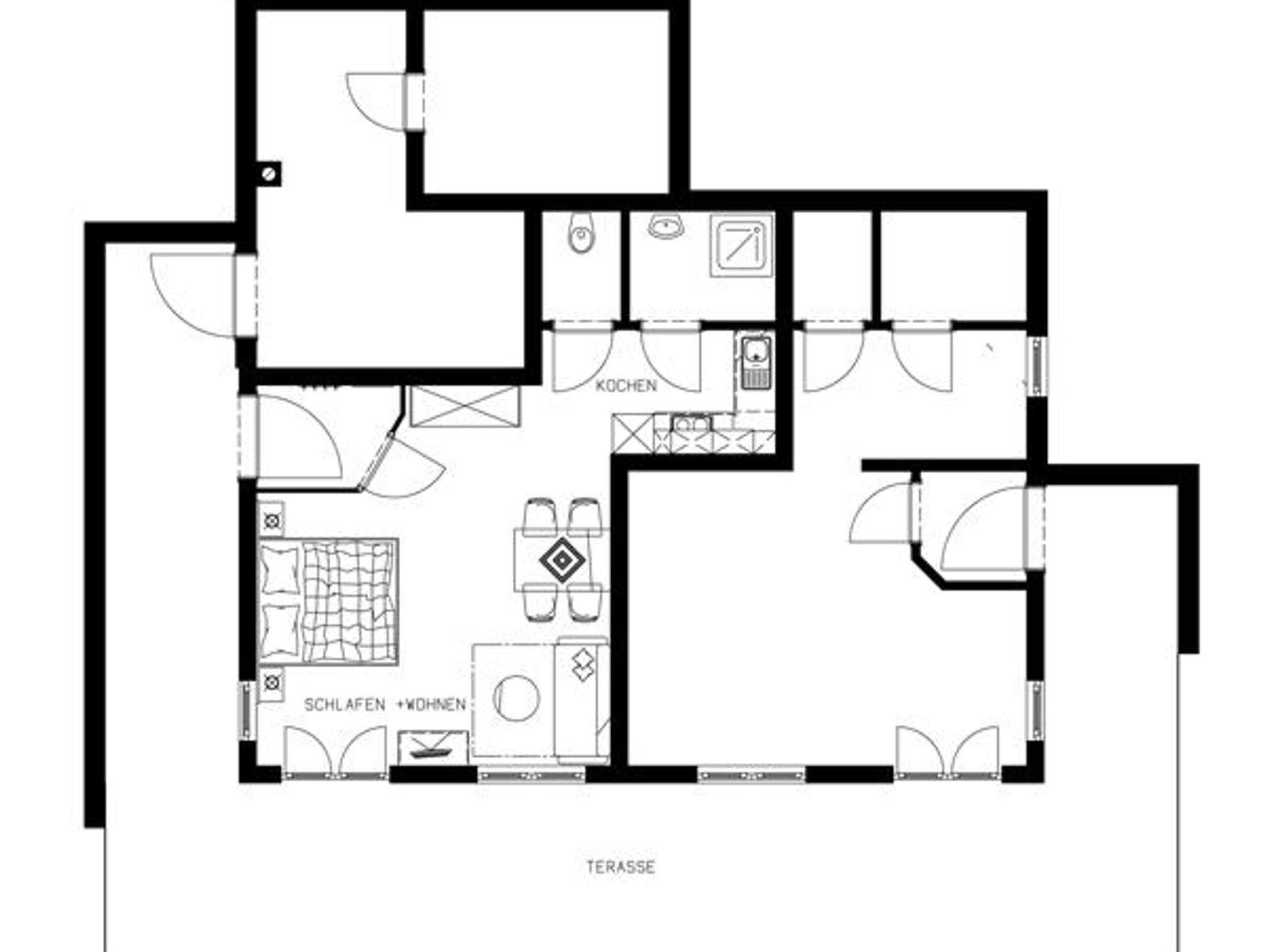 Appartement 3: 2-Zimmer-Wohnung 38 m2, im Erdgeschoss, modern und gemütlich eingerichtet: Eingang. Wohn-/Schlafzimmer mit Esstisch, Sat-TV. Ausgang zum Garten. Kochnische. Dusche, sep. WC. Grosse Terrasse 20 m2, Gartensitzplatz. Gartengrill.
