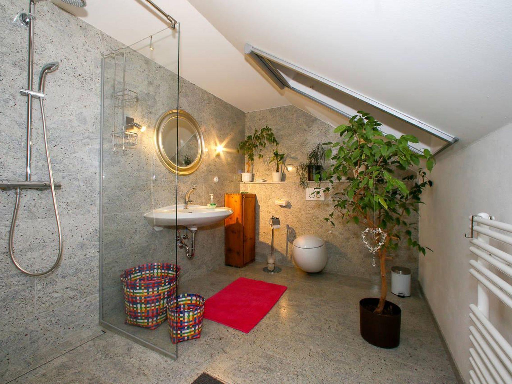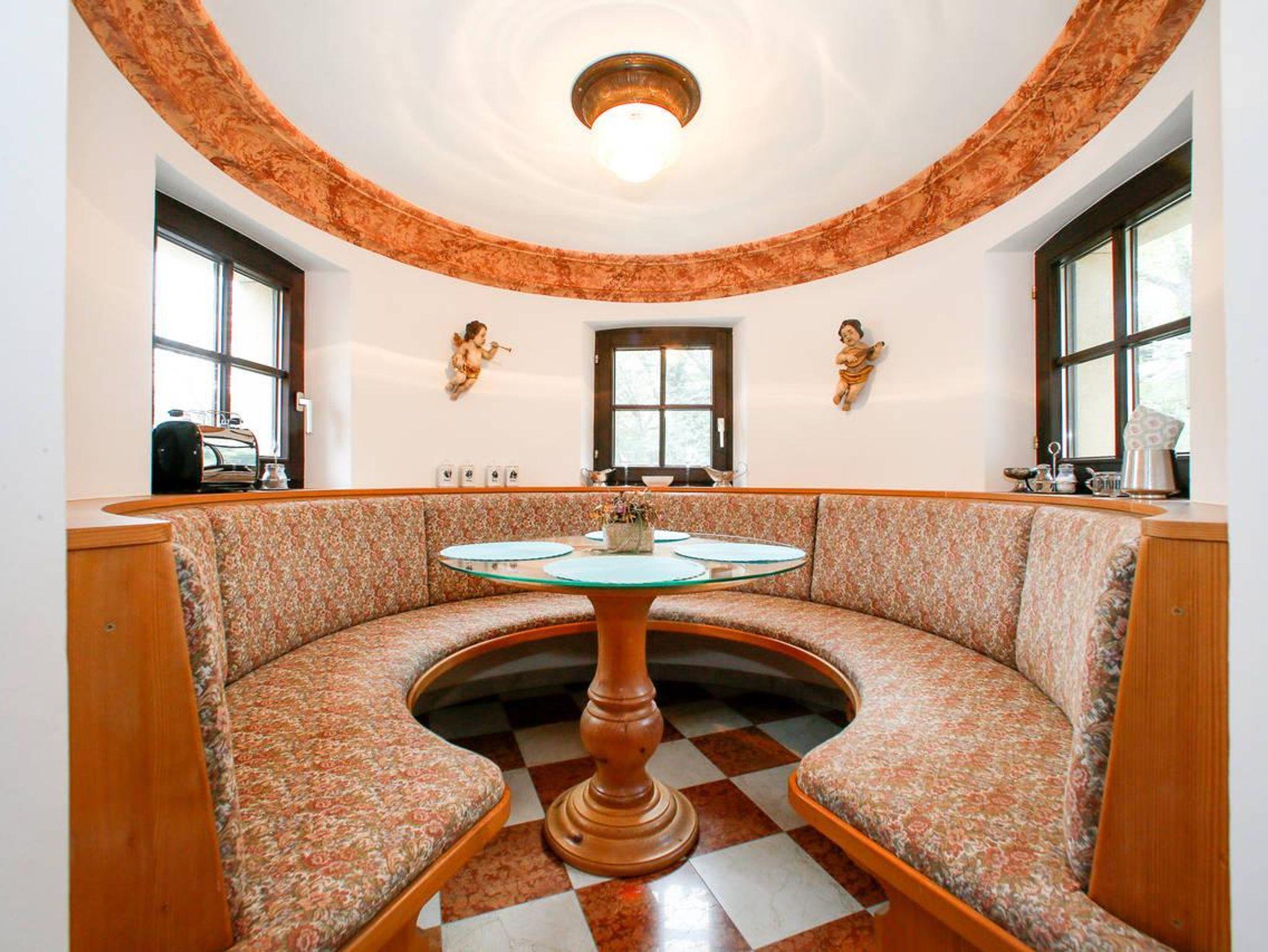 Die zweite Ferienwohnung mit 85m² hat im Erdgeschoß einen Küchenbereich (-Küchenzeile mit E-Ceranfeld -Dunstabzug -Backrohr-Geschirrspüler -Nespressomaschine -el. Wasserkocher -Kühlschrank mit Gefrierfach -Kochgeschirr und Geschirrtücher-Küchenmaschine), Essplatz im Turmstübchen (-Sitzbank rund -Tisch rund -Toaster) oder Essplatz im Garten unter dem großen, schattigen Nussbaum, einen Wohnbereich (-Kachelofen -Barockkasten -Flachbildschirm (Kabel TV) -Sofa und Sitzelemente-Kleiderständer -Korbtruhe), ein Badezimmer (-Dusche -antikes Waschbecken -Fön-Handtücher -Badetücher-Vergrößerungsspiegel -1.Hilfe Set) und ein WC.
