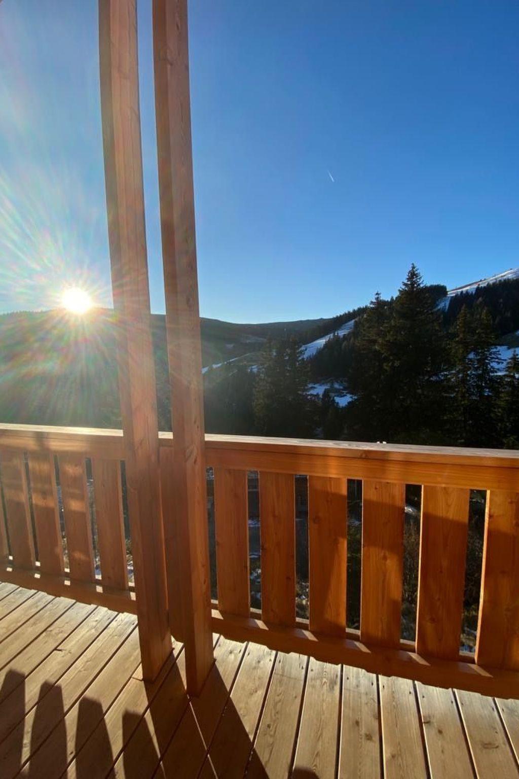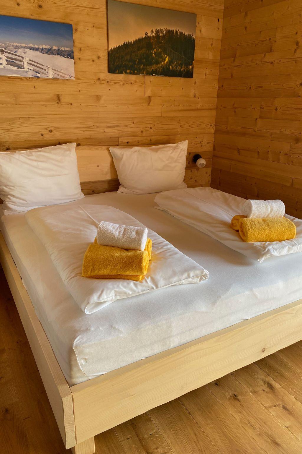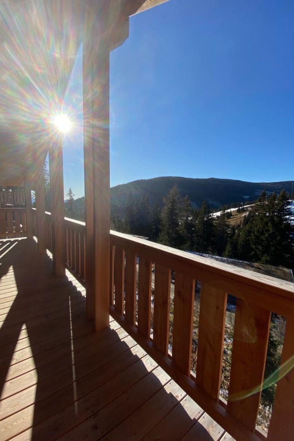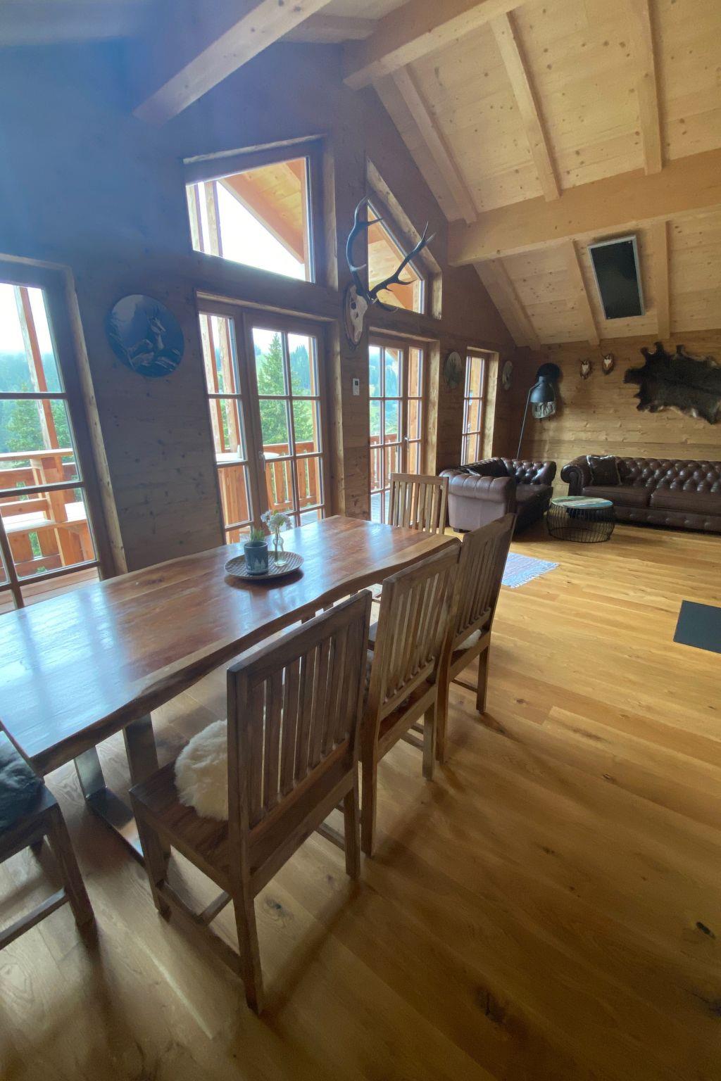 Our hunting lodge has a spacious living/dining area with panoramic windows overlooking the surrounding mountains, a fully equipped kitchen, a wood-burning stove for cosy warmth, four double bedrooms with satellite TV and their own small bathroom, some with a small terrace, a sauna and a ski and drying room. bed linen and towels are provided. Bathrobes can be booked for a fee.