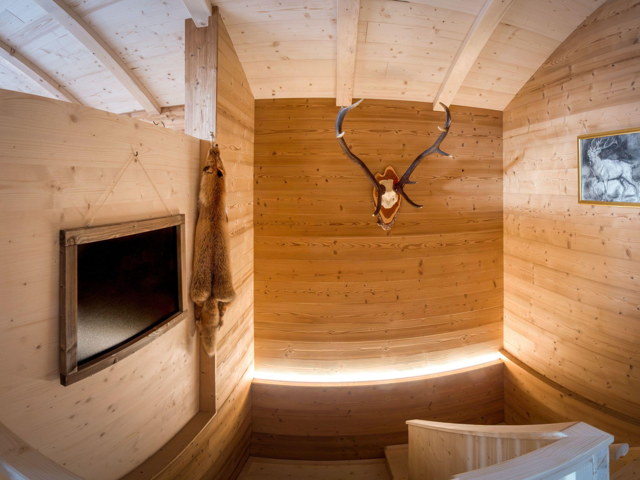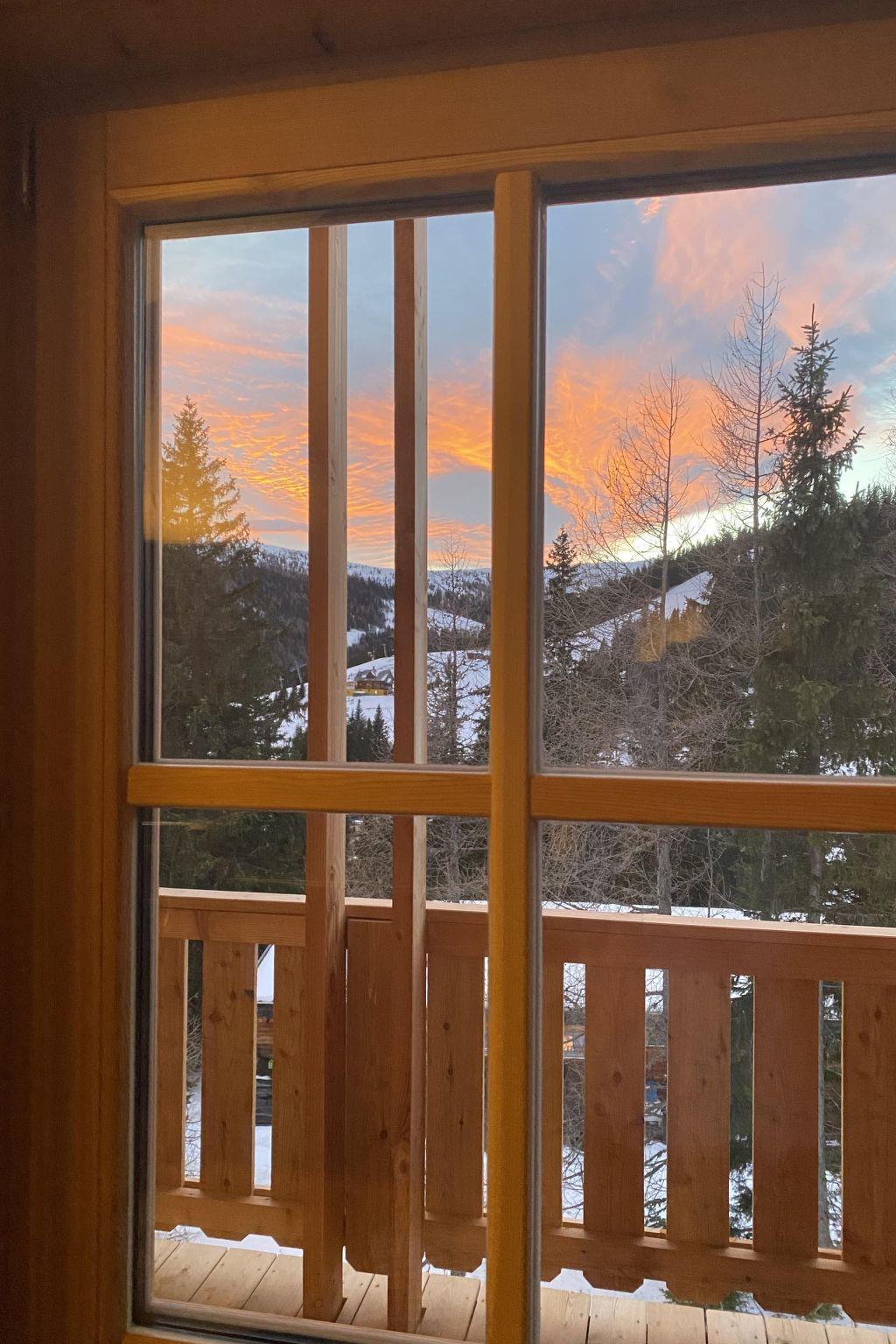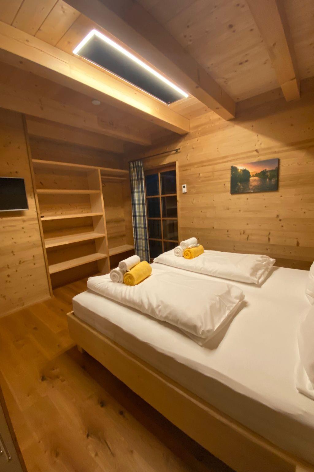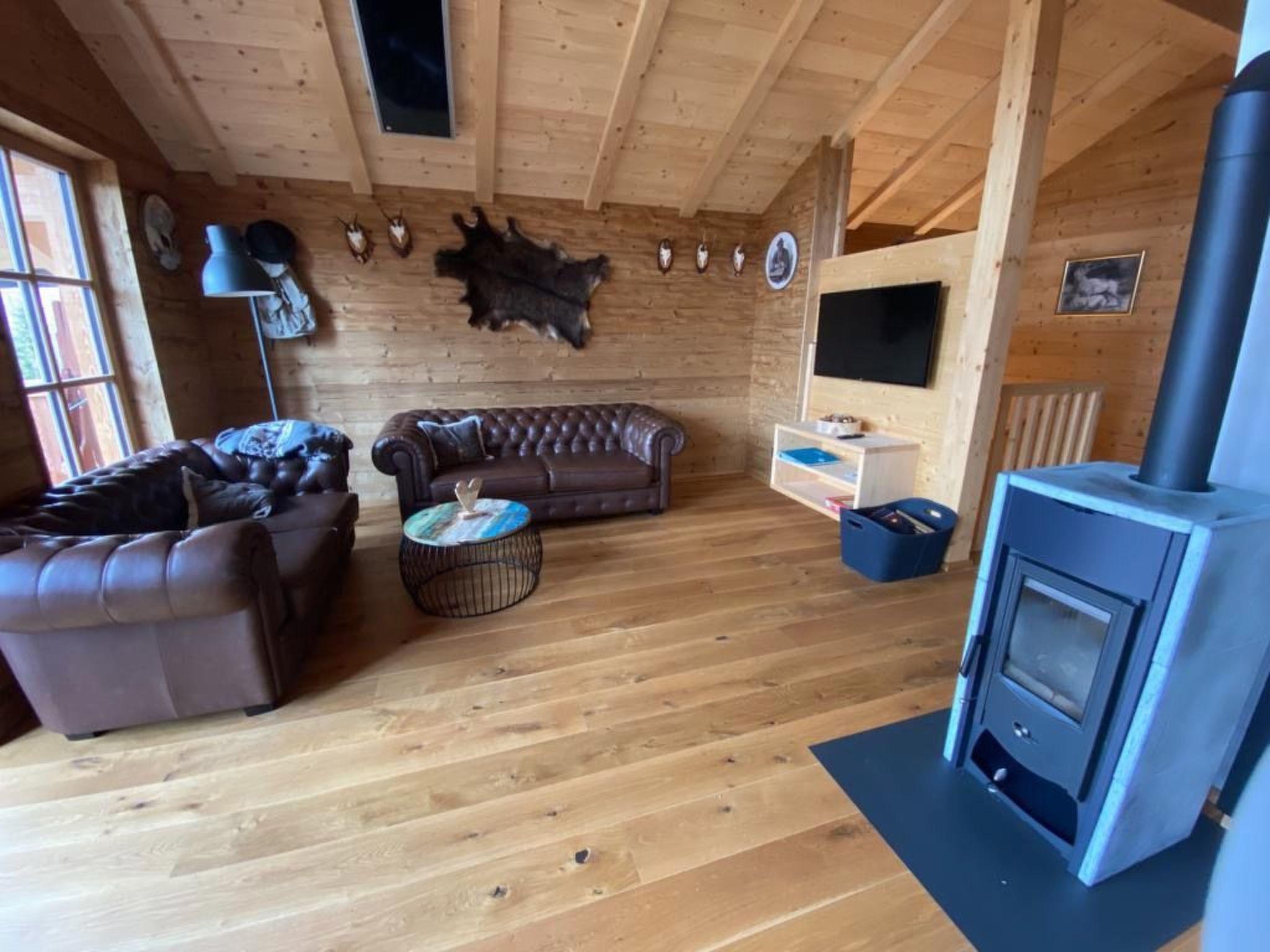 Our hunting lodge has a spacious living/dining area with panoramic windows overlooking the surrounding mountains, a fully equipped kitchen, a wood-burning stove for cosy warmth, four double bedrooms with satellite TV and their own small bathroom, some with a small terrace, a sauna and a ski and drying room. bed linen and towels are provided. Bathrobes can be booked for a fee.