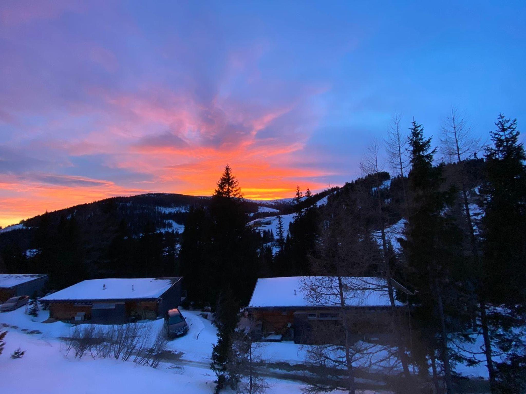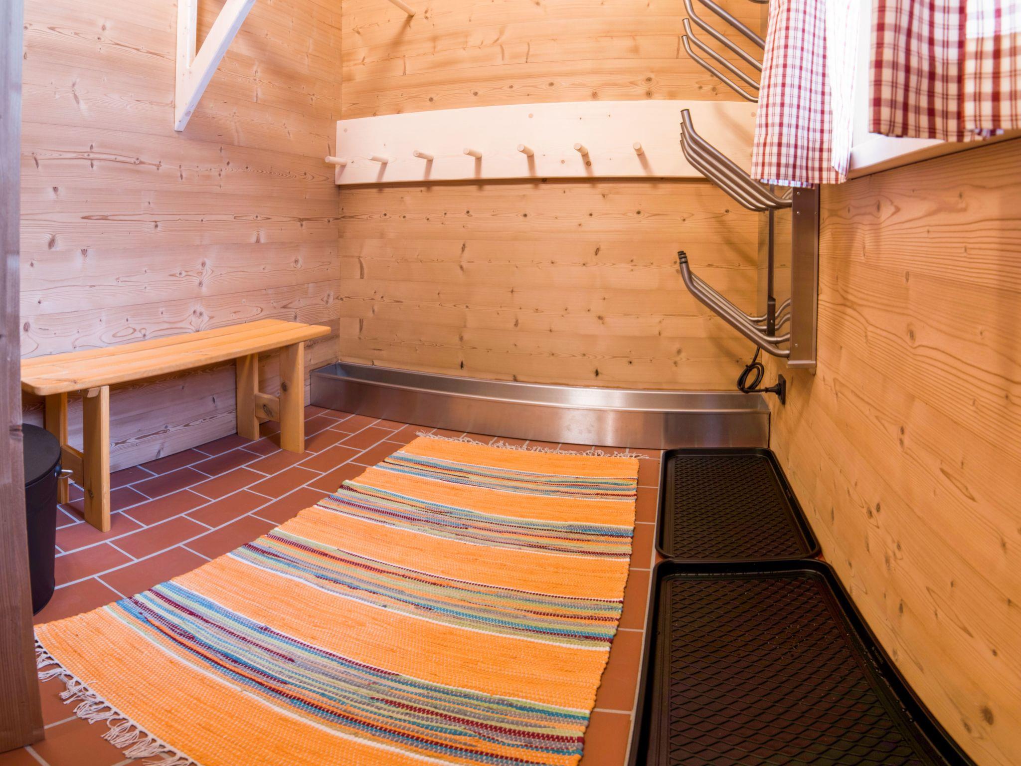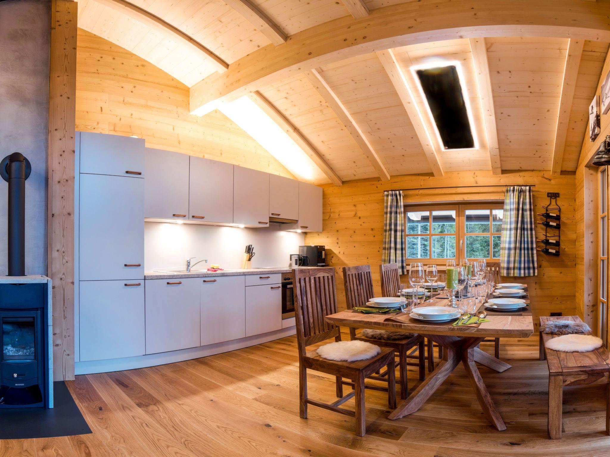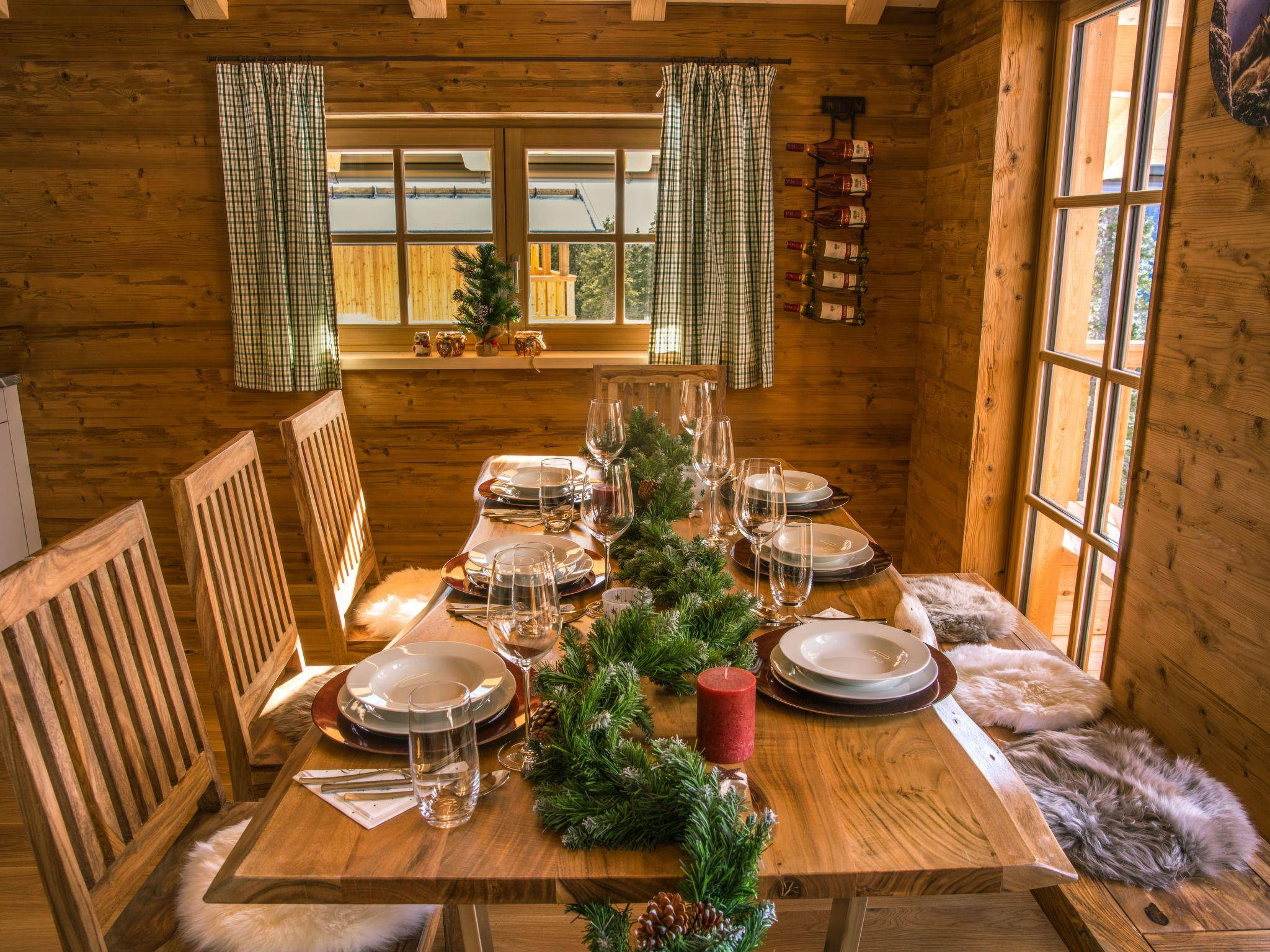 Our hunting lodge has a spacious living/dining area with panoramic windows overlooking the surrounding mountains, a fully equipped kitchen, a wood-burning stove for cosy warmth, four double bedrooms with satellite TV and their own small bathroom, some with a small terrace, a sauna and a ski and drying room. bed linen and towels are provided. Bathrobes can be booked for a fee.