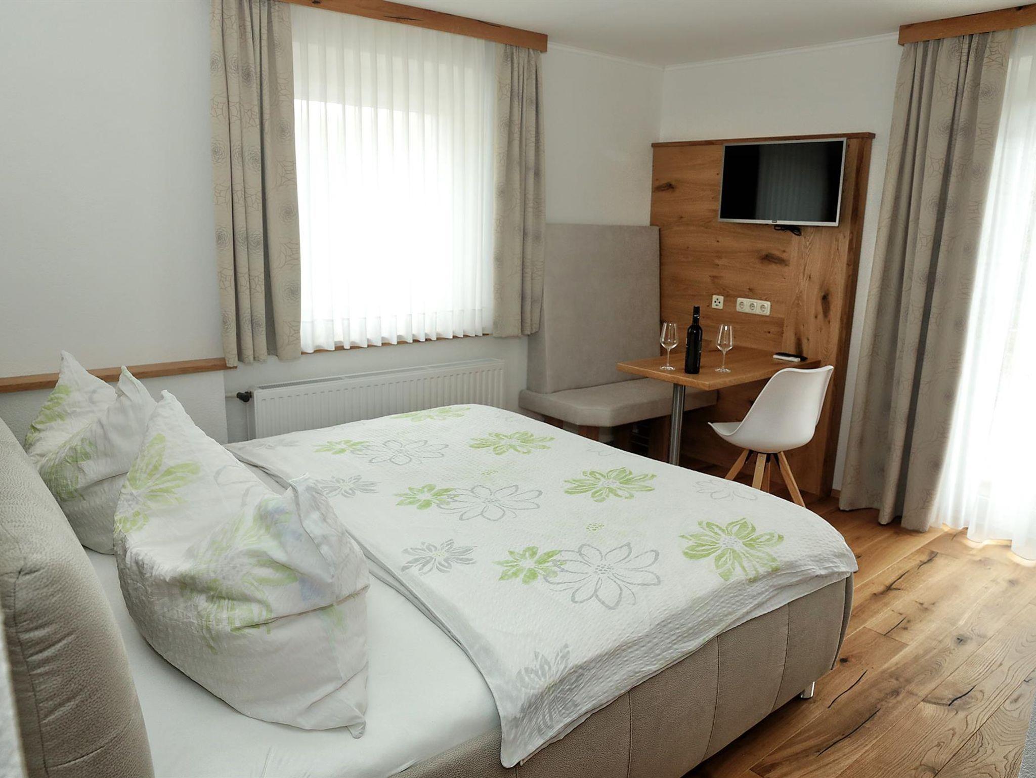 Zwei Doppelzimmer mit Verbindungstüre. In der Mitte befindet sich die Dusche mit WC. Beide Zimmer haben Balkon, sowie Fernseher, einen Kühlschrank. Die Zimmer sind südseitig ausgerichtet mit Sicht auf den Karawanken.