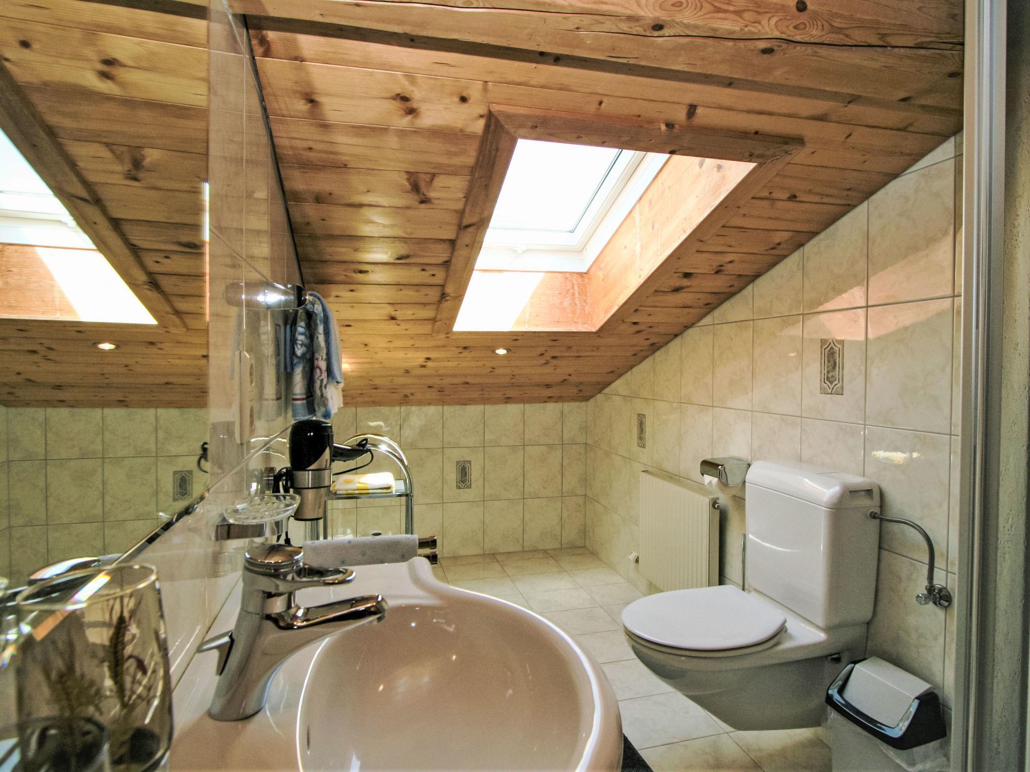 5-room apartment 150 m2. Spacious, partly with sloping ceilings, cosy furnishings: 3 double bedrooms, each room with hand-basin. Exit to the balcony. Kitchen-/living room (oven, dishwasher, 4 ceramic glass hob hotplates, electric coffee machine) with dining nook and satellite TV. Exit to the balcony. Shower, sep. WC. Top floor: living room with sloping ceilings, ceiling height 120 - 240 cm with satellite TV (flat screen). With sloping ceilings, 1 room with 1 double bed (2 x 80 cm, length 200 cm). Shower/WC. Large balcony 20 m2. Balcony furniture. Very beautiful panoramic view of the mountains and the countryside. Facilities: Internet (WiFi, free). Parking. Please note: non-smoking house. Private entrance, smoke alarm.