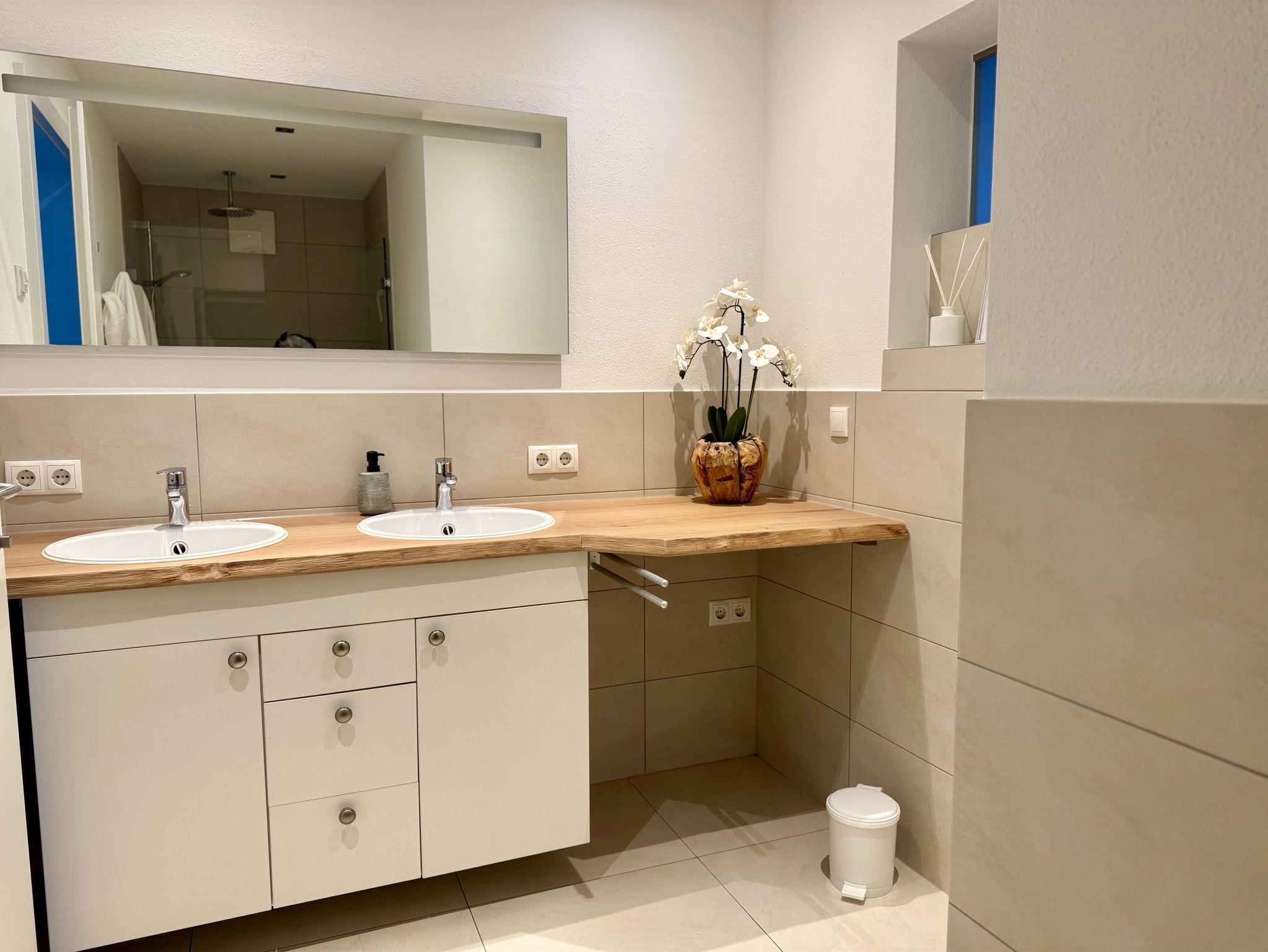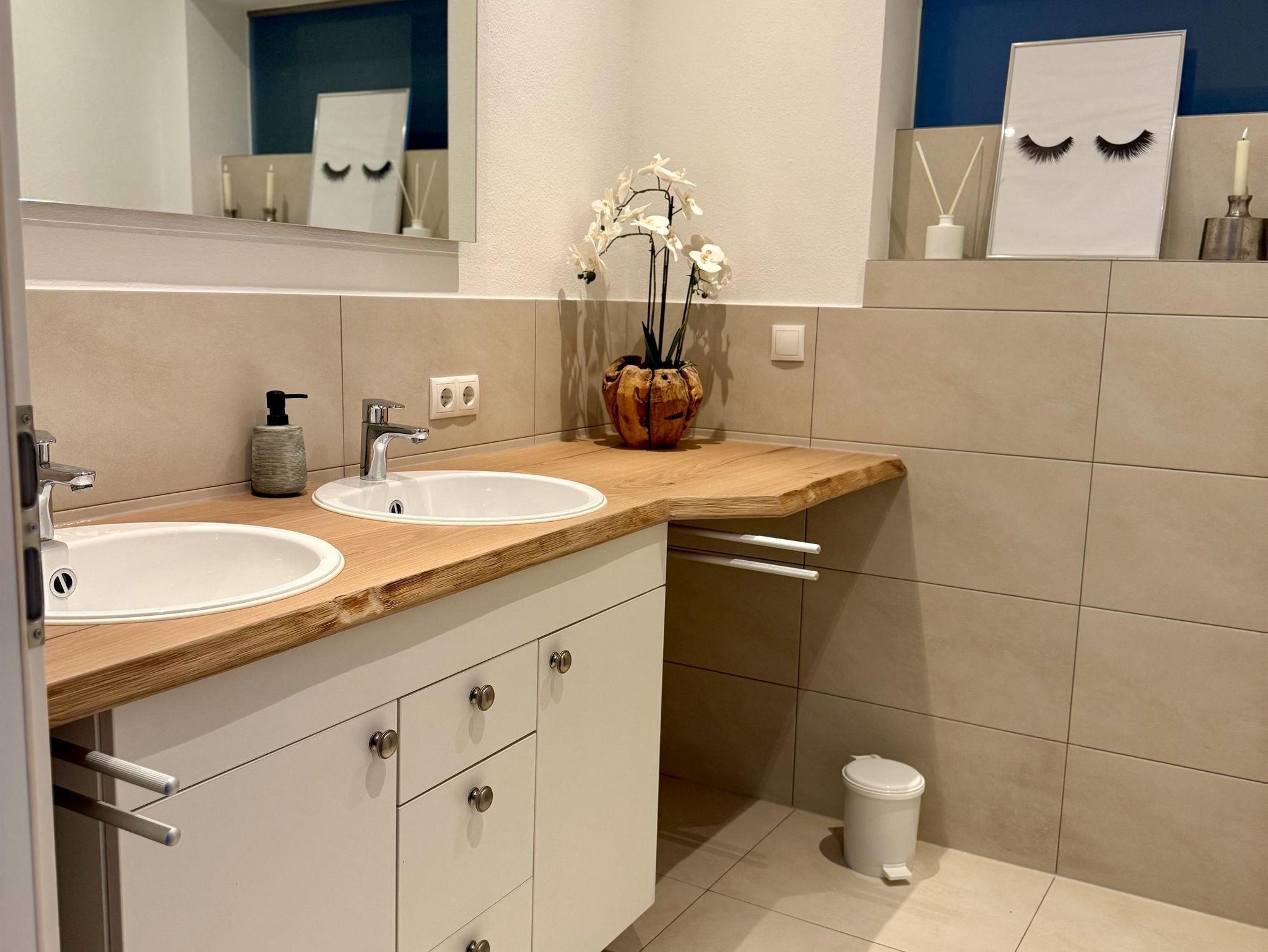Die Wohnung bietet zwei komfortable Schlafzimmer, zwei Bäder und eine großzügige, voll ausgestattete Wohnküche.