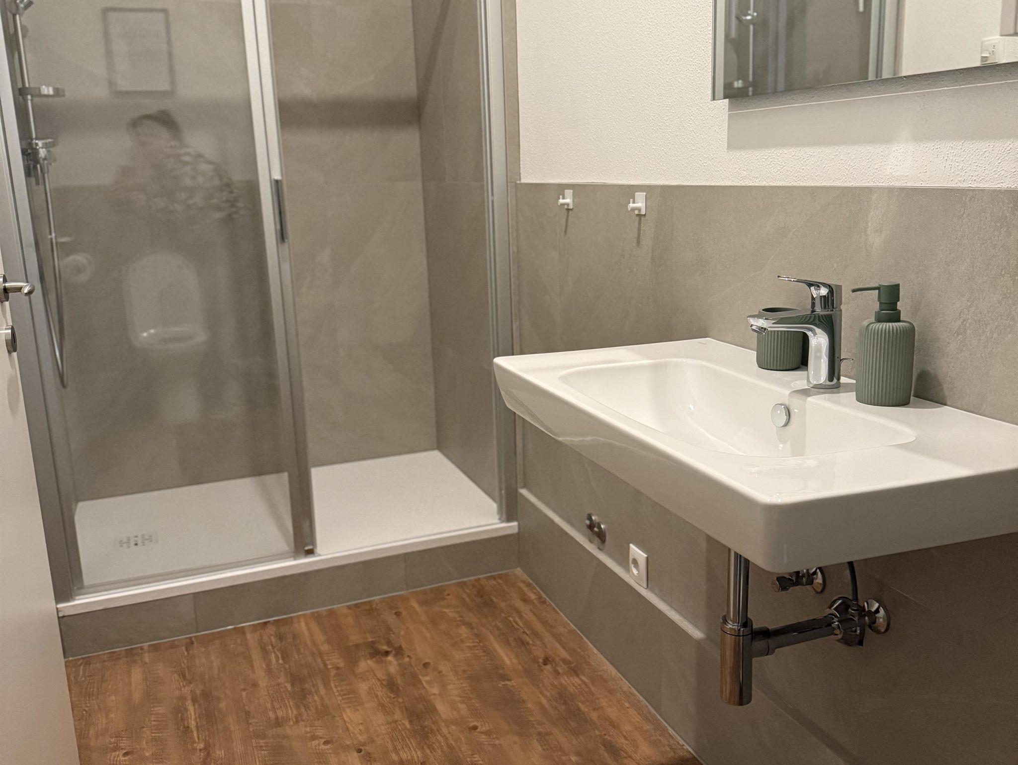 2 Schlafzimmer, 2 Bäder mit Dusche und WC, Wohnzimmer mit Schlafcouch, Wohnküche, Vorraum (Garderobe), Abstellraum, Terrasse, Garten, Carport für 2 Auto + Parkplatz