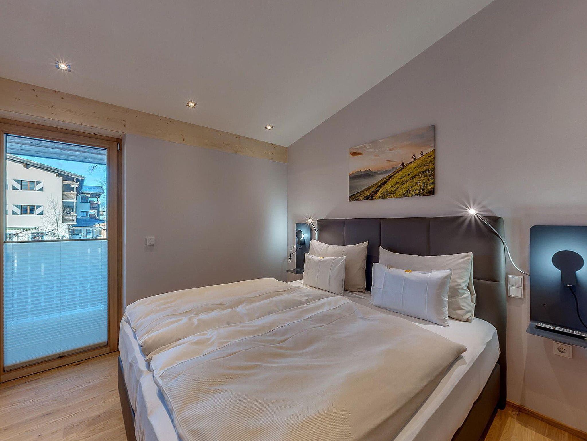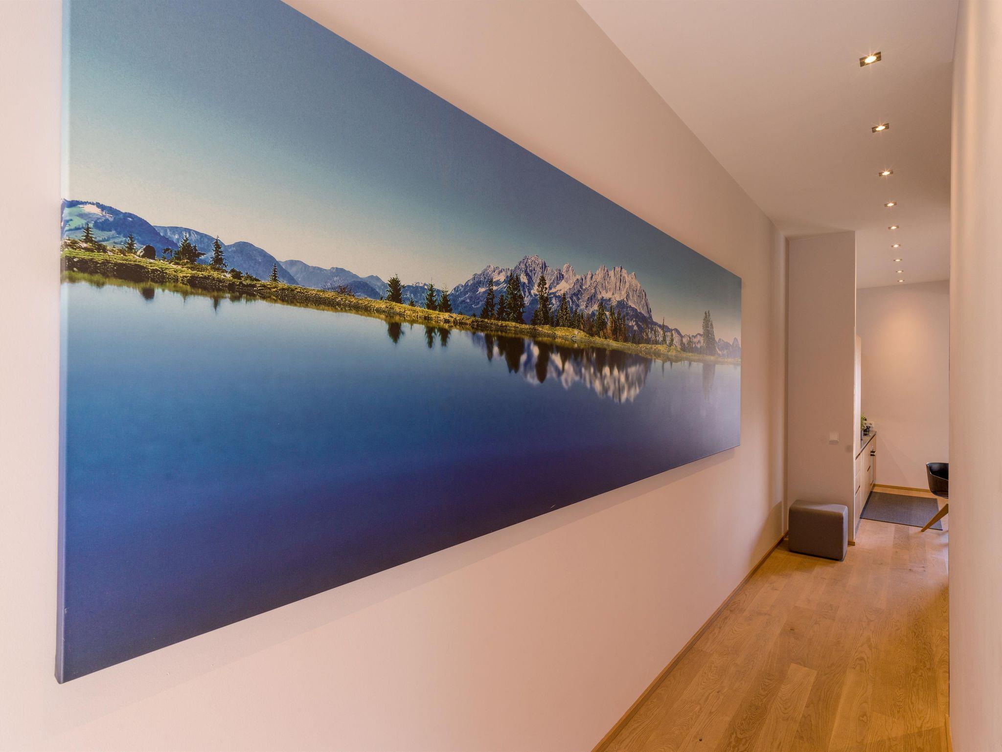 Die Natur Suiten im 1. OG haben 65 qm. Sie bieten 2 Schlafzimmer mit Boxspringbetten und HD-TV, Fliegengitter und Verdunkelung. Die 2 Bäder haben eine Regendusche, WC, Fön und Kosmetikspiegel. Das Wohnzimmer hat ein qualitativ-hochwertiges Schlaf-Sofa und HD-TV, sowie Raffstores. Die Küche ist ausgestattet mit Backofen, Kühlschrank mit Tiefkühlfach, Geschirrspüler, Mikrowelle, Nespresso Kaffeemaschine. Die Balkon-Terrasse mit Lounge Möbel hat einen wunderschönem Blick auf den Wilden Kaiser.