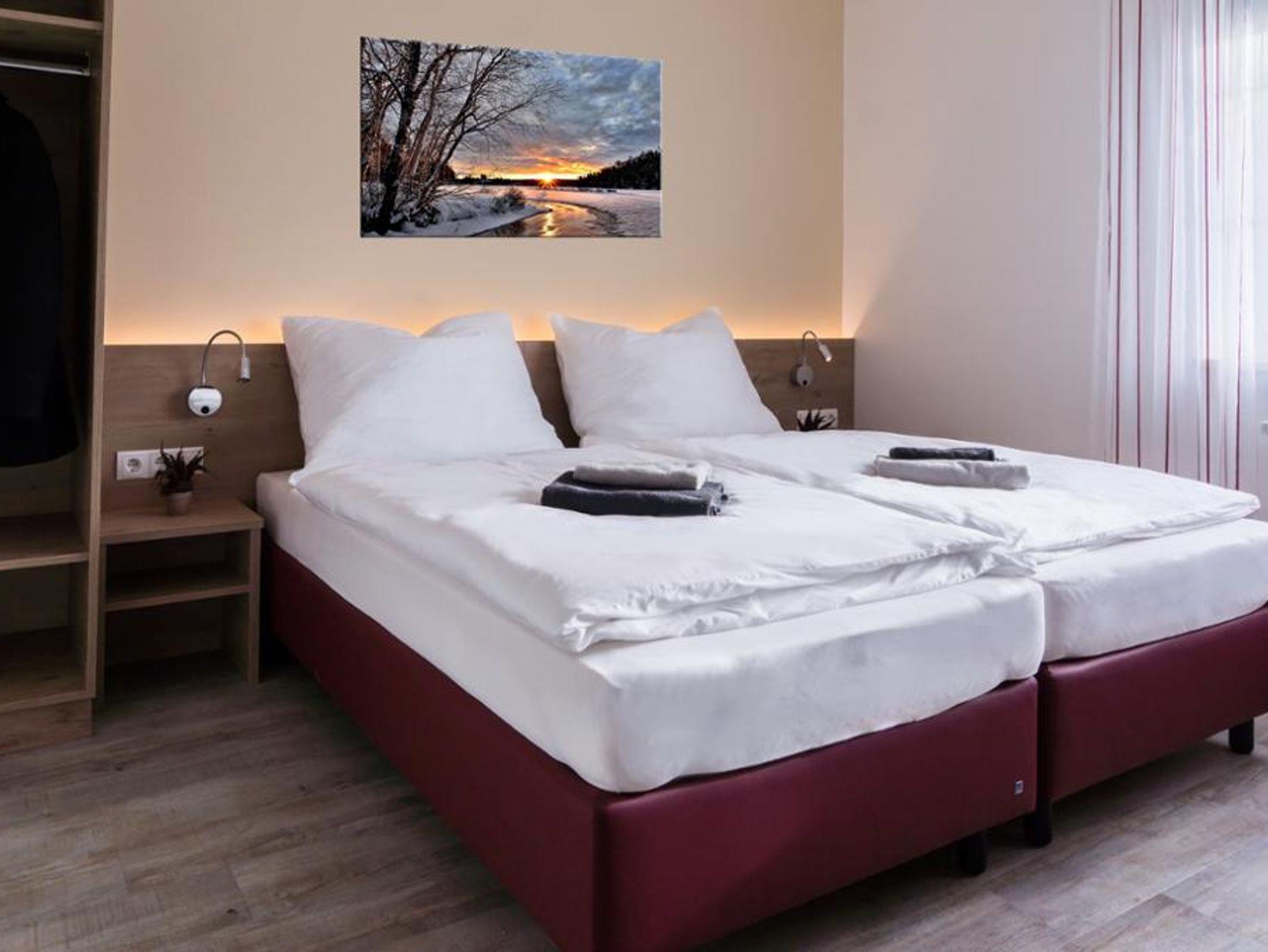 Unser komfortables Familienzimmer besteht aus einem Doppelbett und einem ausziehbaren Sofa, auf dem bequem zwei weitere Personen übernachten können.