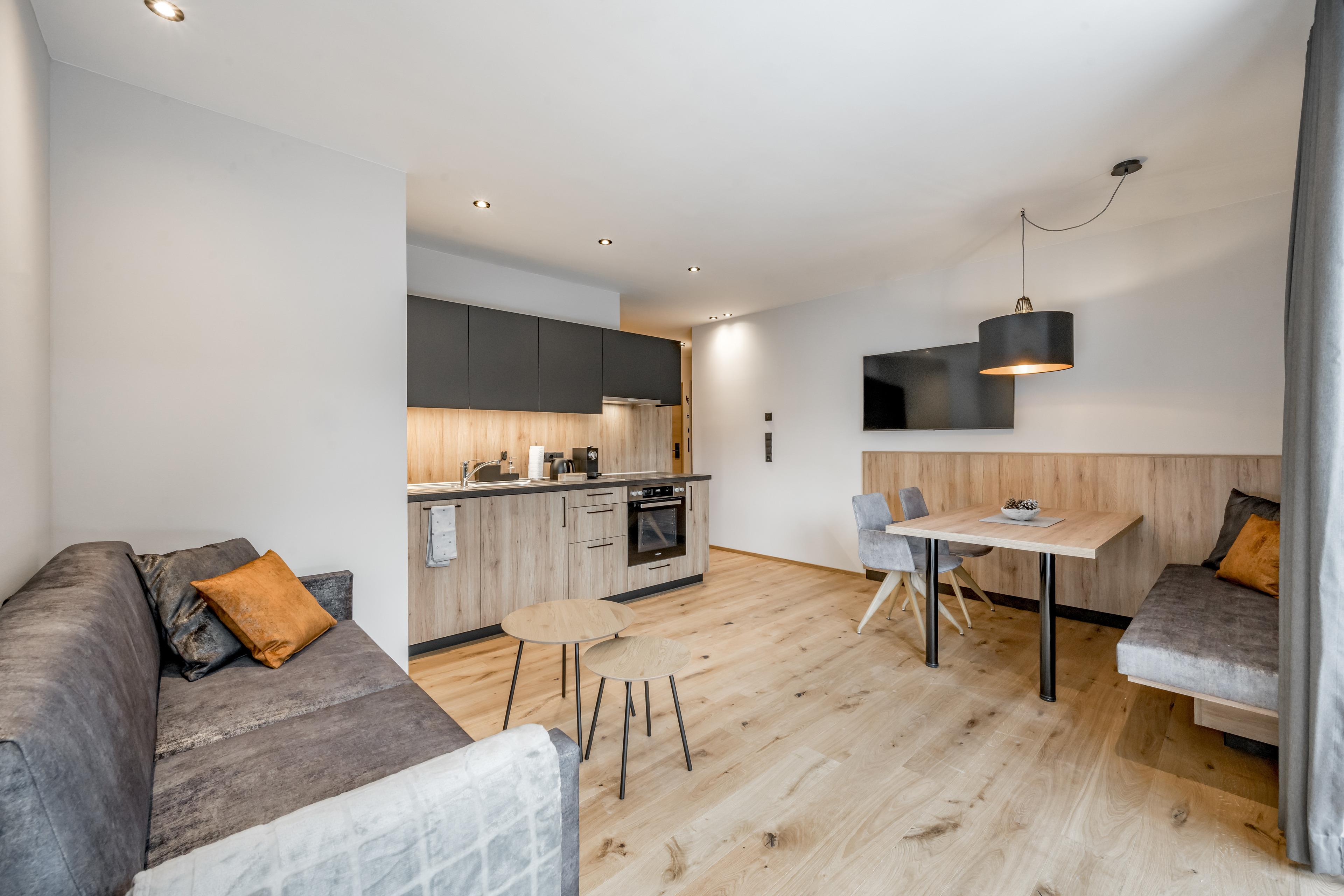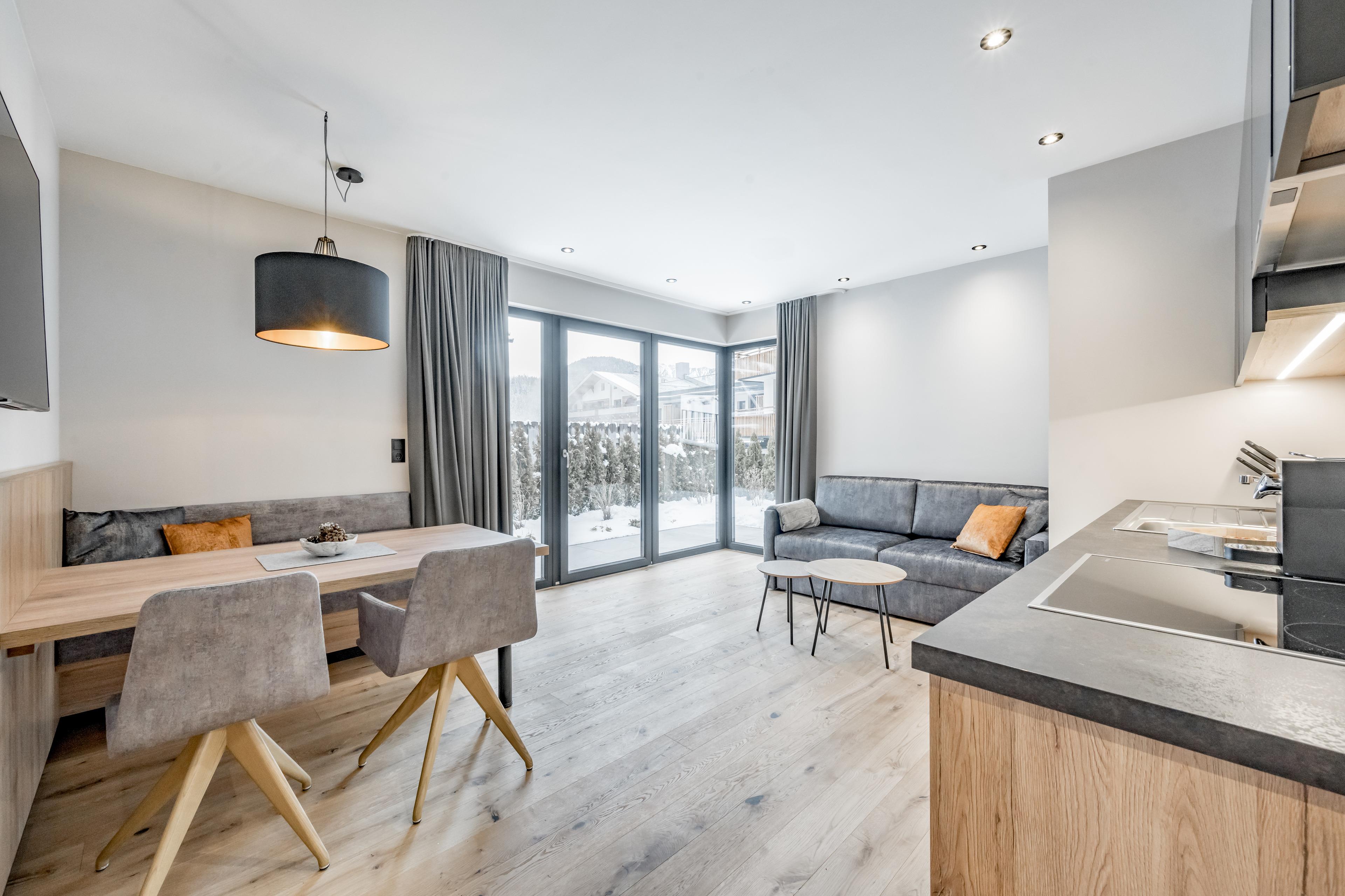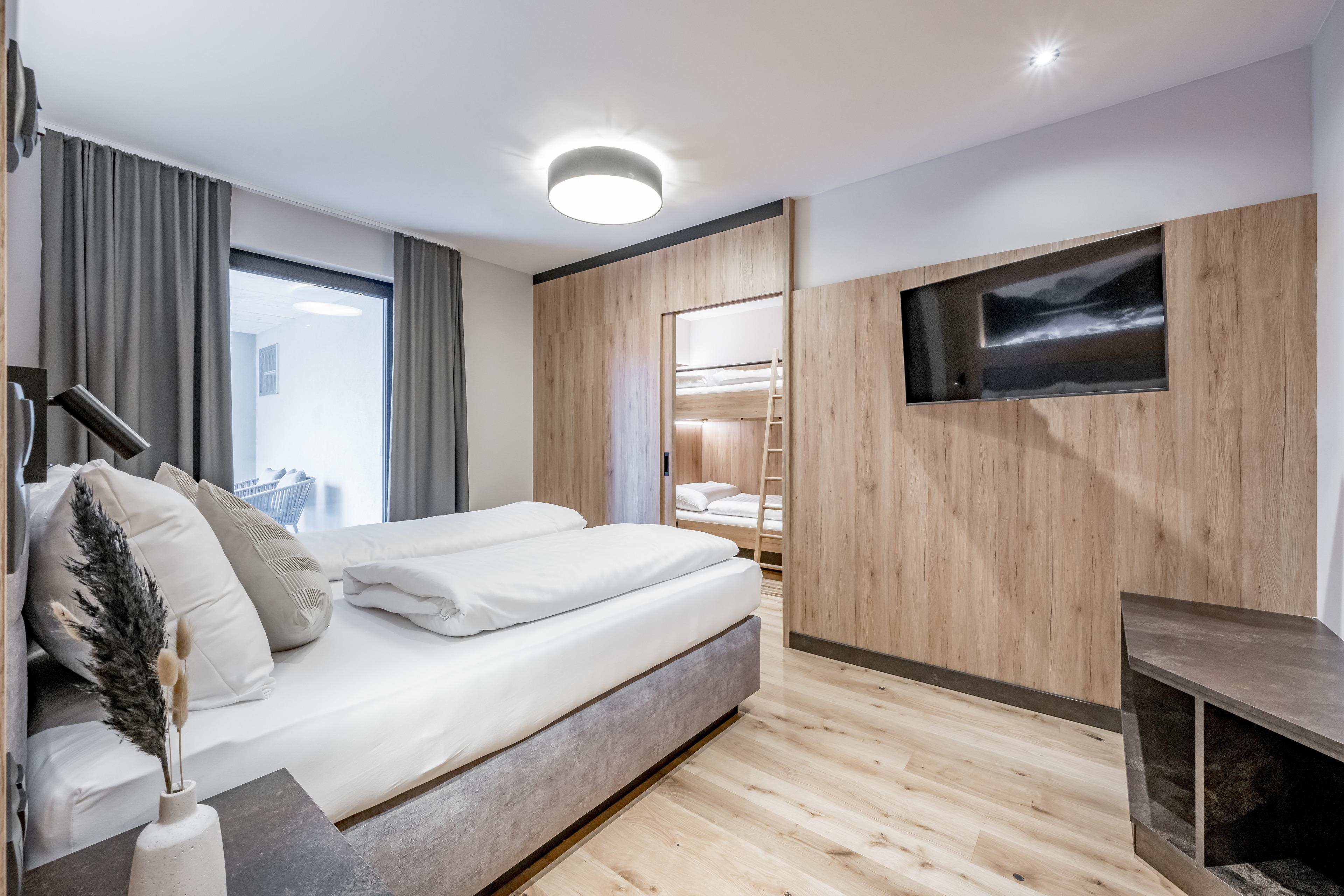 Apartment ? ONE im Erdgeschoß mit 30 m2 großer, nach Westen ausgerichteter, teilweise überdachter Terrasse für spektakuläre Sonnenuntergänge. Mit großzügigem, offenen Wohn-Ess-Kochbereich mit voll ausgestatteter Küche und Ausziehcouch, einem Schlafzimmer mit Doppel-Boxspringbett und integriertem, durch Schiebetür abgetrenntem Schlafraum für zwei Kinder (Stockbett). Dazu ein modernes Badezimmer mit Dusche & WC.