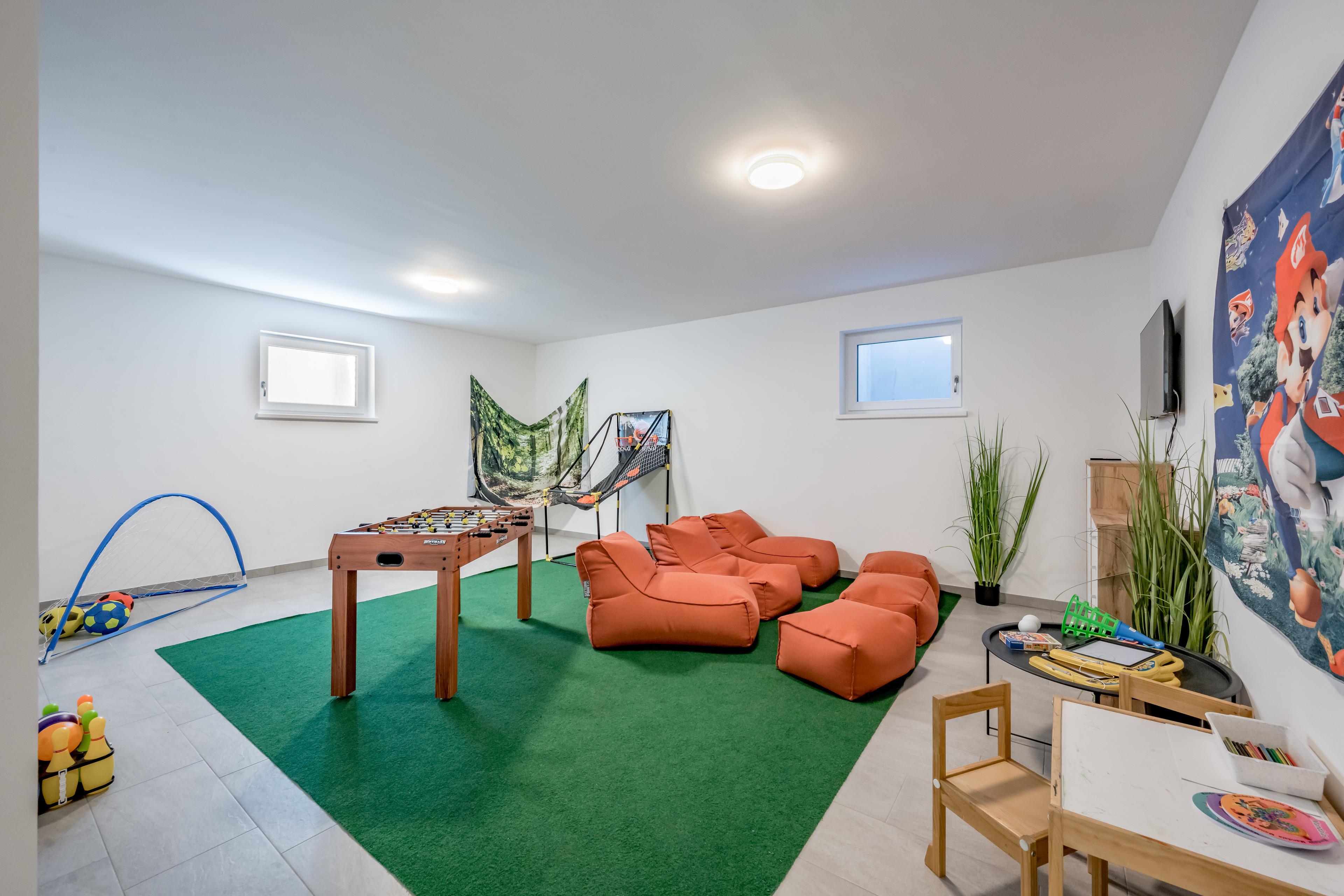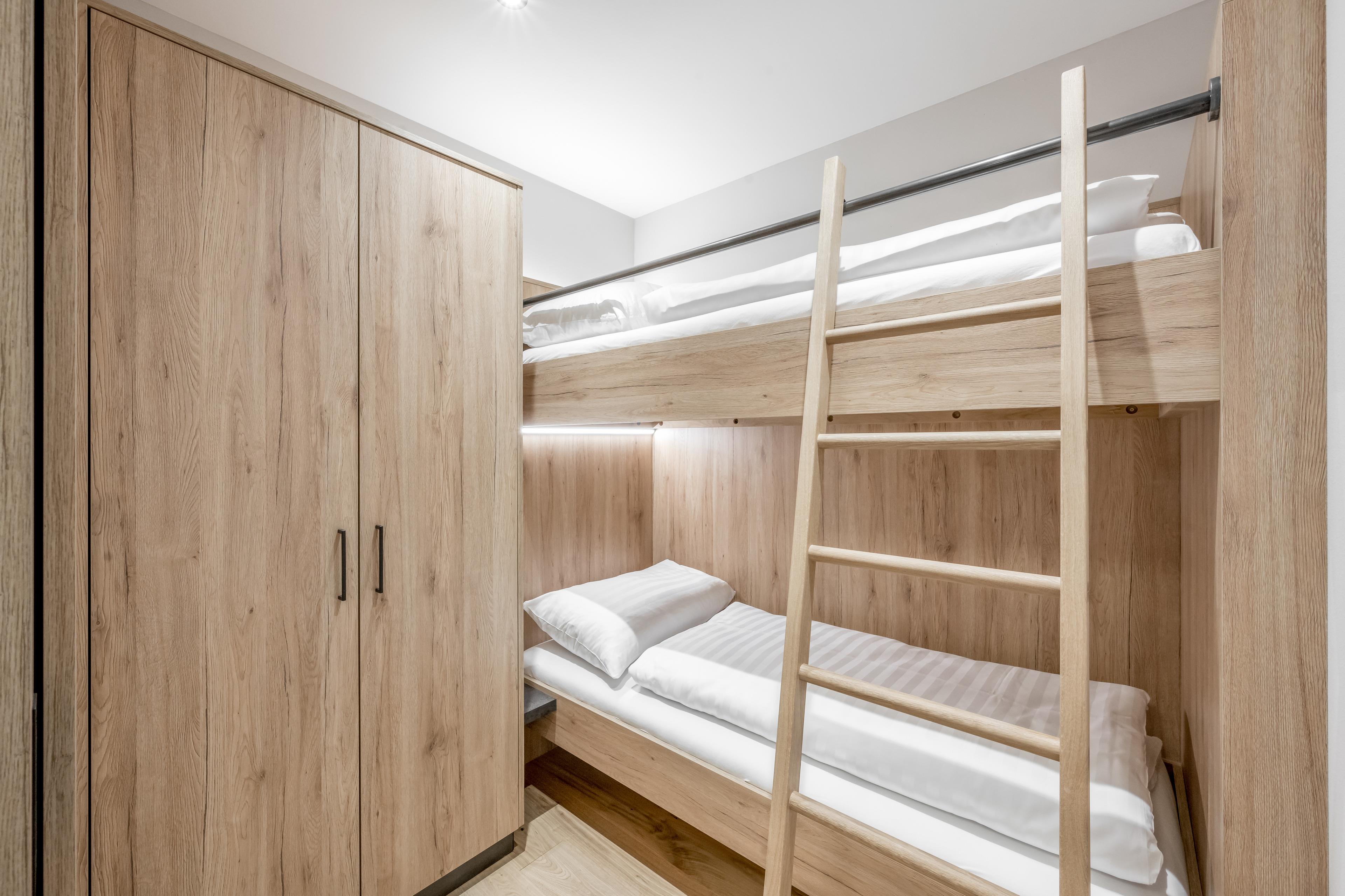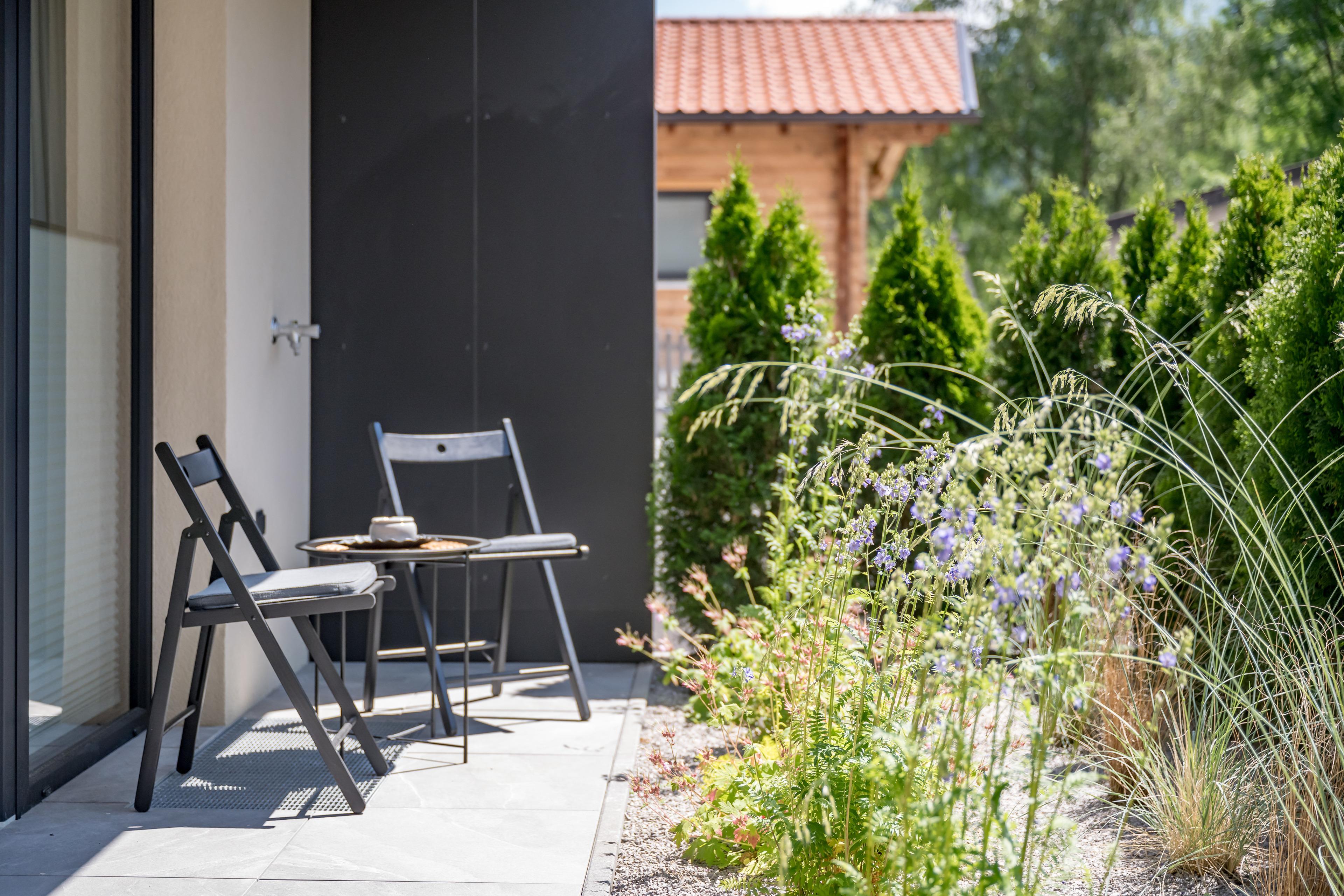 Apartment ? ONE im Erdgeschoß mit 30 m2 großer, nach Westen ausgerichteter, teilweise überdachter Terrasse für spektakuläre Sonnenuntergänge. Mit großzügigem, offenen Wohn-Ess-Kochbereich mit voll ausgestatteter Küche und Ausziehcouch, einem Schlafzimmer mit Doppel-Boxspringbett und integriertem, durch Schiebetür abgetrenntem Schlafraum für zwei Kinder (Stockbett). Dazu ein modernes Badezimmer mit Dusche & WC.