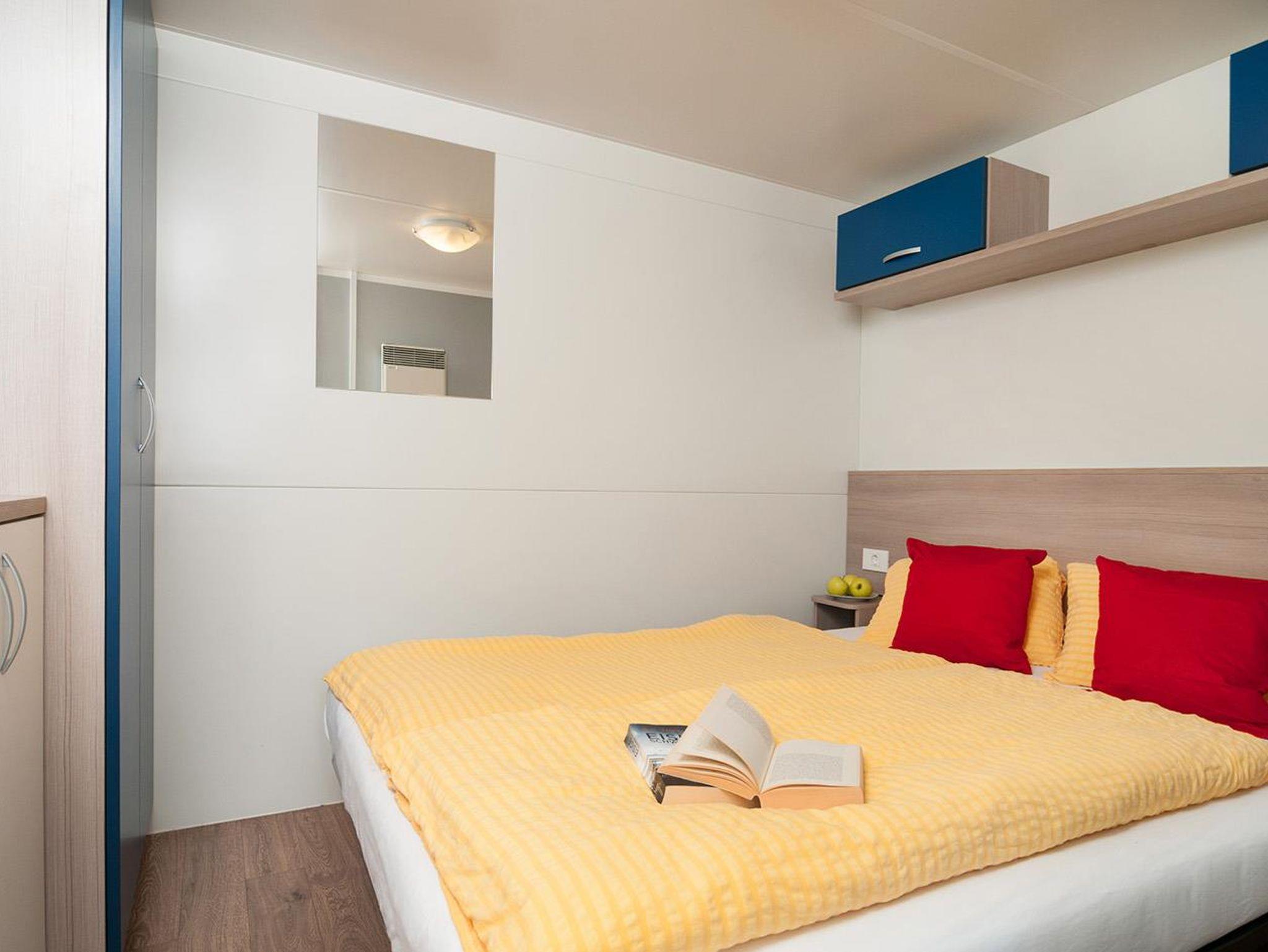 Ausstattung der Mobil Heime: Ein Schlafzimmer mit Ehebett. Ein separates Schlafzimmer für 2 bis 3 Kinder (Personen). Badezimmer mit Dusche und Waschbecken. WC. Im Wohnzimmer ausziehbares Doppelbett für 2 weitere Personen Maximalbelegung 6 - 7 Personen, je nach Typ. Mikrowelle, Gasherd, Kühlschrank, Dunstabzug, Abwasch, Geschirrspüler, Sitzecke, Klimaanlage, TV, Überdachte Terrasse mit Tisch und Stühle. Inkl. Bettwäsche, Geschirr und Porzellan. Wellness Eintritt, Liegestüle und WLan inklusive