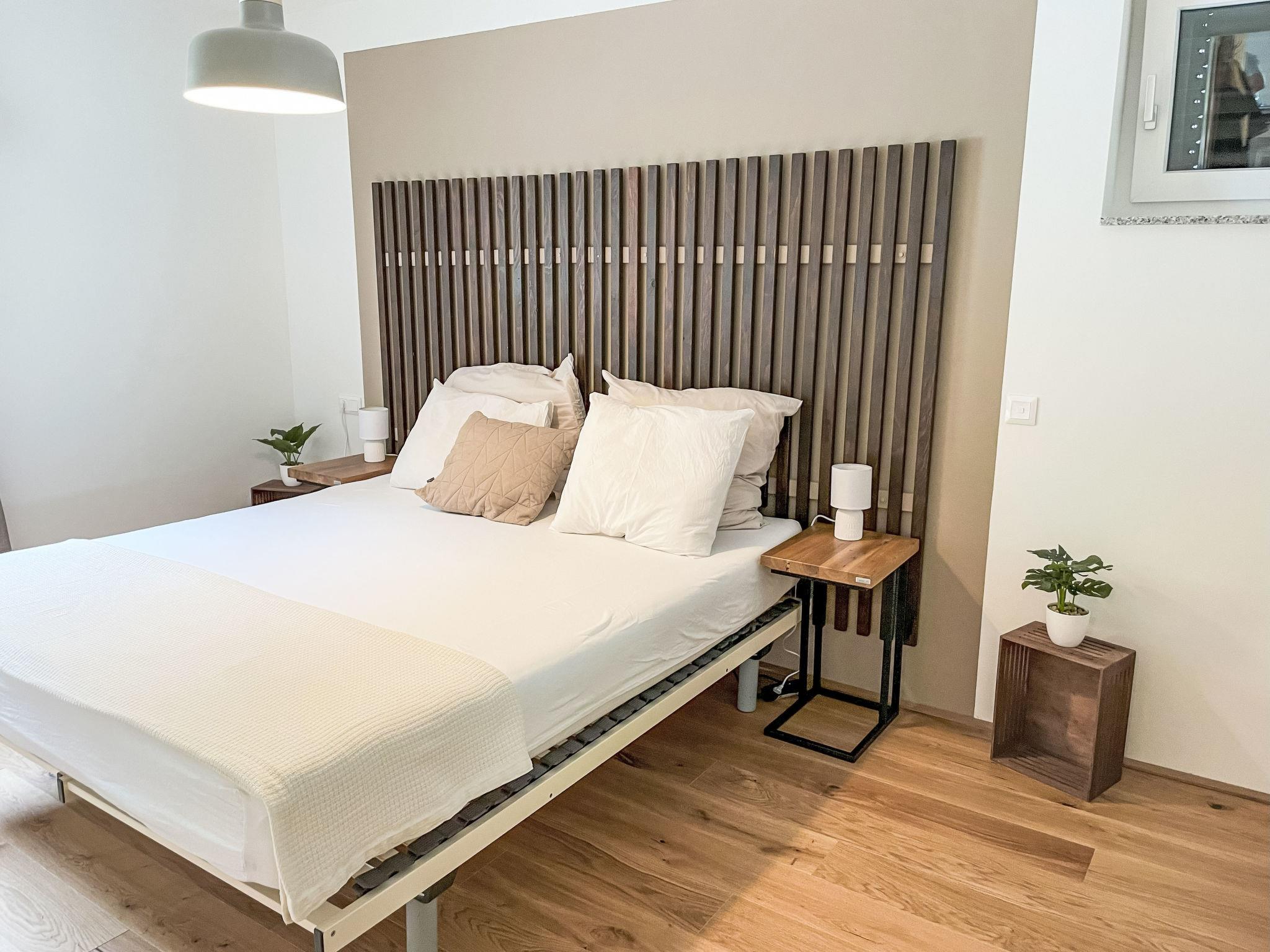 "Edelbach Deluxe 1", 3-room apartment 75 m2 on 2nd floor. Object suitable for 4 adults + 1 child. Modern and cosy furnishings: living/sleeping room with 1 sofabed (160 cm, length 200 cm), TV (flat screen). 1 room with 2 beds (90 cm, length 200 cm). 1 double bedroom with 1 double bed (180 cm, length 210 cm). Open kitchen (oven, dishwasher, 4 ceramic glass hob hotplates, toaster, kettle, microwave, electric coffee machine) with dining table. Sep. WC, bath/shower/WC. Heating. Balcony. Balcony furniture. Side view of the lake. Facilities: children's high chair, baby cot. Internet (WiFi, free). Please note: non-smokers only. Smoke alarm.