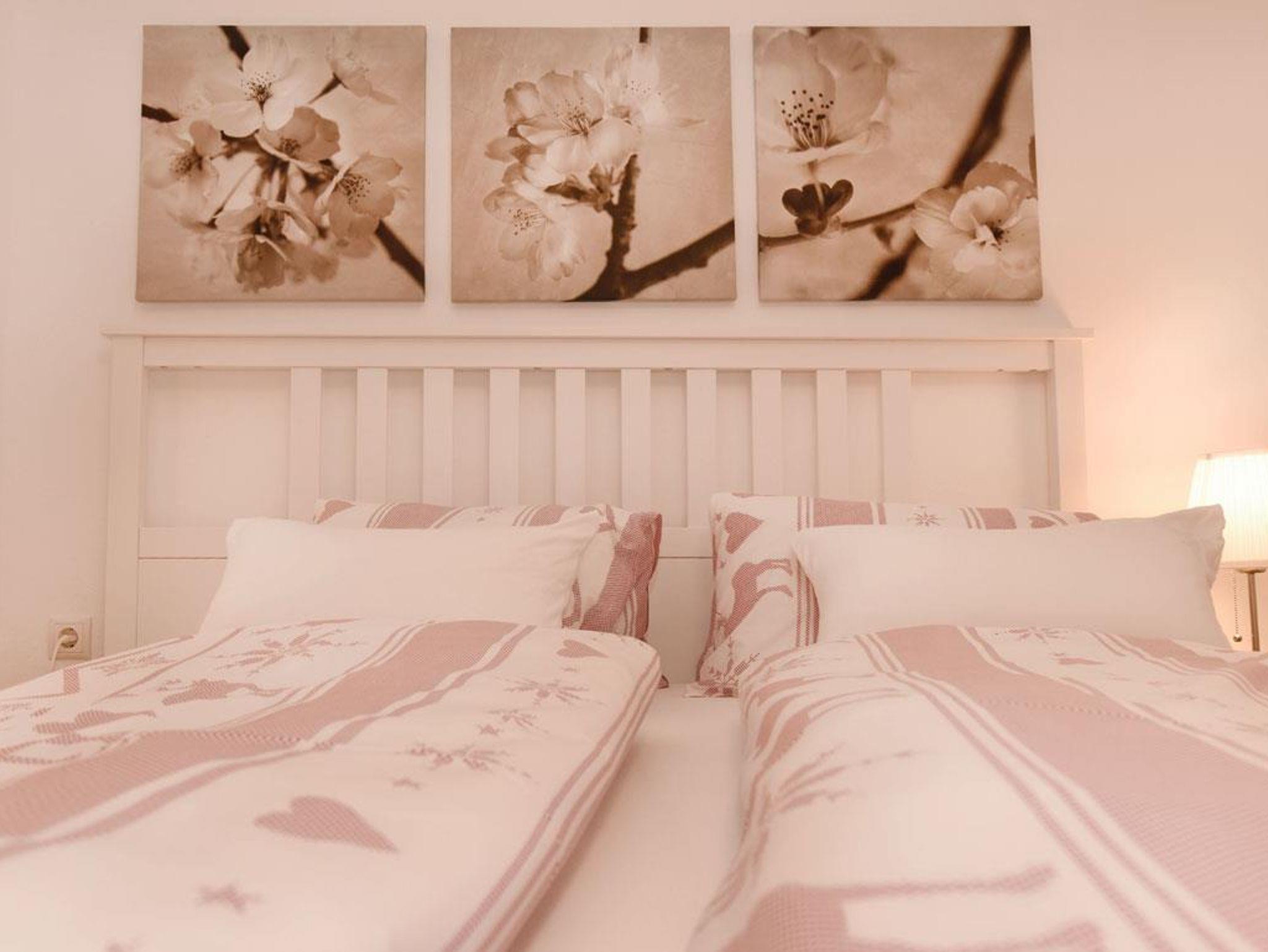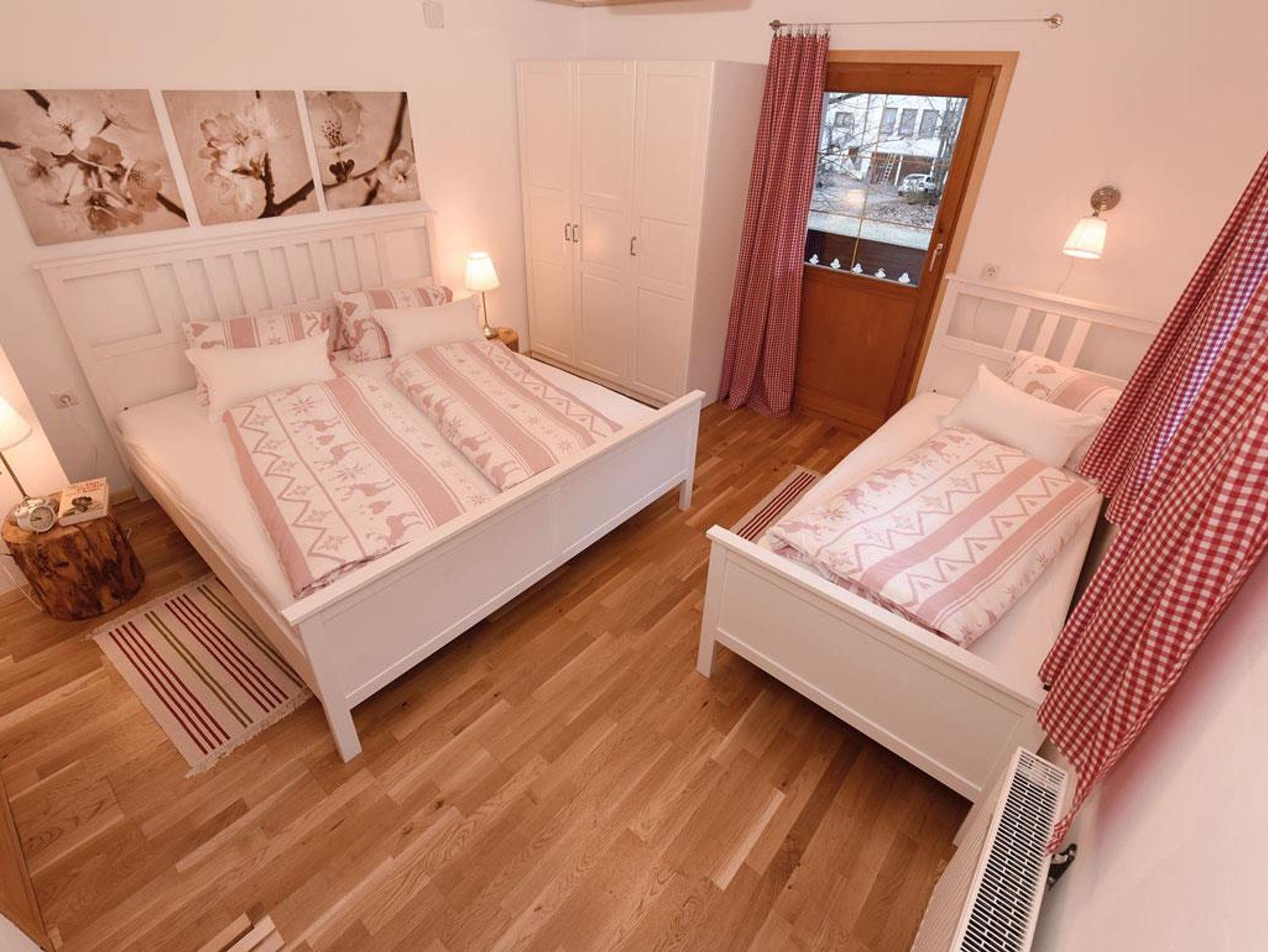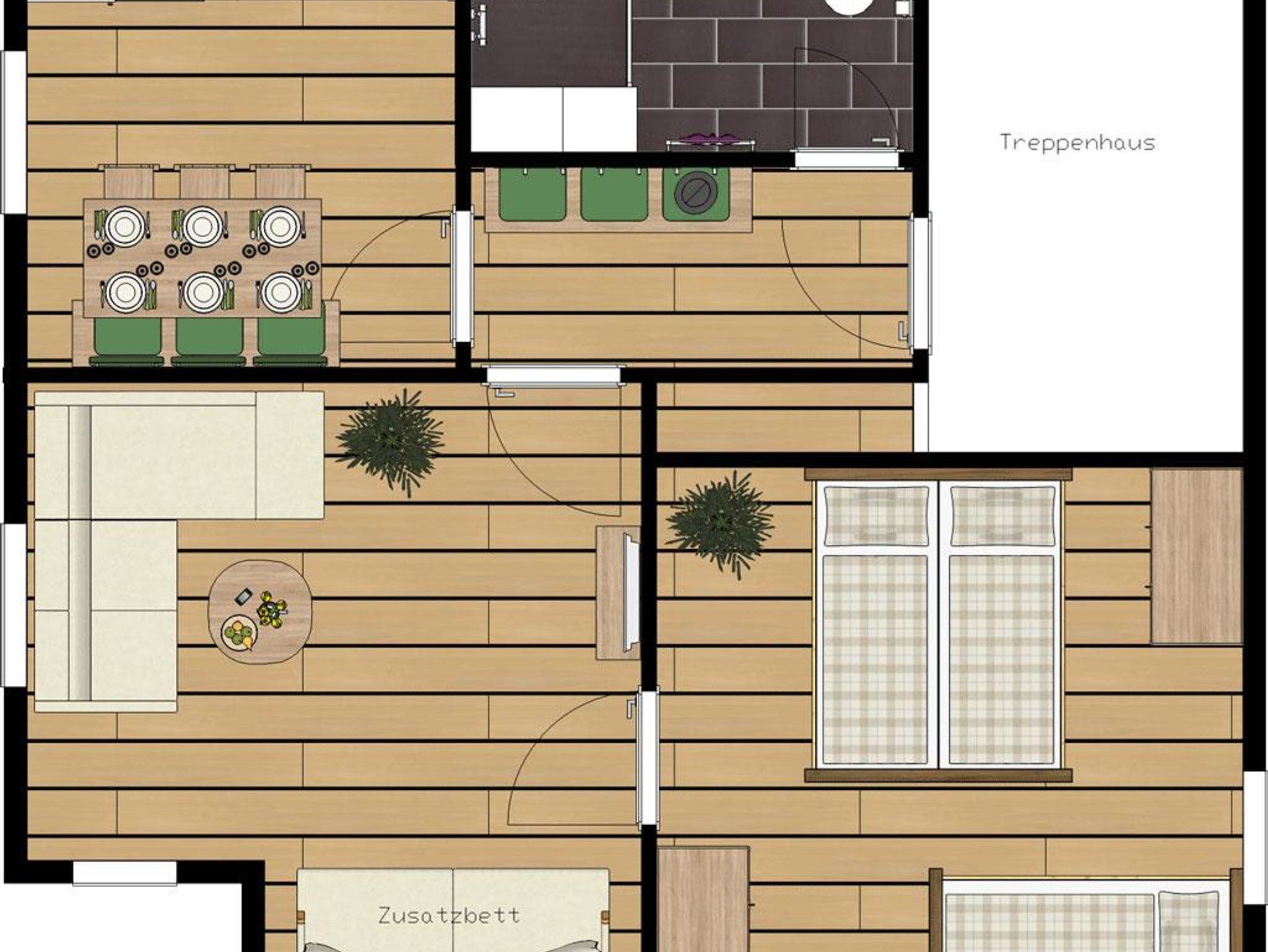 Ferienwohnung im OG, 1 Schlafzimmer mit 1 Doppel- und 1 Einzelbett, Wohnzimmer 1 Tagesbett 180 cm breit, Küche komplett ausgestattet, großzügiger Essplatz. Dusche und WC, Vorraum, Abstellraum.