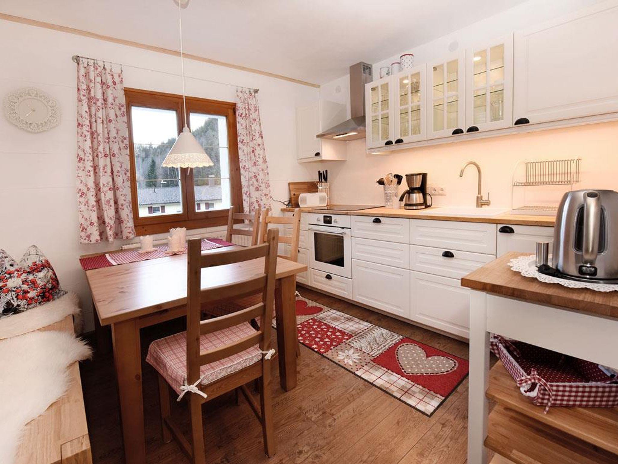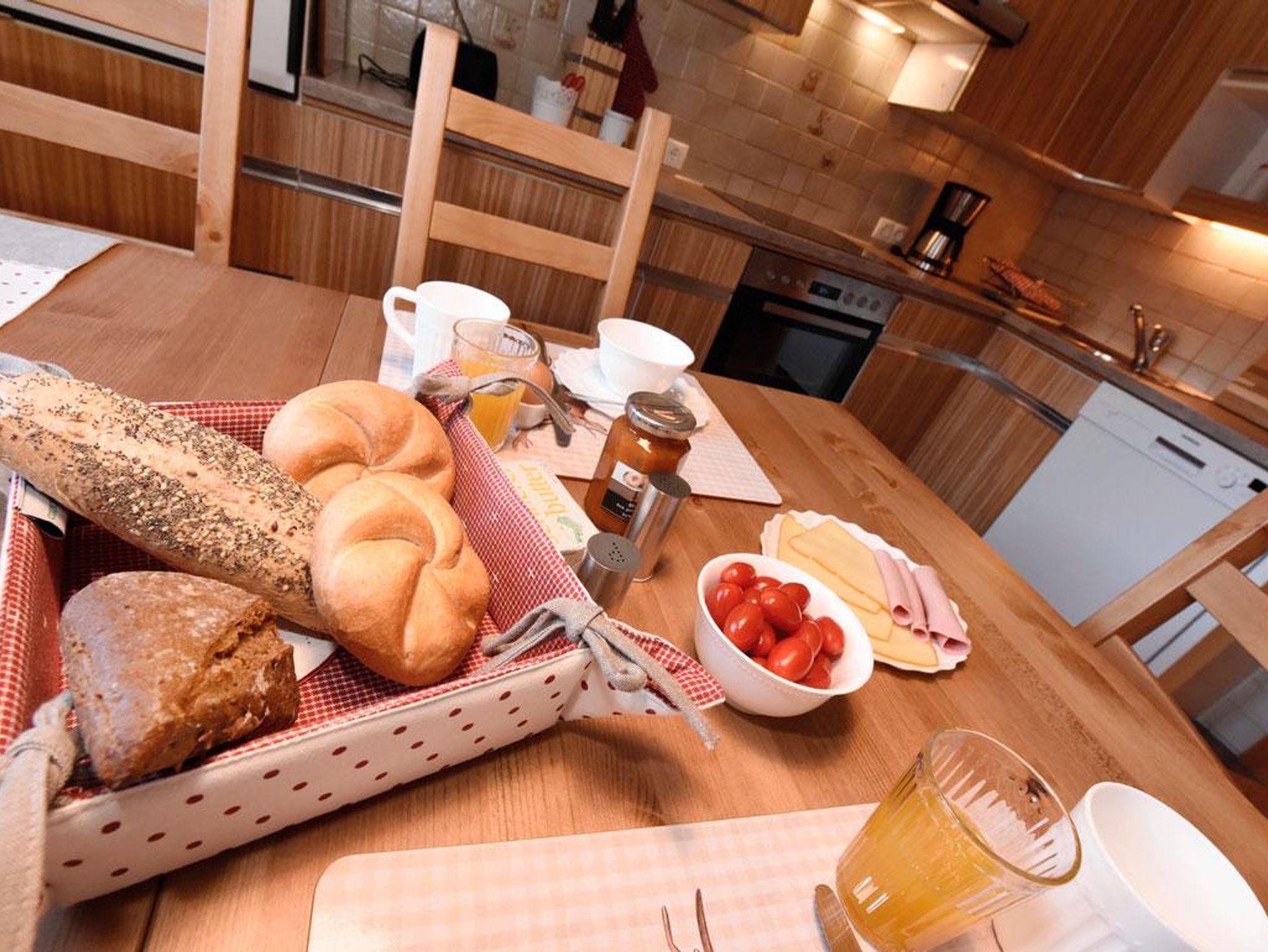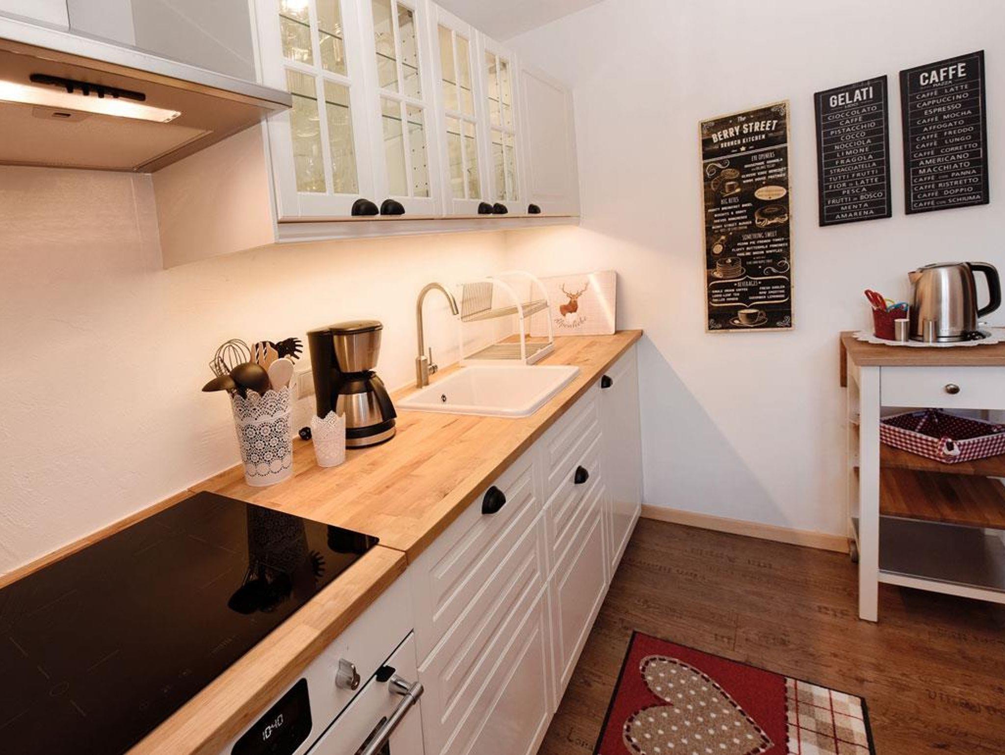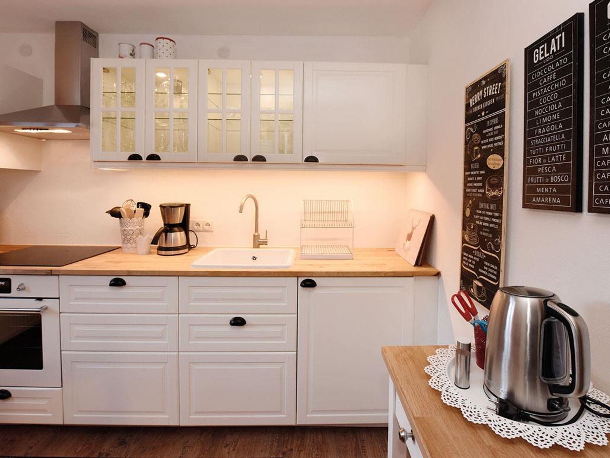 Ferienwohnung im OG, 1 Schlafzimmer mit 1 Doppel- und 1 Einzelbett, Wohnzimmer 1 Tagesbett 180 cm breit, Küche komplett ausgestattet, großzügiger Essplatz. Dusche und WC, Vorraum, Abstellraum.