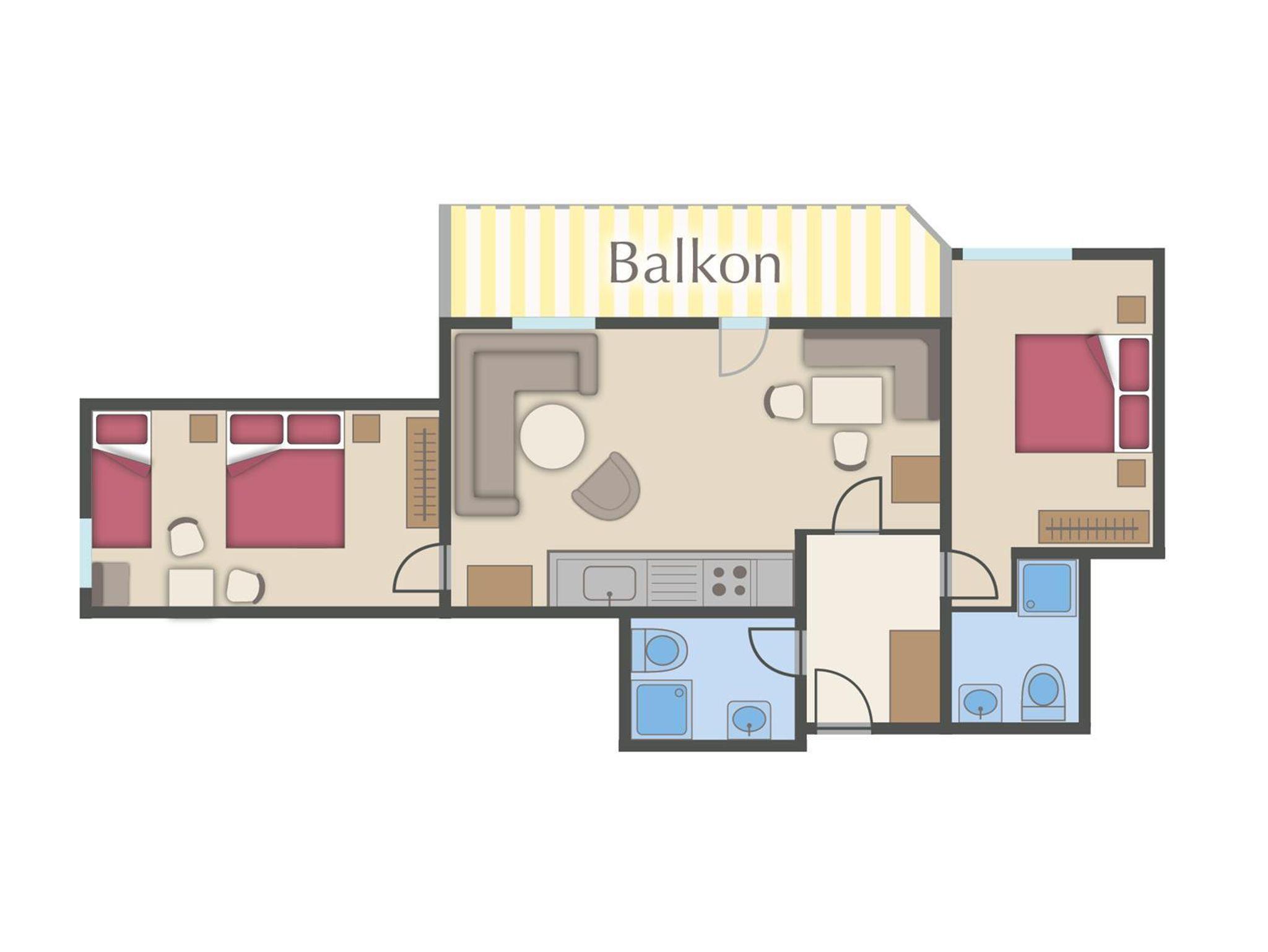 Ein Schlafzimmer mit Doppelbett, ein Schlafzimmer mit Einzelbett, zwei Badezimmer mit WC, Vorraum, Wohnraum mit ausziehbarer Doppelcouch und Balkon. Genießen Sie dazu noch den unvergleichlich schönen Blick auf die umliegenden Berge mit Zwölferkopf und Karwendel-Bergbahn.