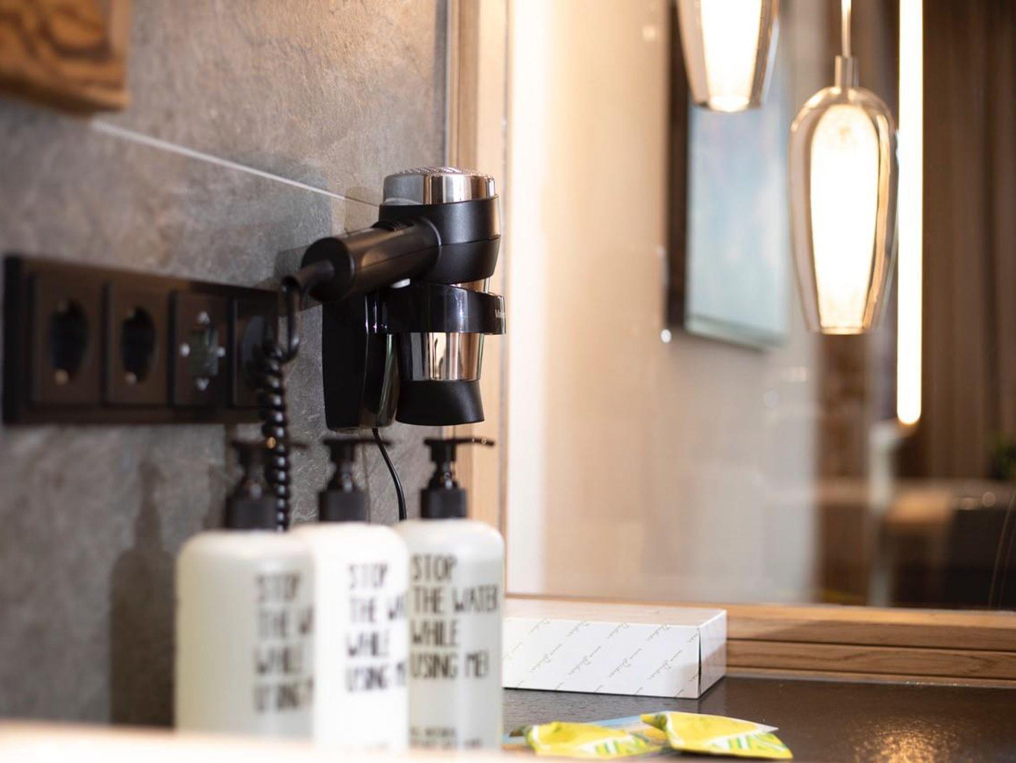 Bad mit begehbarer Dusche, Handtuchtrockner, Kosmetikspiegel, Fön, WC, flauschige