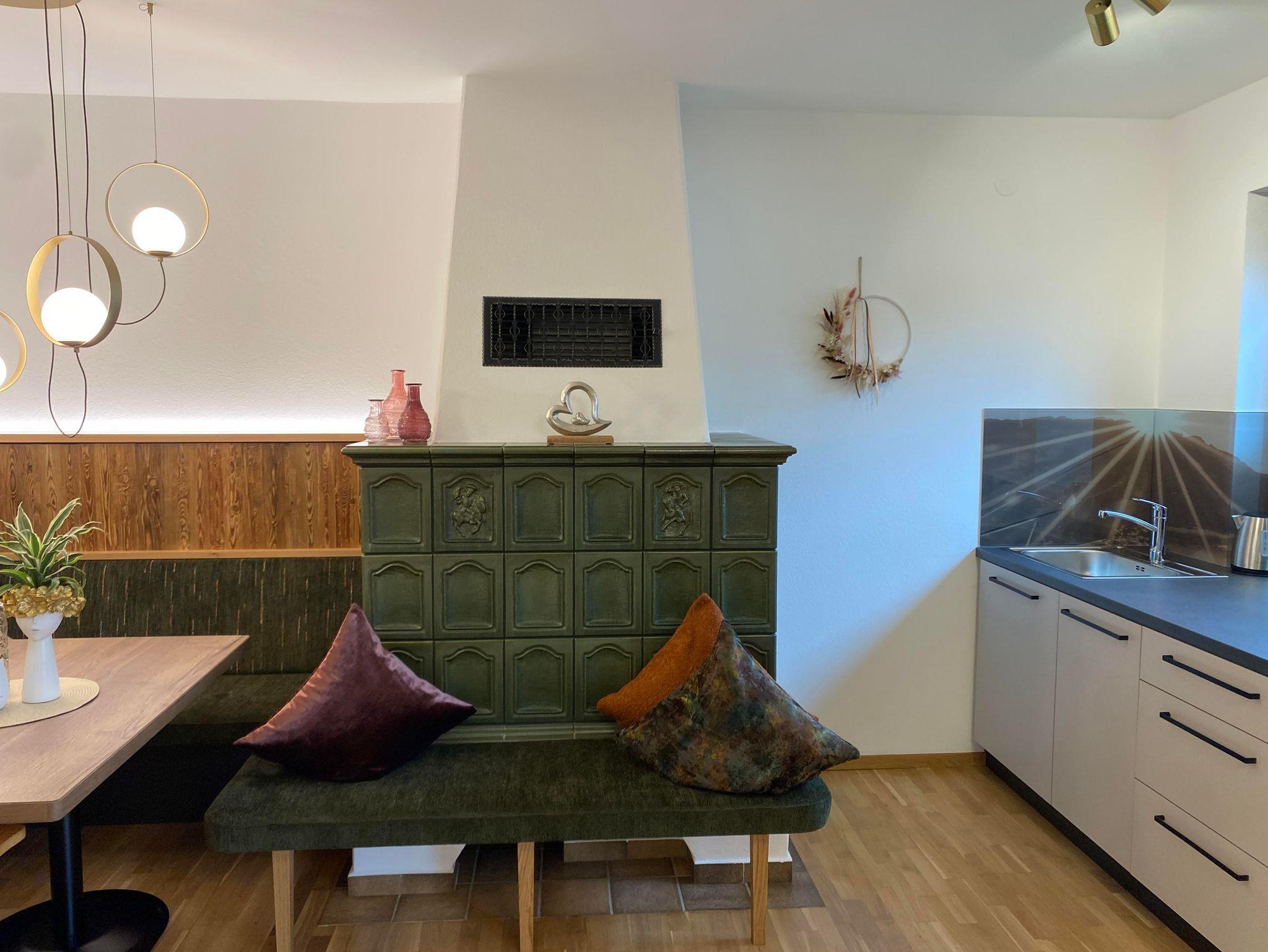 Hell. Sonnig. Familiär. Ferienwohnung 65m² für 2-5 Personen. 2 Schlafzimmer, gemütlicher Wohnraum mit Kachelofen, Sitzgarnitur, komplett ausgestattete Küche mit Essecke. Bad mit Dusche, separates WC. Herrlicher Panorama-Südbalkon (Sonnenseite).