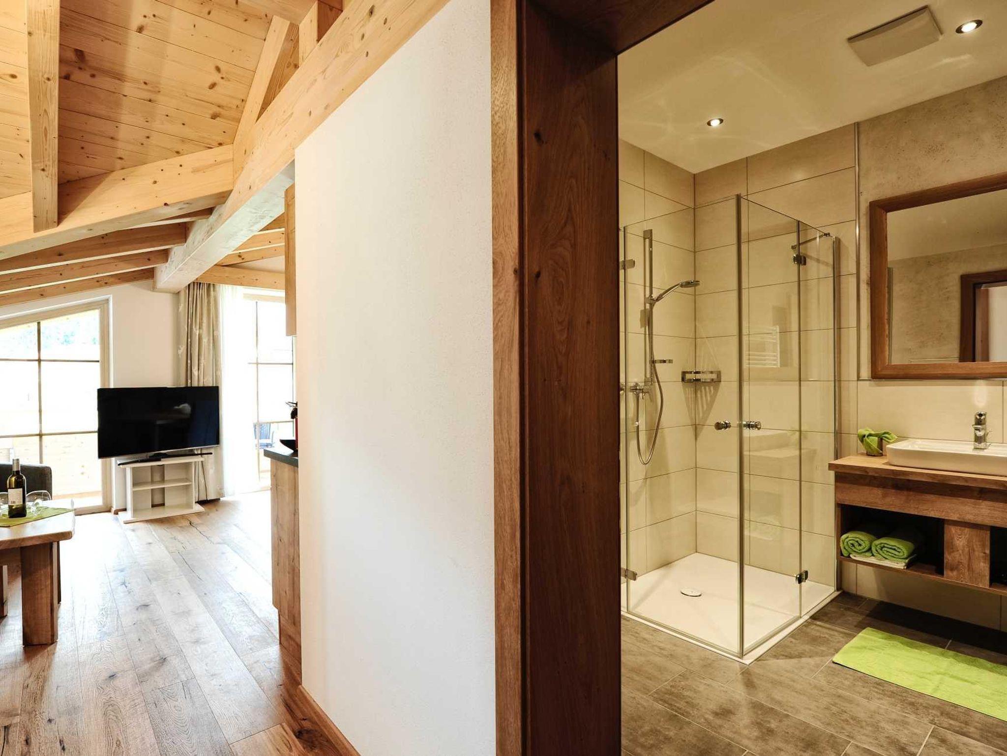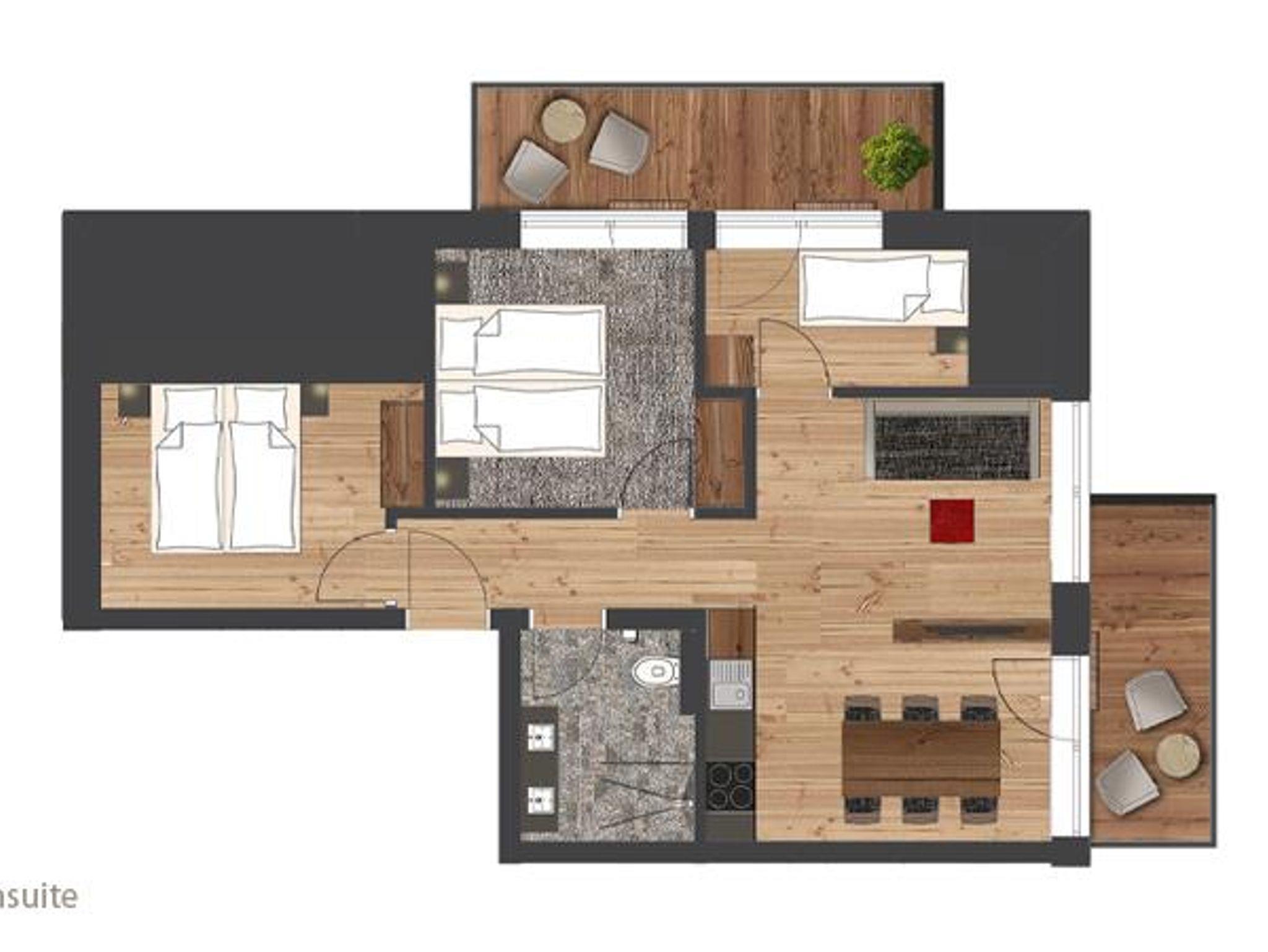 Die Ferienwohnung Alpensuite bietet 2 Schlafzimmer, sowie einen Wohnbereich mit ausziehbarer Doppelschlafcouch, eine vollausgestattete moderne Küche mit stilvollen Essbereich, ein Badezimmer mit Dusche (inklusive Schminkspiegel, Haarföhn, Handtücher, Badvorleger), digitalen TV, W-LAN, sowie einen Balkon mit Blick ins Karwendelgebirge.