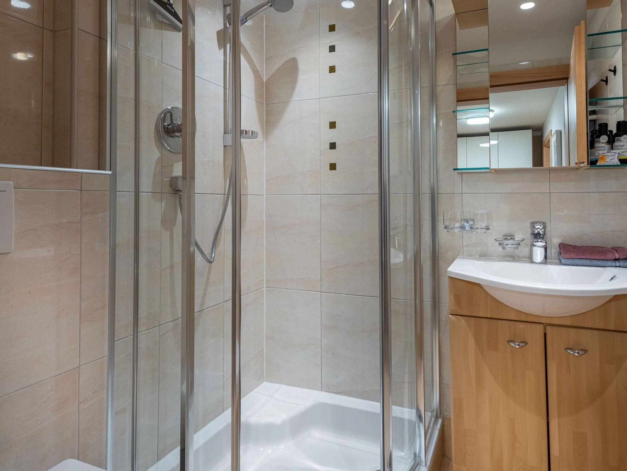 • modernes Badezimmer mit barrierefreier Dusche und WC (Fön, Kosmetikspiegel, Radio)