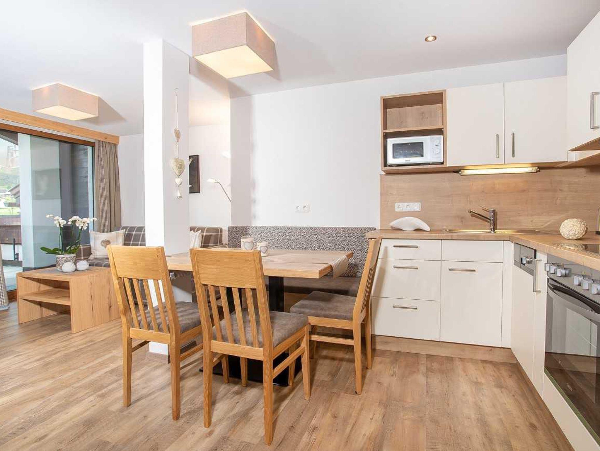 Die Wohnung bietet eine voll ausgestattete Küche mit Ceranfeld, Geschirrspüler, Mikrowelle, Backrohr, Filter-Kaffeemaschine sowie einen Balkon und eine Dachterrasse mit herrlichem Ausblick.