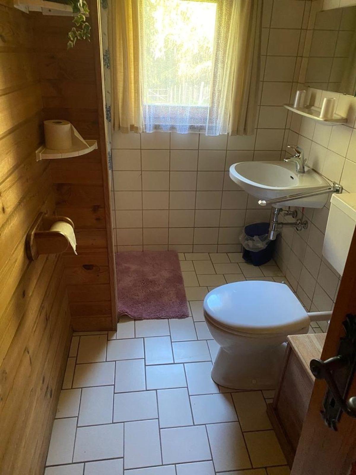 Es gibt zwei Schlafzimmer mit französischen Betten, zusätzlich steht in der Wohnstube ein weiterer Schlafplatz auf dem Sofa zur Verfügung. Das Badezimmer ist mit Dusche und WC ausgestattet; warmes Wasser wird über einen Badeofen (100-Liter-Boiler), der mit Holz beheizt wird, erzeugt – ganz im Stil traditioneller Hüttenromantik.