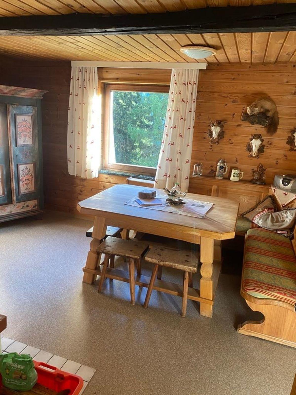 Die gemütliche Wohnstube ist mit Sofa, Kachelofen, Esstisch und Eckbank eingerichtet – hier lassen sich nach einem aktiven Tag in den Bergen entspannte Hüttenabends verbringen. Ein Radio sorgt bei Bedarf für musikalische Begleitung.