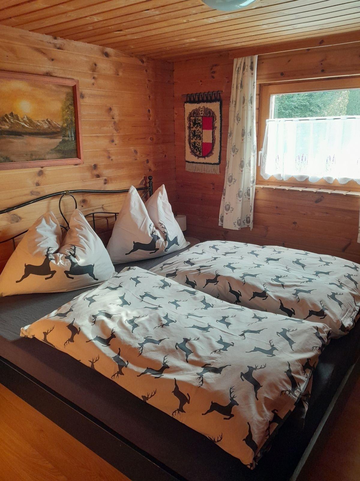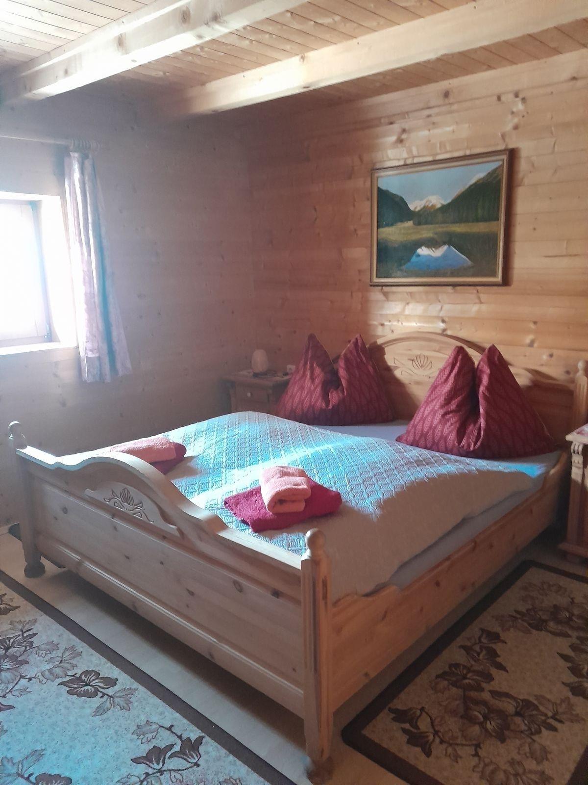 Diese urige Berghütte in ruhiger Alleinlage bietet auf 55 m² Platz für bis zu 5 Personen und ist ideal für Familien, Paare und Ruhesuchende. Zwei Schlafzimmer mit französischem Bett sowie ein weiterer Schlafplatz auf dem Sofa in der Wohnstube sorgen für gemütliche Nächte.