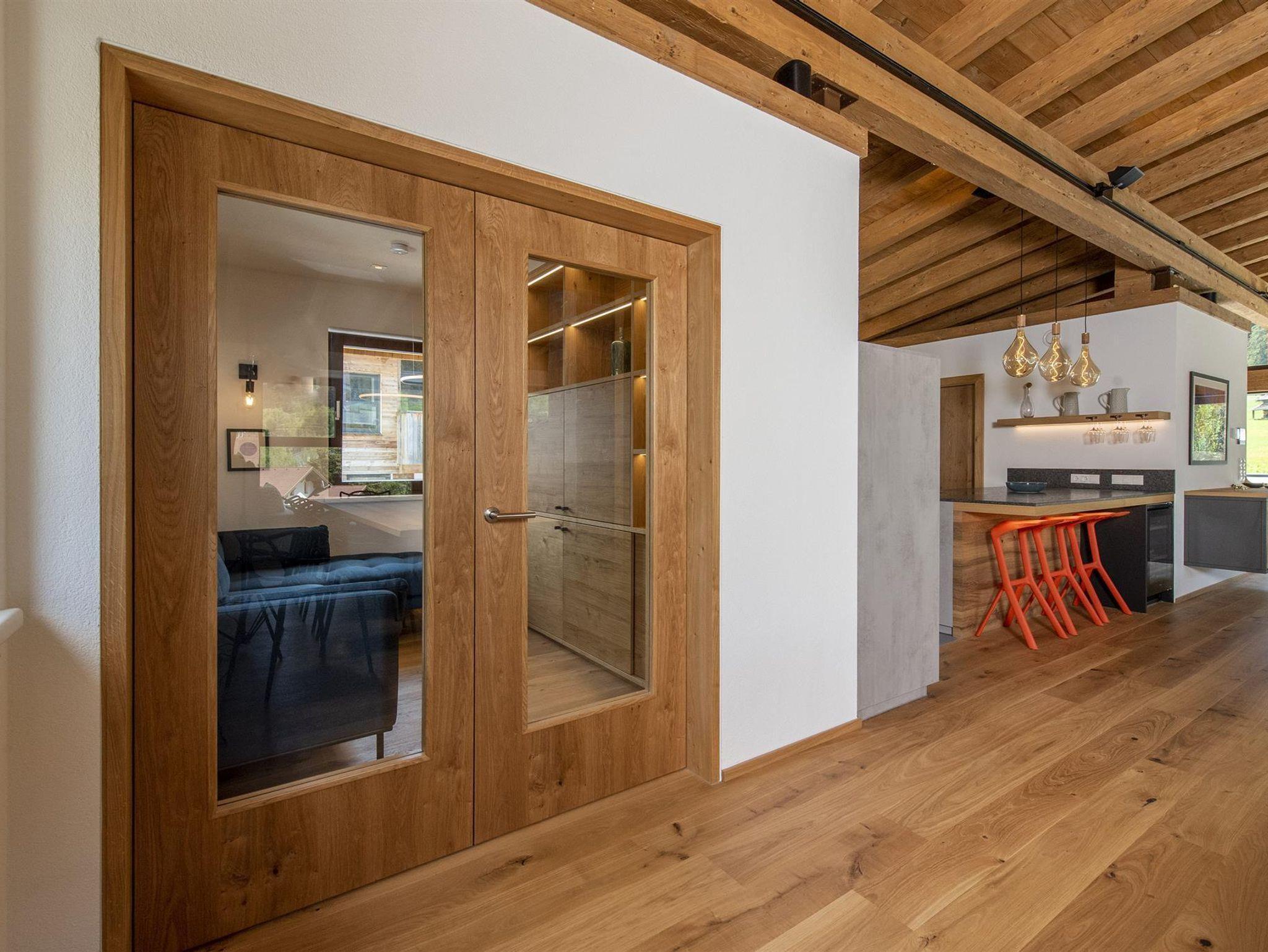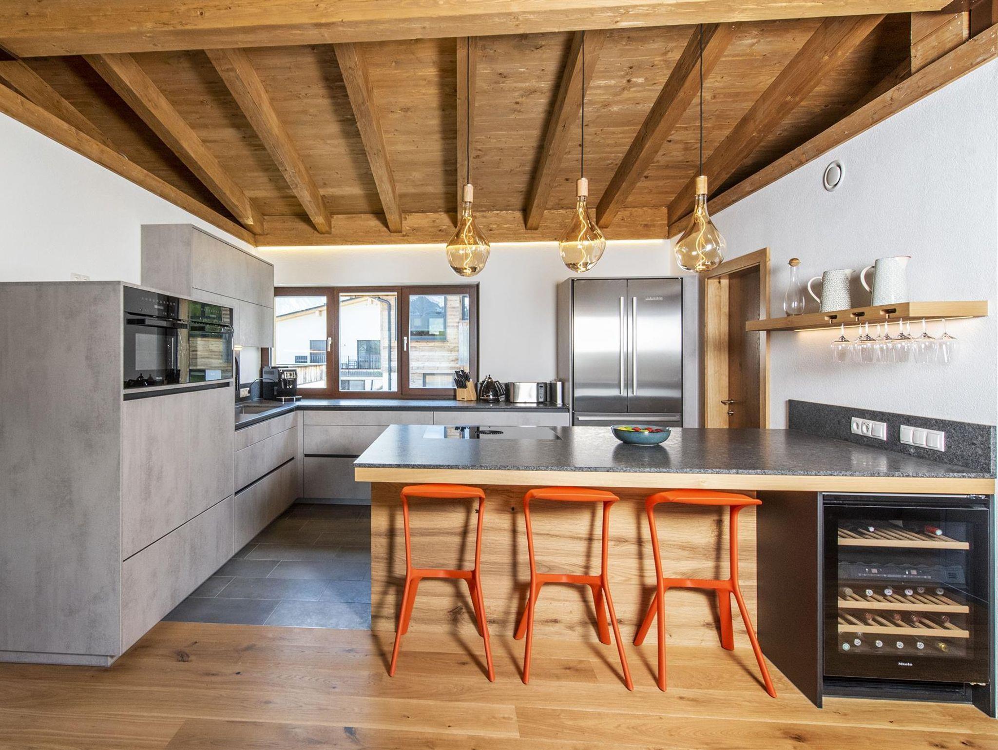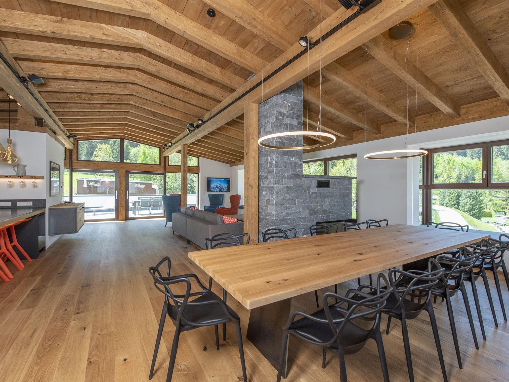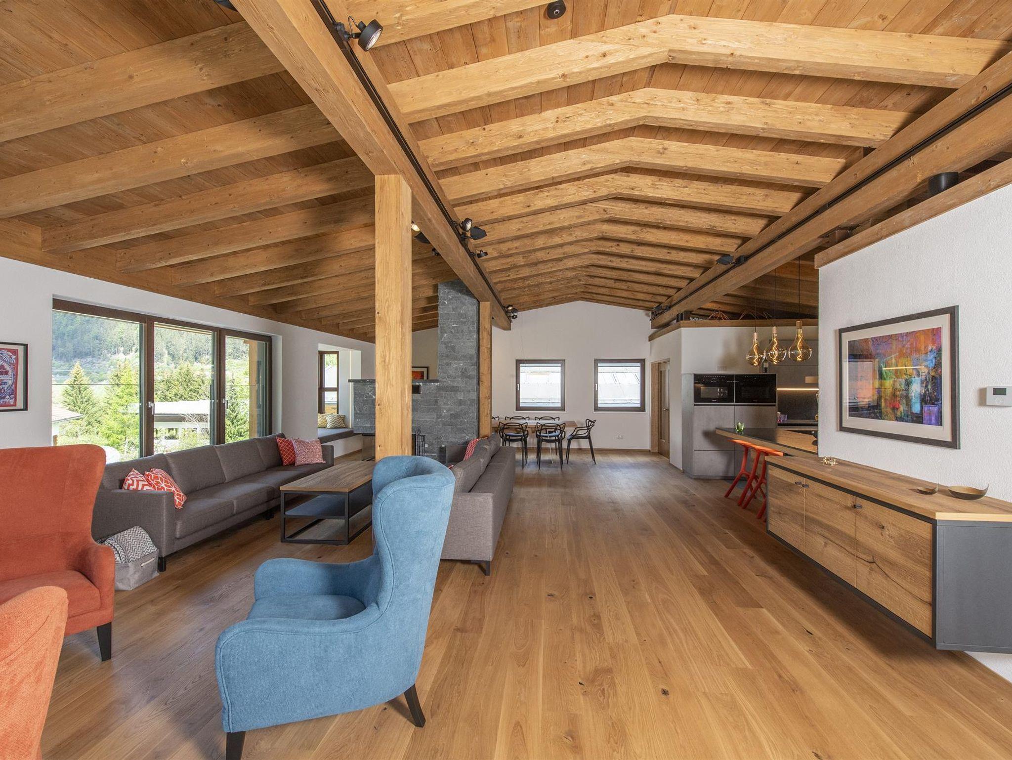 Der spektakuläre offene Wohn- und Essbereich ist schön hell und verfügt über einen offenen Kamin, einen Essbereich für 14 Personen, viele gemütliche Sitzmöglichkeiten, um die Erlebnisse des Tages mit Freunden und Familie zu teilen. Weiters sind hervorstehende Fenstersitze perfekt positioniert, um den atemberaubenden Ausblick zu genießen. Der Wohnbereich schließt an eine große Terrasse an, die einen ungestörten Blick auf den Berg Hoher Riffler bietet. Zusätzlich ist auch eine Bibliothek nebem dem Essbereich angesiedelt, um einen ruhigen und gemütlichen Rückzugsort zu bieten. Die state of the art Küche ist voll ausgestattet mit allem was Sie brauchen. Dazu zählen 2 Geschirrspüler, Induktionsherd, ein großer Kühl- und Gefrierschrank, eine Kaffemaschine, Barhocker und eine Speisekammer mit zusätzlichem Kühlschrank.