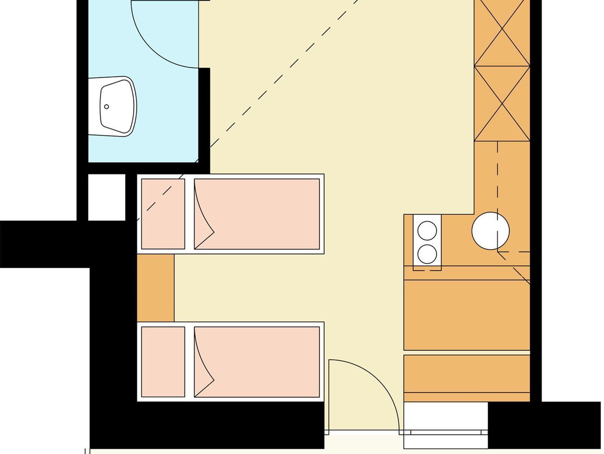 Dieses Studio ist ausgestattet mit zwei Einzelbetten, einem Tisch mit Stühlen, Küche mit Kühlschrank und Gefrierfach, Kochplatten, Mikrowelle mit Grill, Kaffeemaschine, Wasserkocher, Koch- und Tafelgeschirr, Fön, Safe, Hand- und Badetücher, Sat-TV, gratis W-Lan.Dusche und WC getrennt. Überdachter Balkon mit Gartenmöbel und Sonnenschirm.