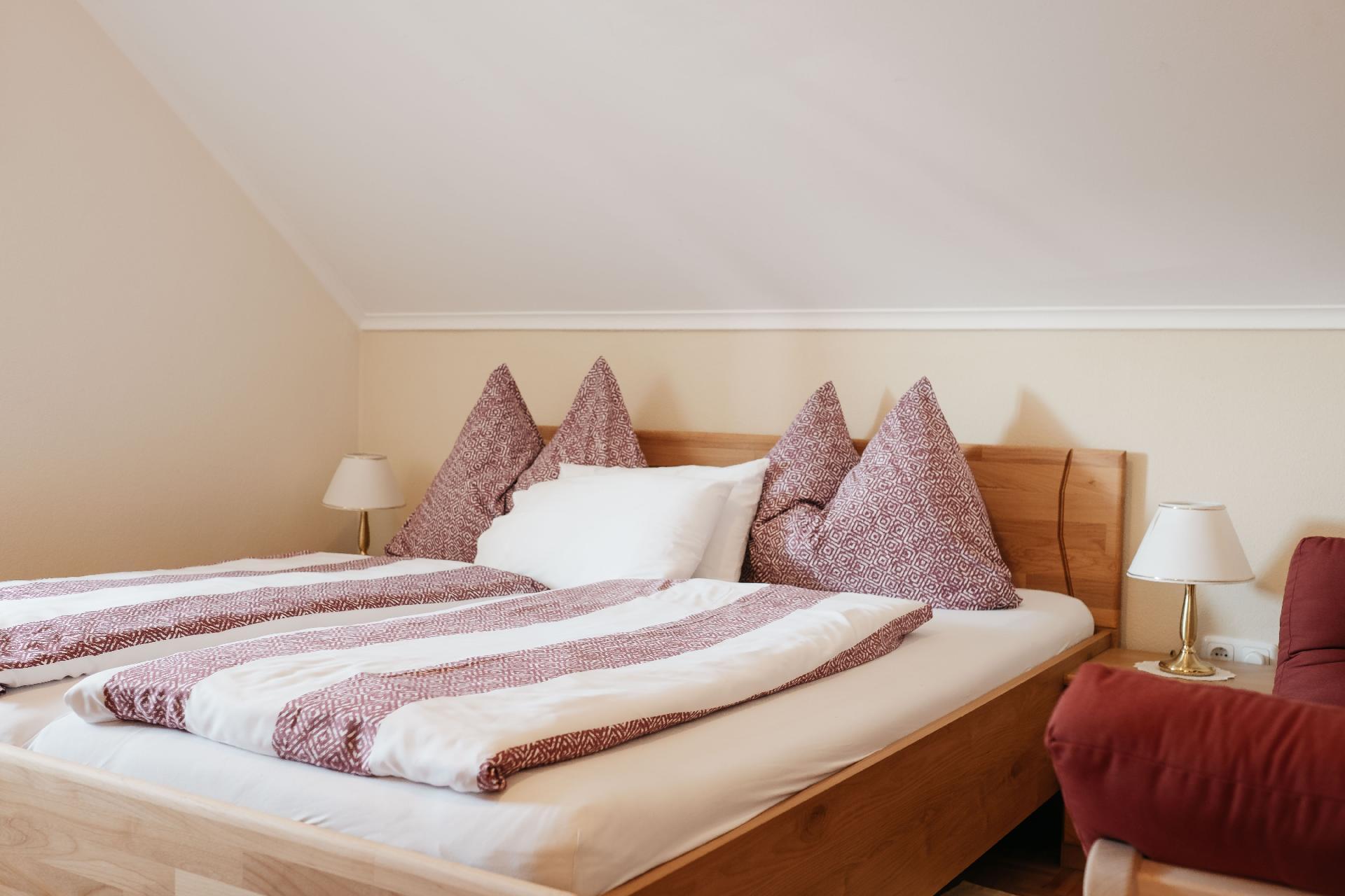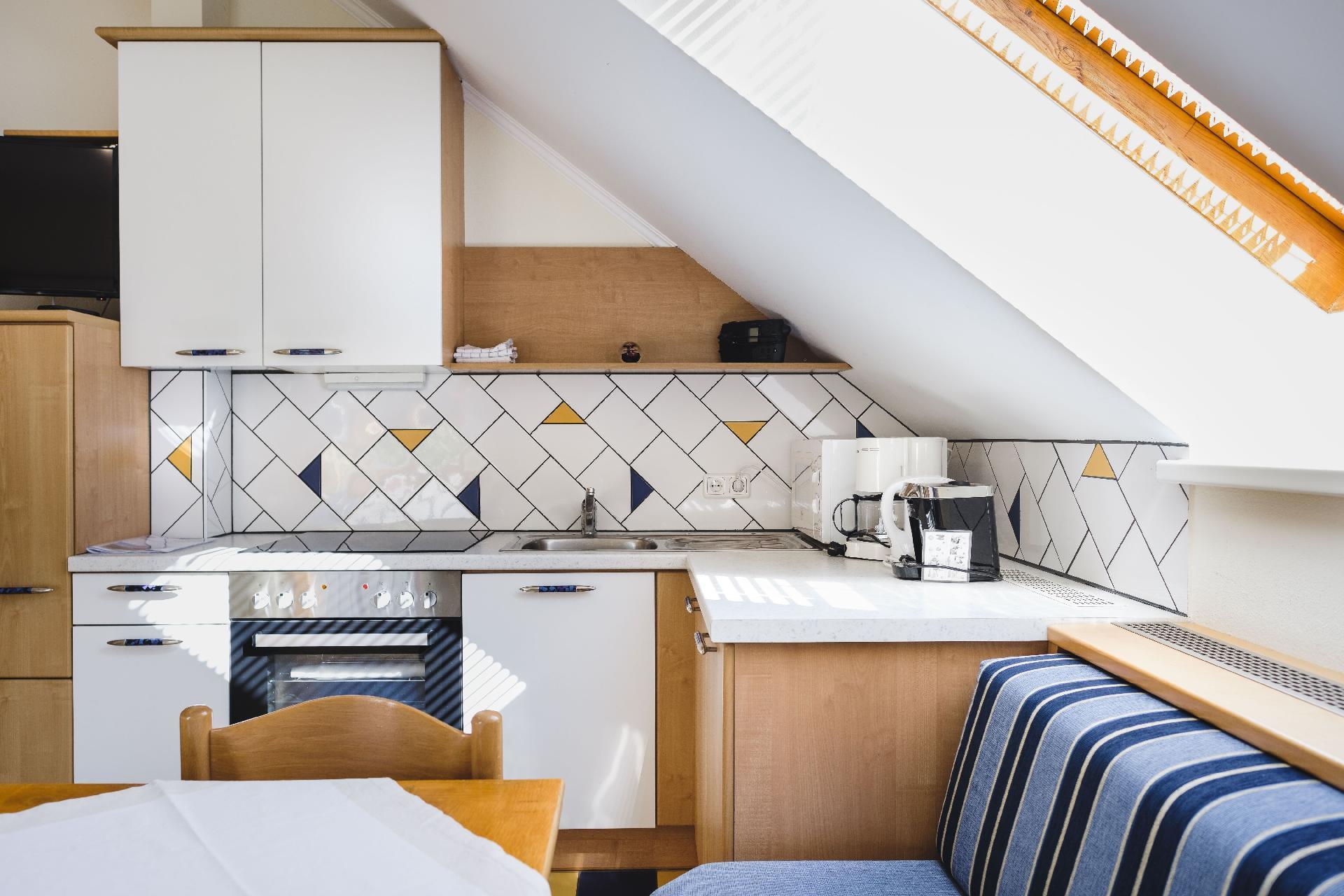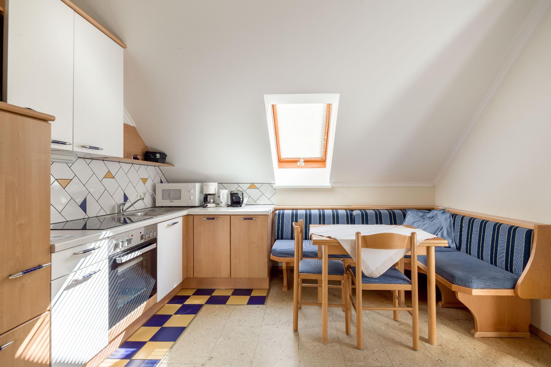 This 40m² holiday apartment for three people is in the attic of the house. It is charmingly furnished with solid wood furniture and provides modern amenities such as satellite TV, a safe and wireless Internet access. The bedroom has a double bed 180cm wide and a supplementary bed 80cm wide. The kitchen-diner has a cosy sitting corner with a table, corner bench and two chairs, where you can enjoy meals, play games and make plans for the next day. The open kitchen unit next to it is equipped with a stove, oven, capsule coffee machine, fridge, microwave, dishwasher and kettle. The daylight bathroom is fitted with a shower, washbasin and hairdryer. The WC is separate. The apartment has underfloor heating.