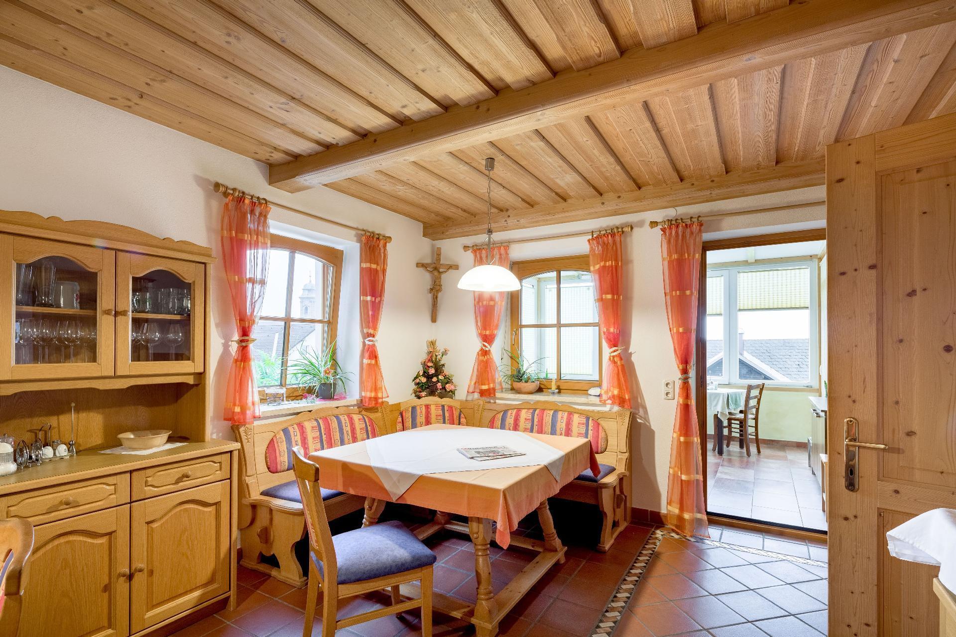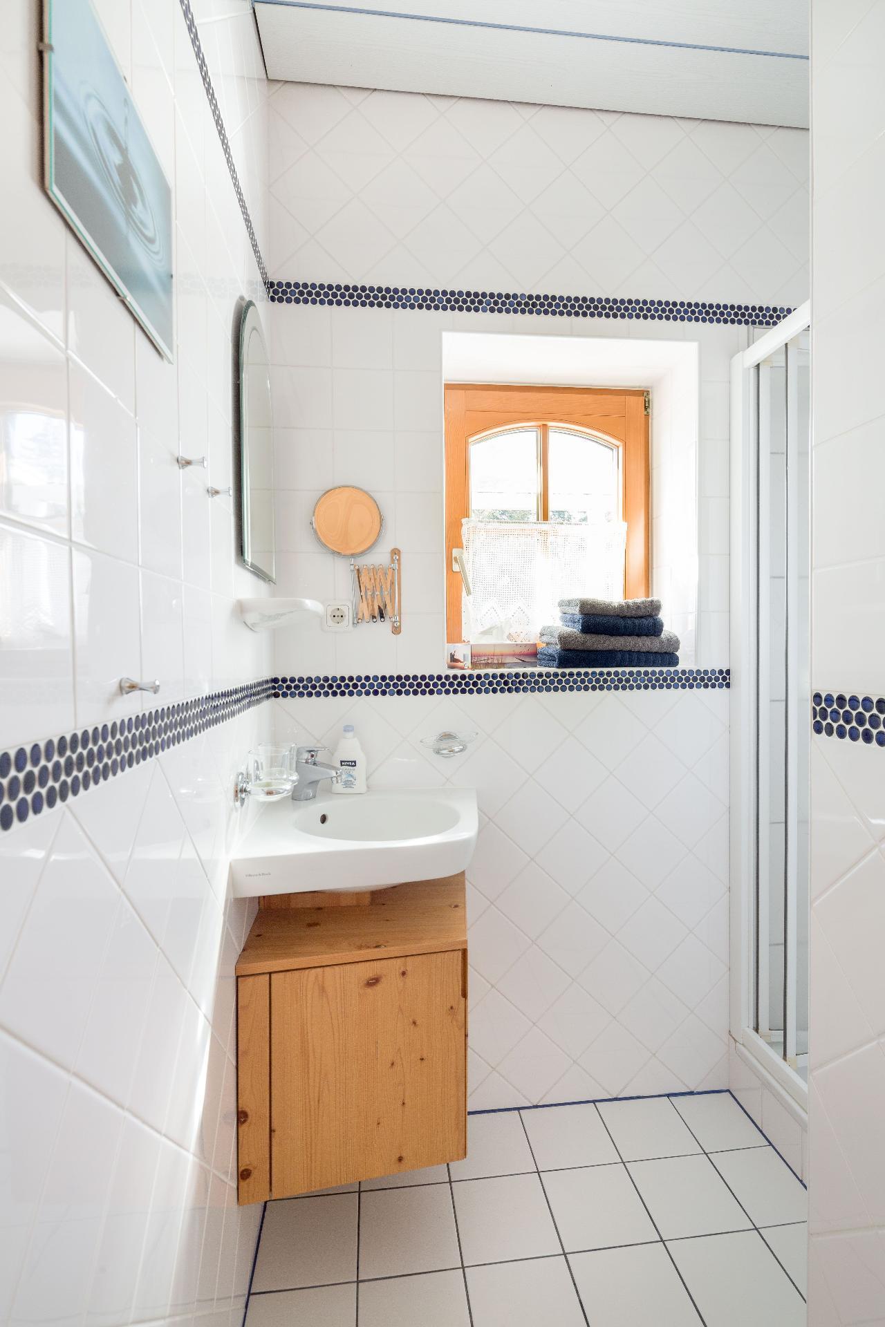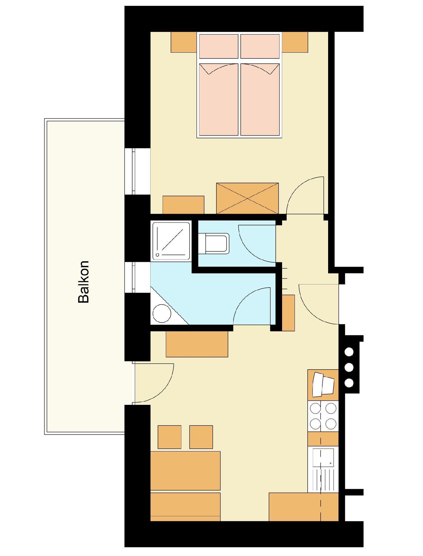 This 40m² holiday apartment for three people is in the attic of the house. It is charmingly furnished with solid wood furniture and provides modern amenities such as satellite TV, a safe and wireless Internet access. The bedroom has a double bed 180cm wide and a supplementary bed 80cm wide. The kitchen-diner has a cosy sitting corner with a table, corner bench and two chairs, where you can enjoy meals, play games and make plans for the next day. The open kitchen unit next to it is equipped with a stove, oven, capsule coffee machine, fridge, microwave, dishwasher and kettle. The daylight bathroom is fitted with a shower, washbasin and hairdryer. The WC is separate. The apartment has underfloor heating.