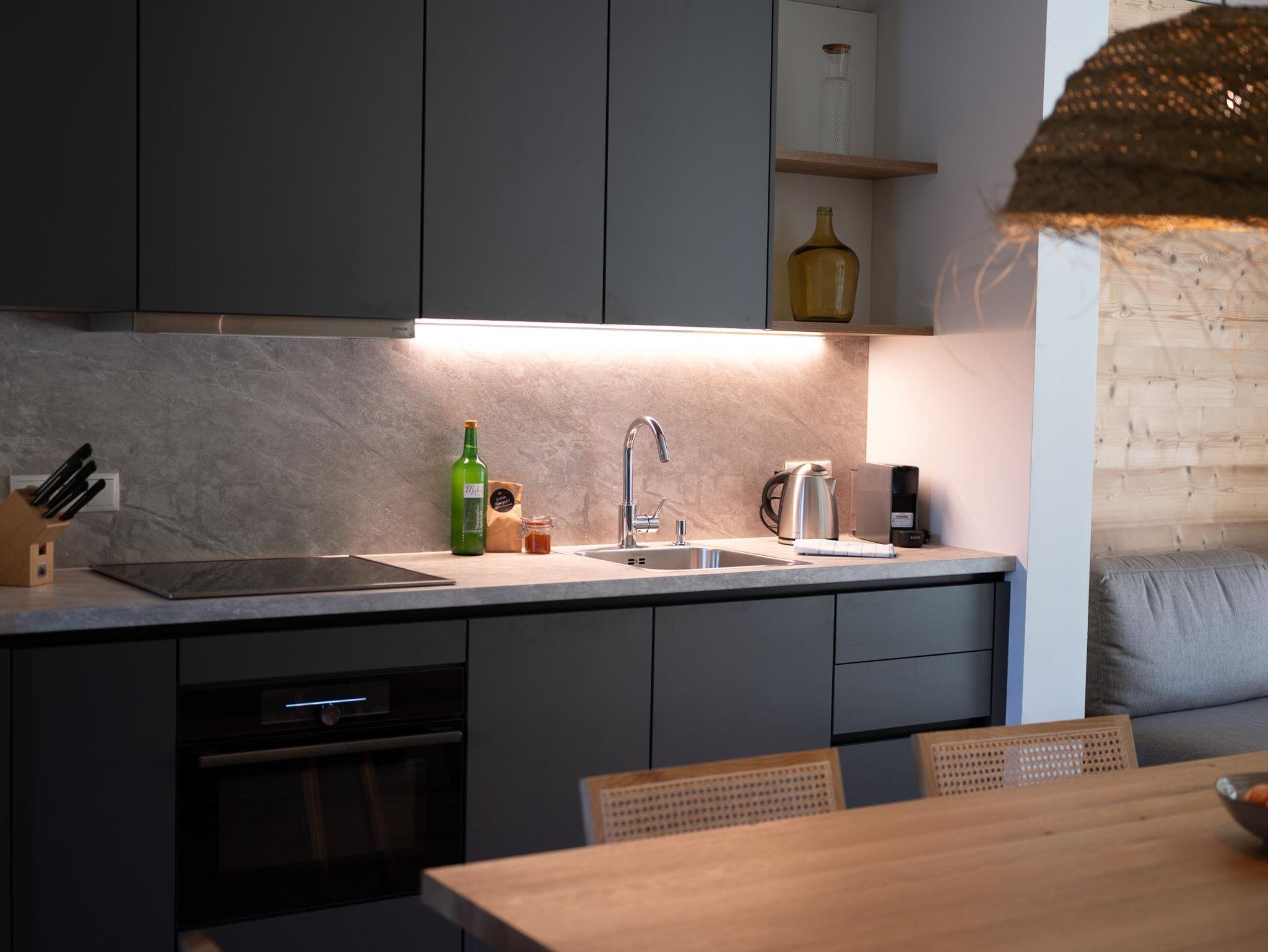The apartments are beautiful and clean, perfectly equipped. There is a ski storage room in the house with boots heater, very useful. Parking garage is under the building, very convenient to reach the room, parking spots are spacious.