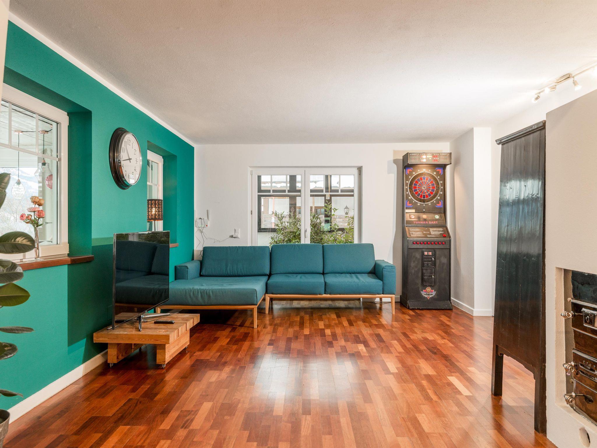 • Wohnraum mit Smart TV, Dartmaschine, Spielecke, und Bücherkasten