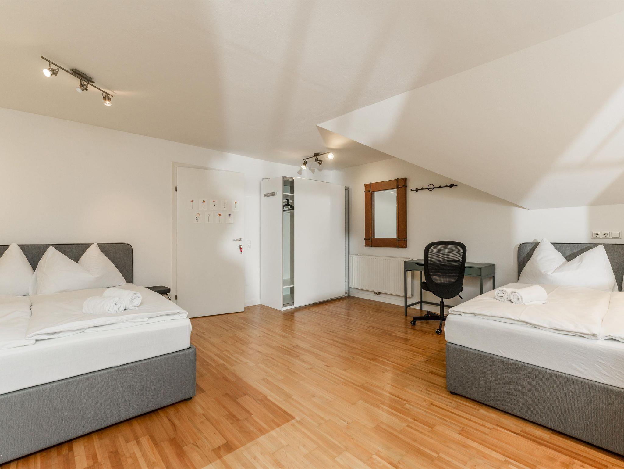 - 1. Schlafzimmer mit kleinem Wohnraum in welchem sich 2 Doppelbetten und ein ausziehbares Bett & TV befinden im OG
