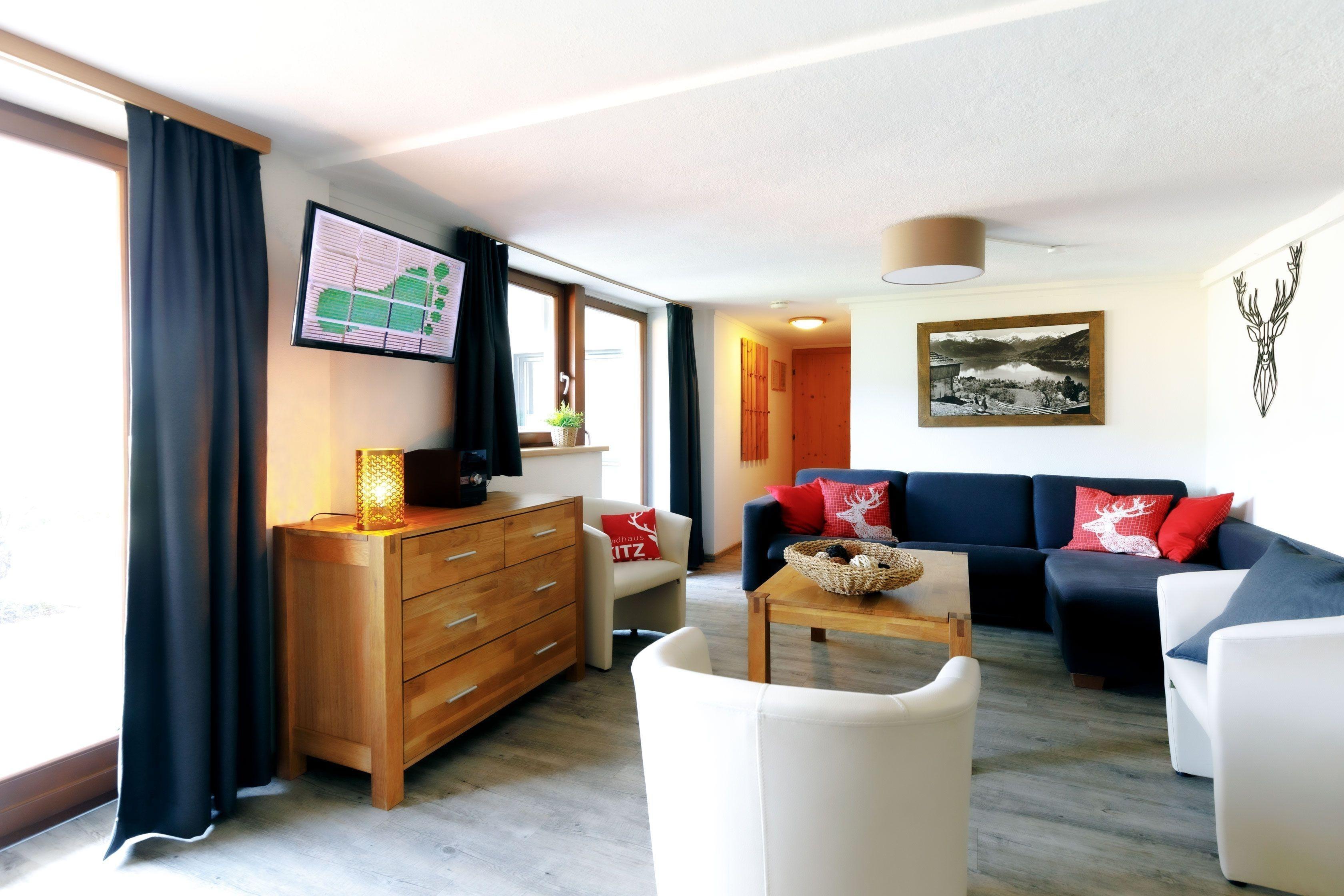 ländlich eingerichtete Wohnzimmer mit gemütliche Sitzecke, Couch, 3 Sessel, Flatscreen-TV
