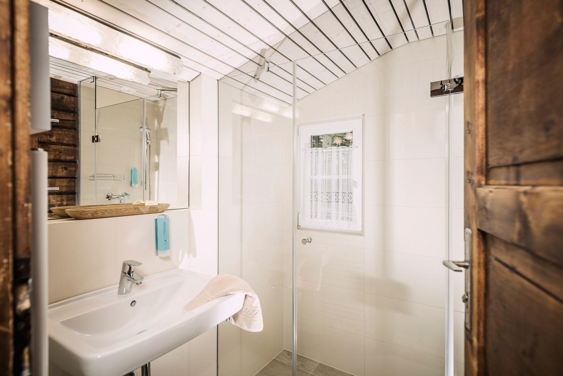You can barbecue on the terrace and enjoy your meal in the shade of the large spruce trees or under the parasol. In the hut, a staircase leads to the upper floor and the other bedrooms. The comfortable double bedroom has an open bathtub and its own washbasin. The two other bedrooms in the spruce forest hut each have two single beds.