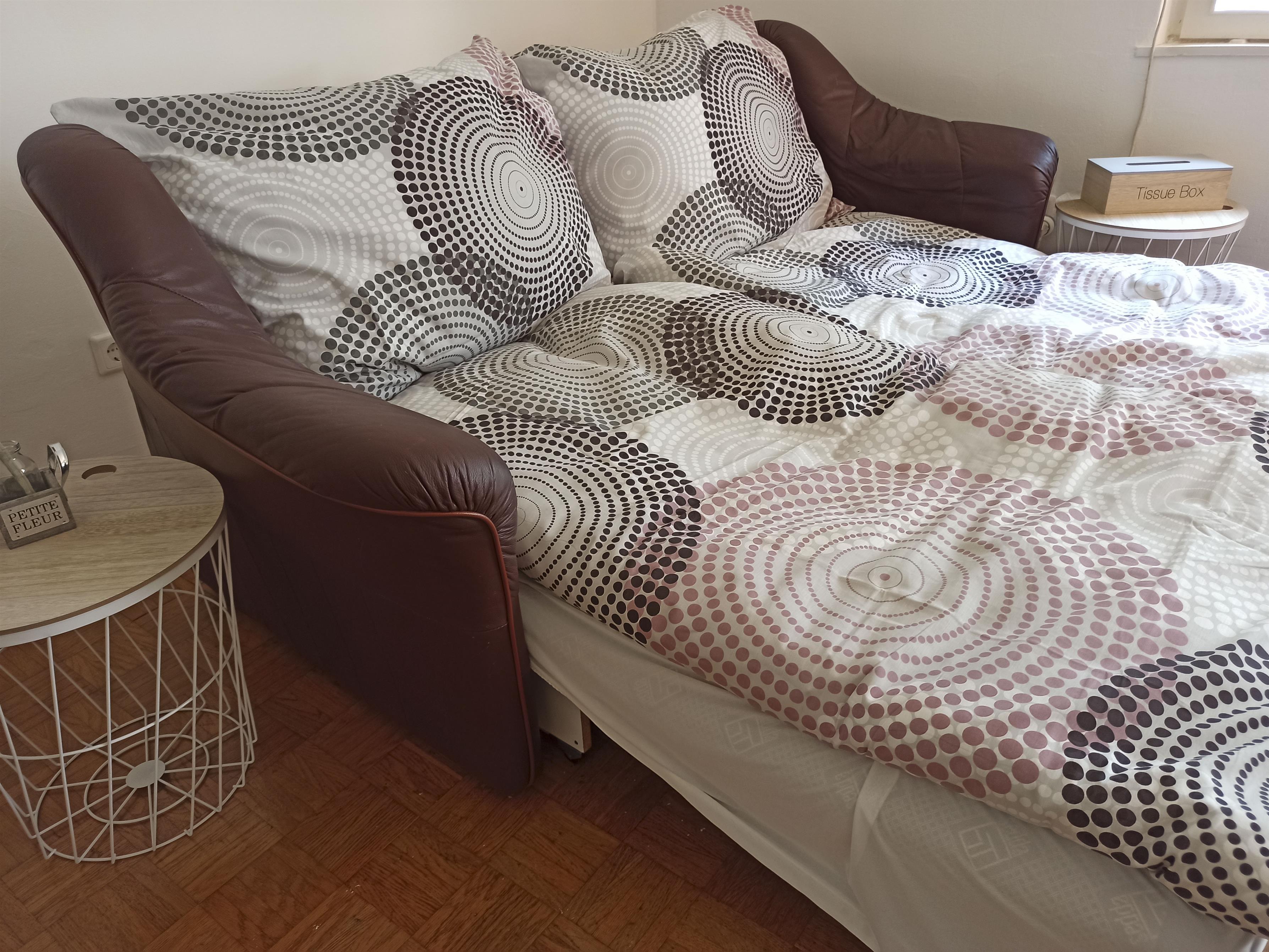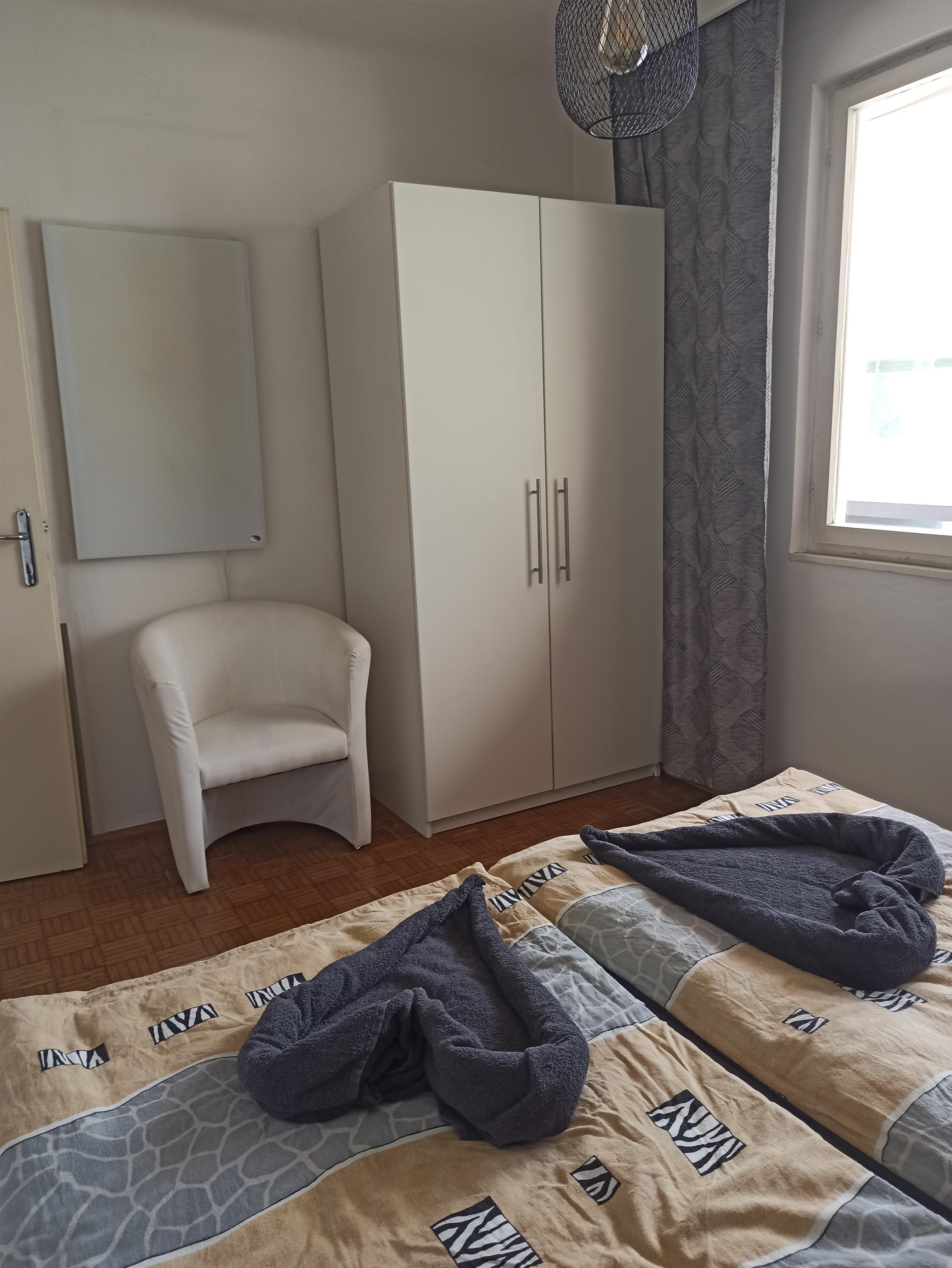 Im Schlafzimmer befindet sich ein großes Doppelbett (180 x 200) und ein Schrank. Bettwäsche ist vorhanden.