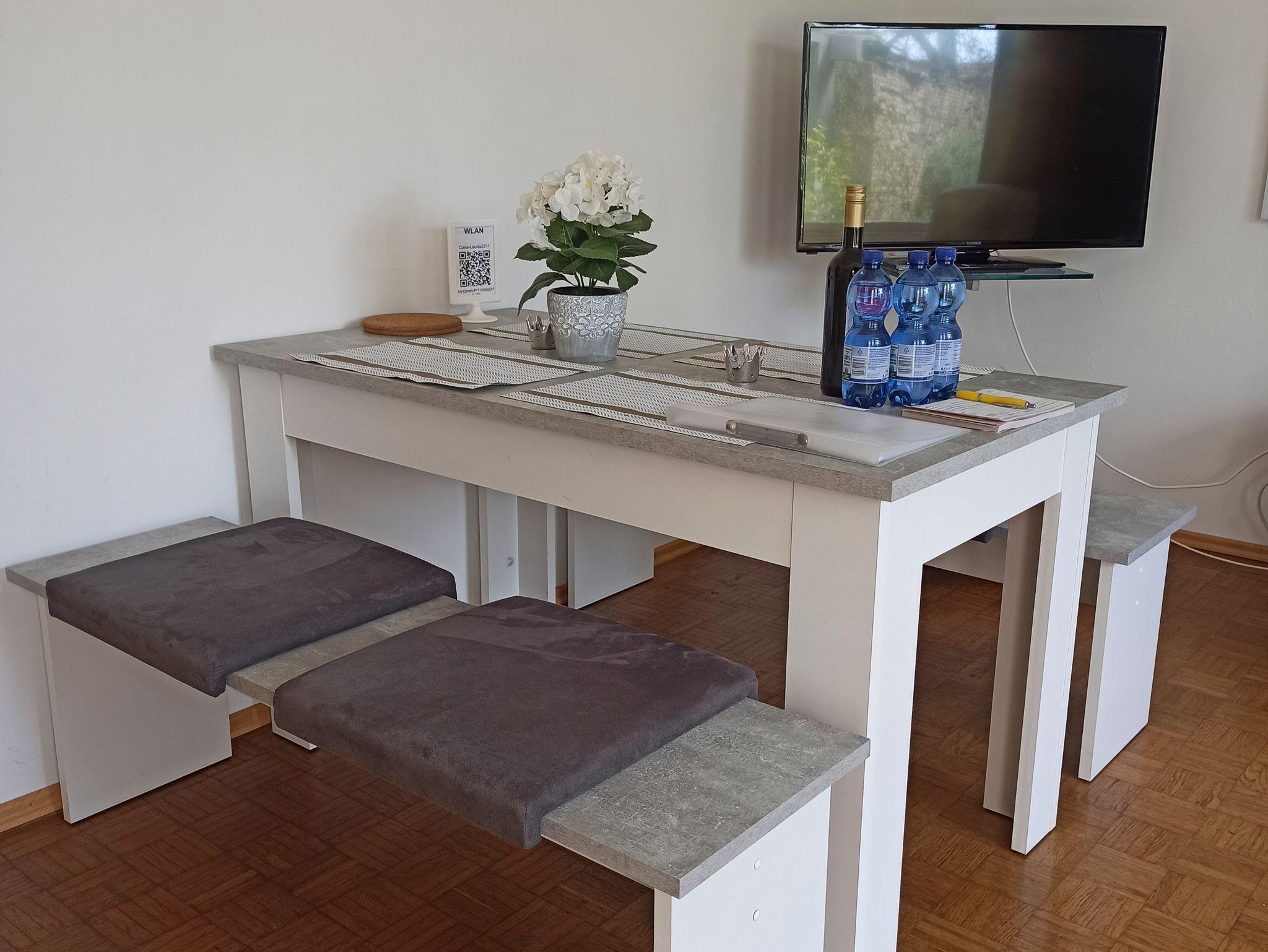 Im Wintergarten findet man einen Essbereich, der Platz für bis zu 6 Personen bietet.
