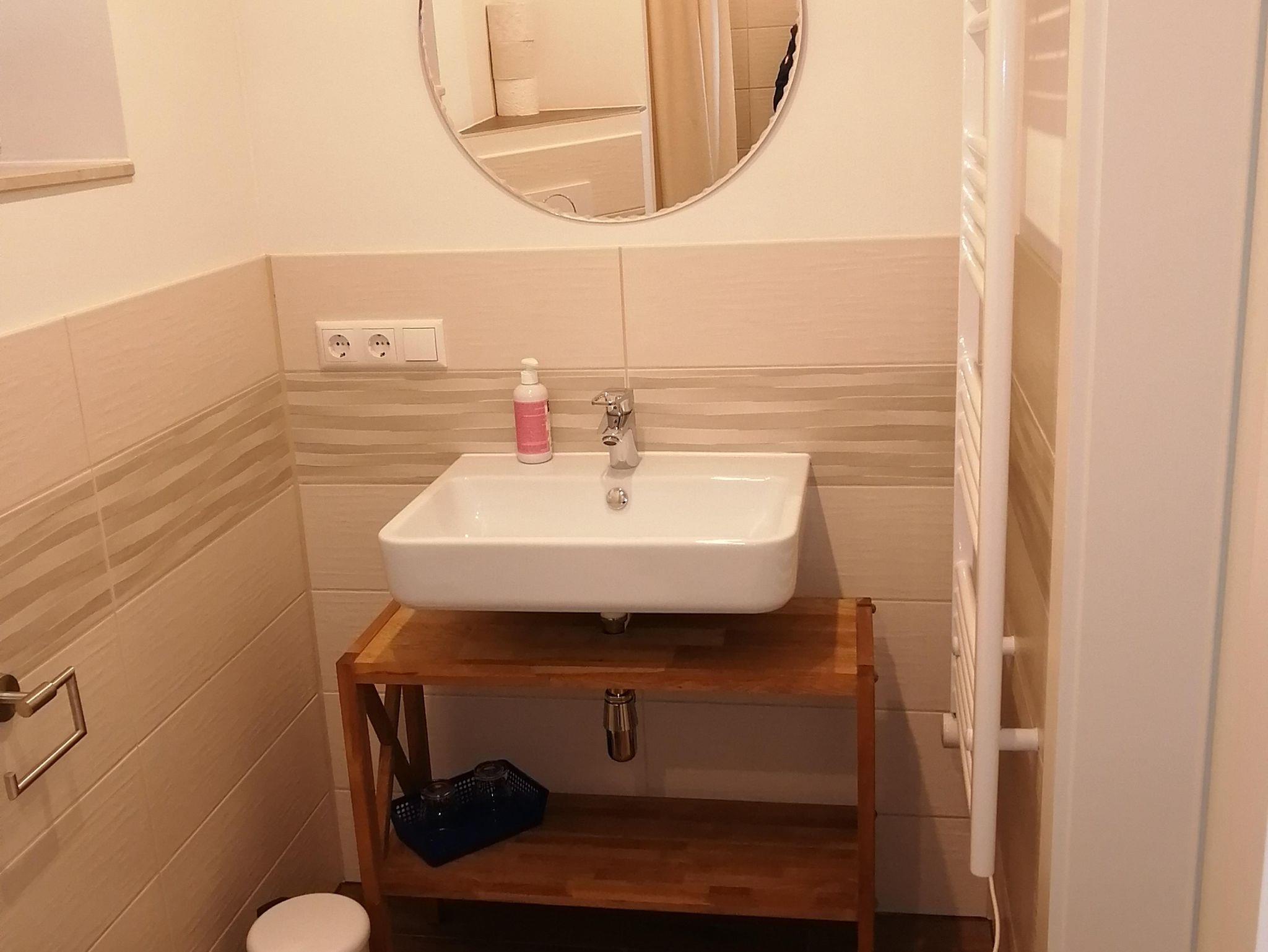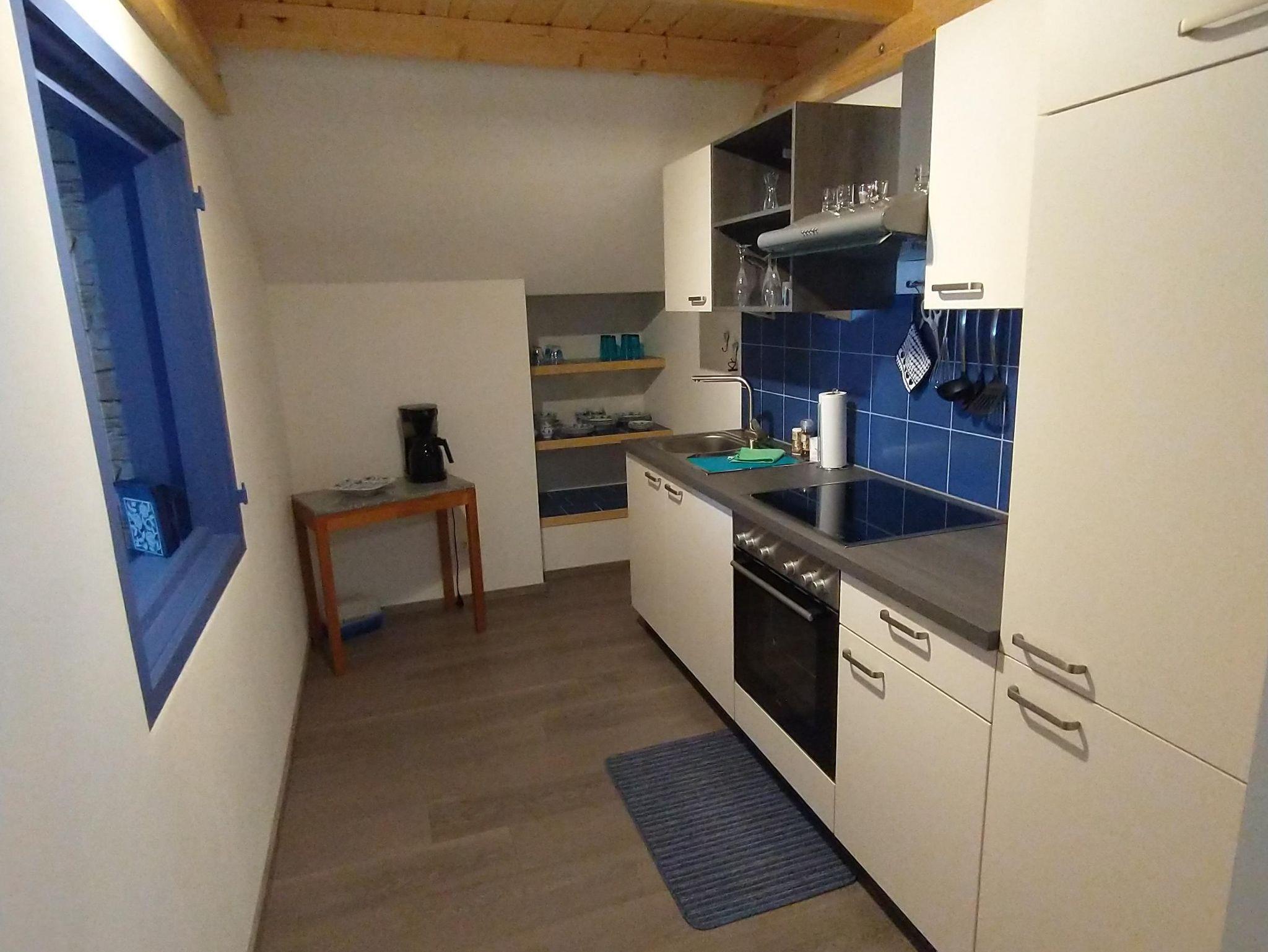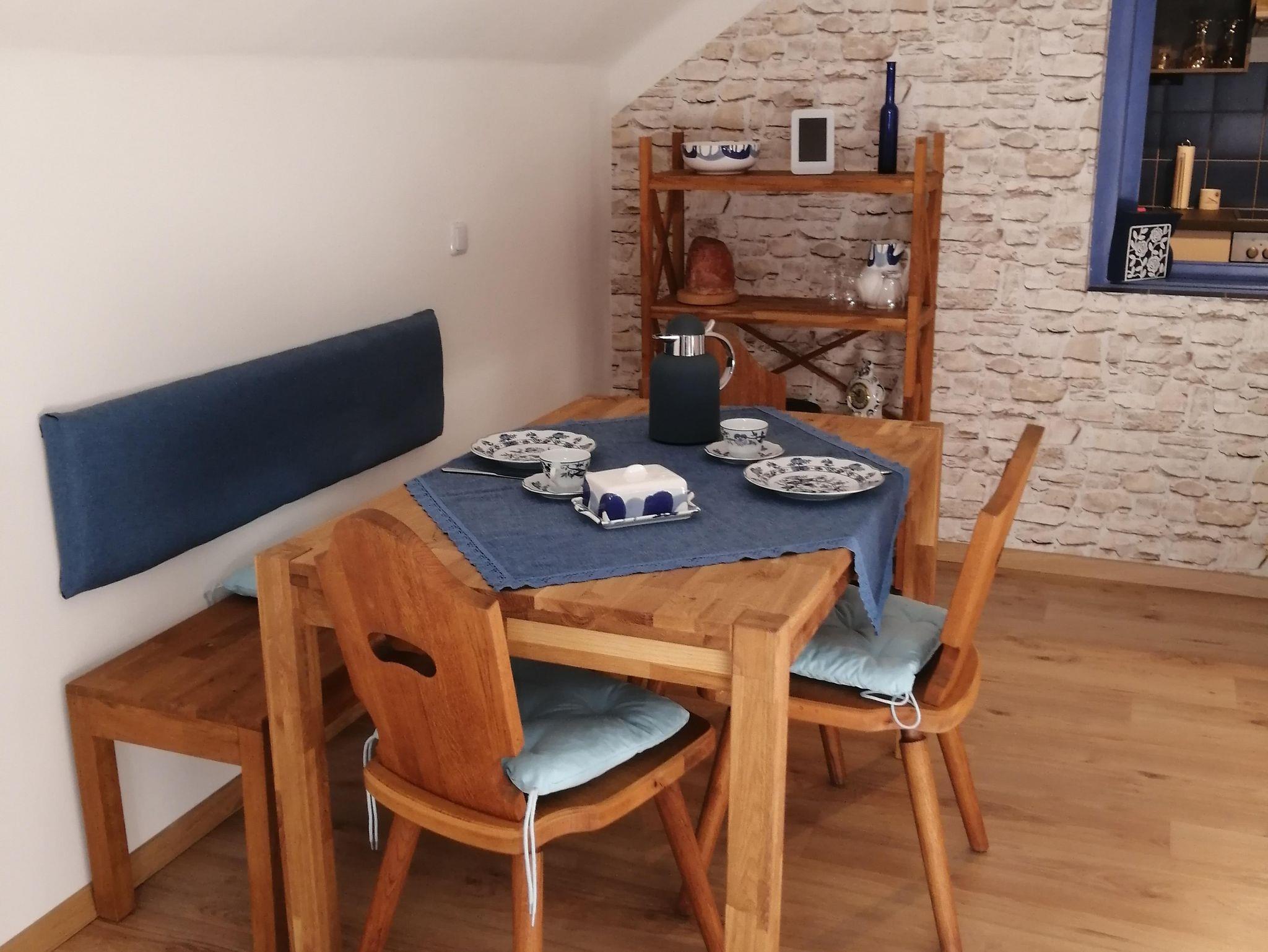 Die neu renovierte Ferienwohnung befindet sich im 1. Obergeschoß vom Haus. Der seperate Zugang führt über eine breite Treppe zur Wohnung. Der Vorraum in der Wohnung verfügt über eine kleine Garderobe, Spiegel und ausreichend Platz für Koffer und Taschen. Die Küche ist gut ausgestattet. Das Schlafzimmer hat ein Doppelbett und Kleiderschrank. Handtücher und Bettwäsche sowie WLAN wird zur Verfügung gestellt.