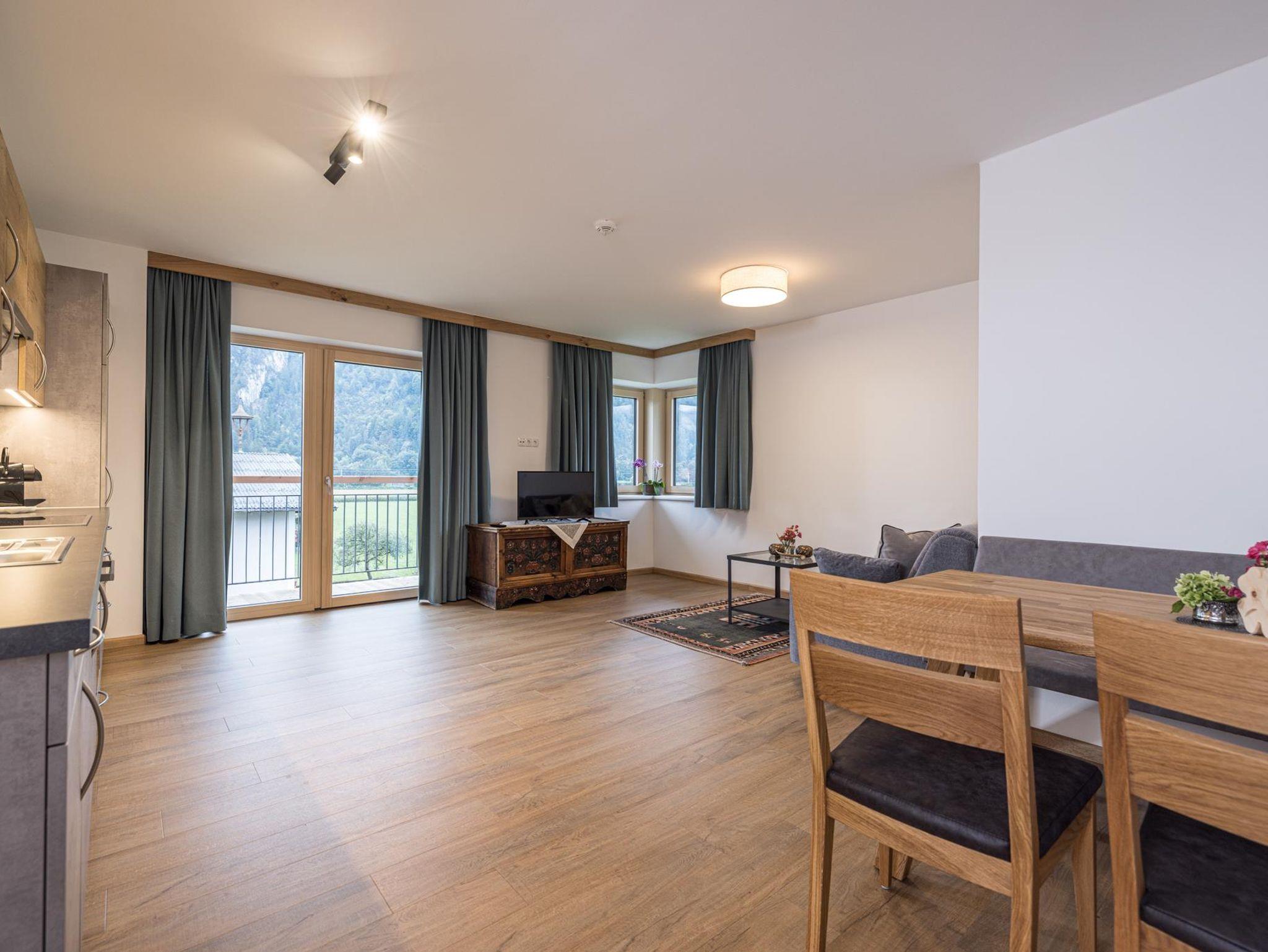 Das Appartement Kraft befindet sich im 3. Obergeschoss (65m2) und bietet Platz für bis zu vier Personen. Das moderne Appartement mit Blick auf den Rattenberger Schlossberg sowie das Inntal verfügt über ein Schlafzimmer mit einem großzügigen Doppelbett sowie einem begehbaren Kleiderschrank und einem Wohn - Essbereich. Die Küche ist voll ausgestattet: Nespresso Maschine, Wasserkocher, Kühlschrank mit Gefrierfach, Backofen, 4- Platten Cerankochfeld, Geschirrspüler, Kochuntensilien und Geschirrtücher. TV Geräte finden Sie im Wohn - Essbereich wie auch in den Schlafzimmern vor. Ebenfalls bietet das Appartement eine gemütliche Essecke sowie ein Ausziehsofa an.