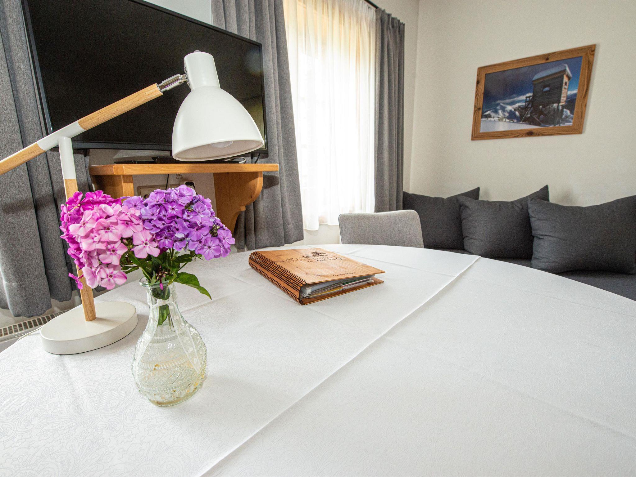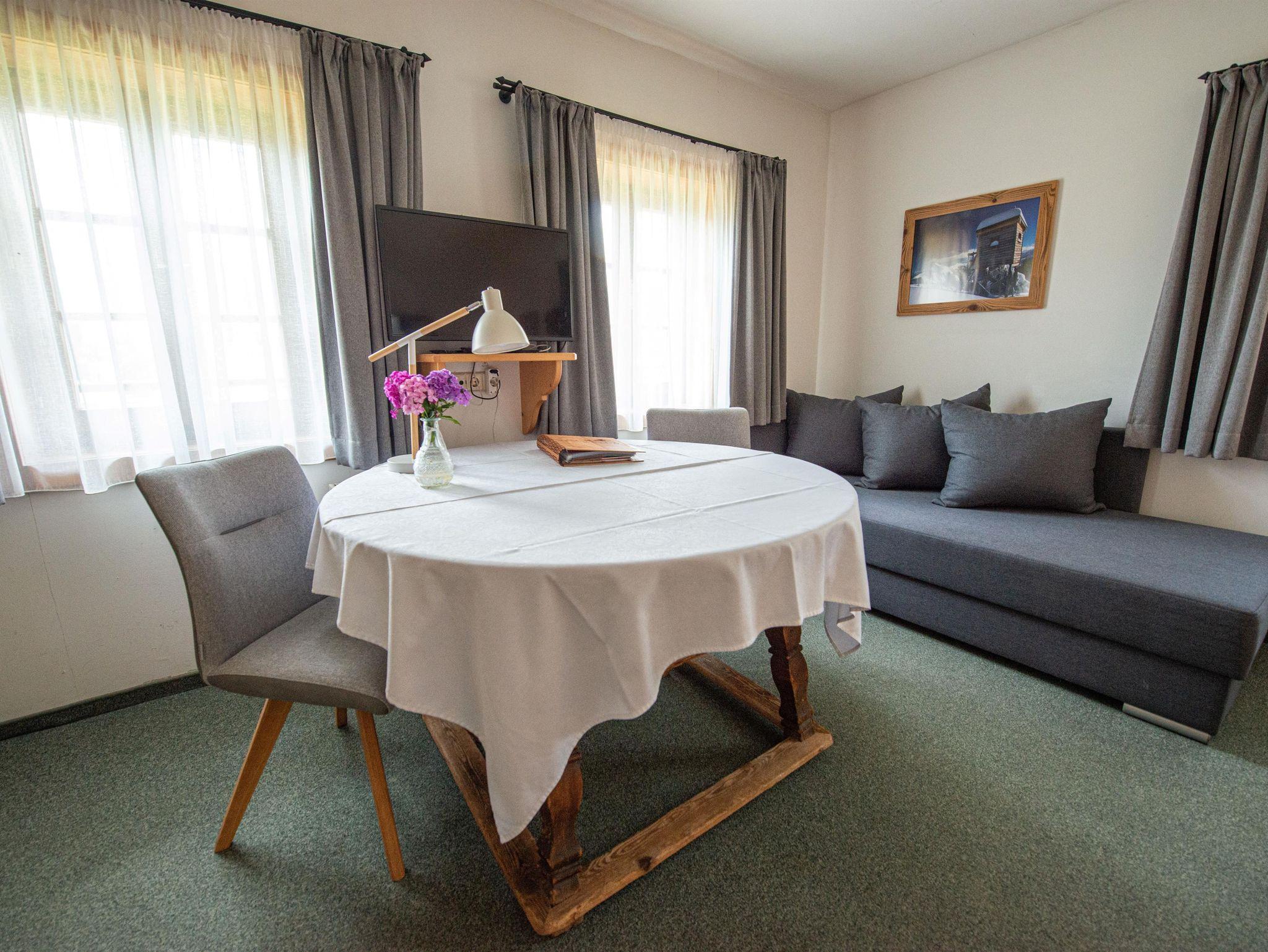 Das Zimmer ist im 1. Stock und ist für 2-3 Personen und ist ausgestattet mit Schlafzimmer, evtl. Reisegitterbett, Fernseher, WC, Bad mit Dusche, Handtüchern und Föhn. Weiters ist ein Balkon mit Sitzgelegenheit über den Flur erreichbar. Im Erdgeschoß ist das Frühstückszimmer mit Kachelofen und Tischspielen.