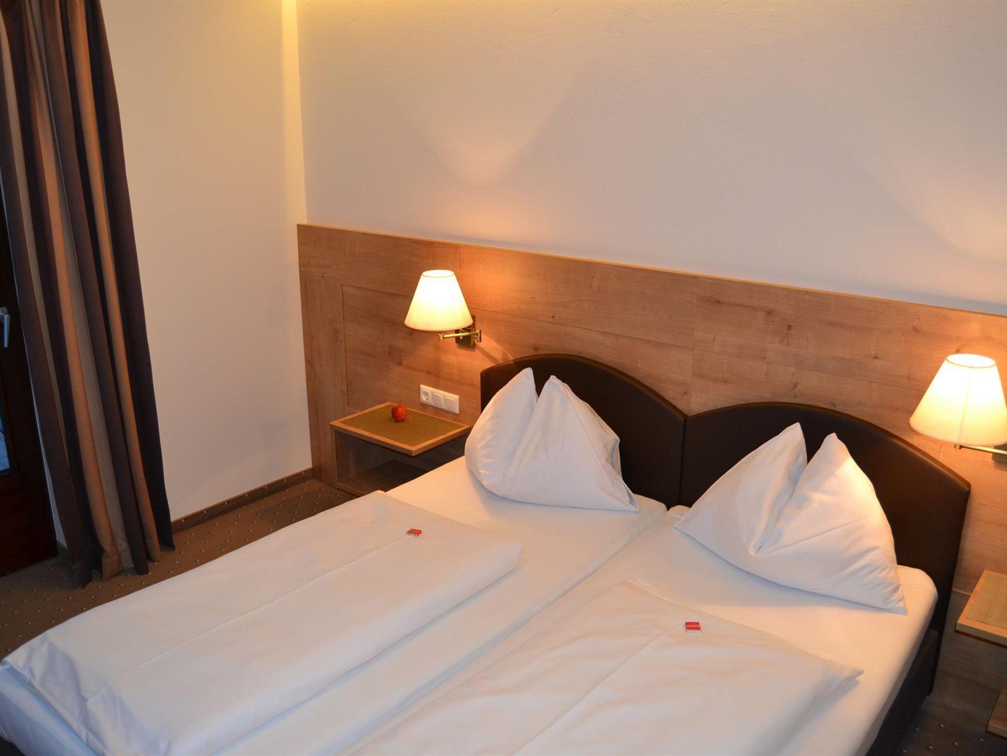 In einigen unserer Doppelzimmer befindet sich ein drittes Bett. Ein Doppelzimmer ohne Balkon.