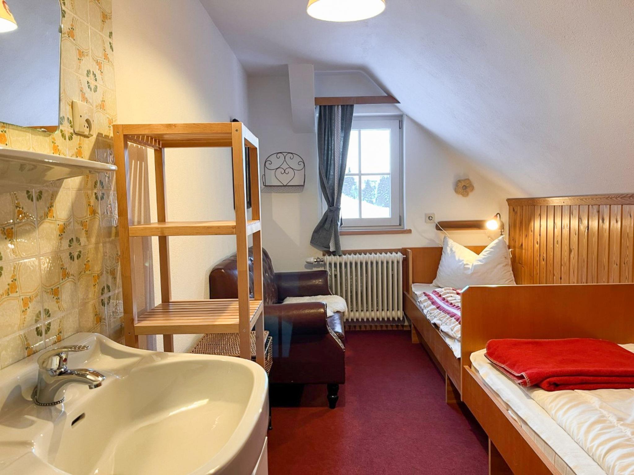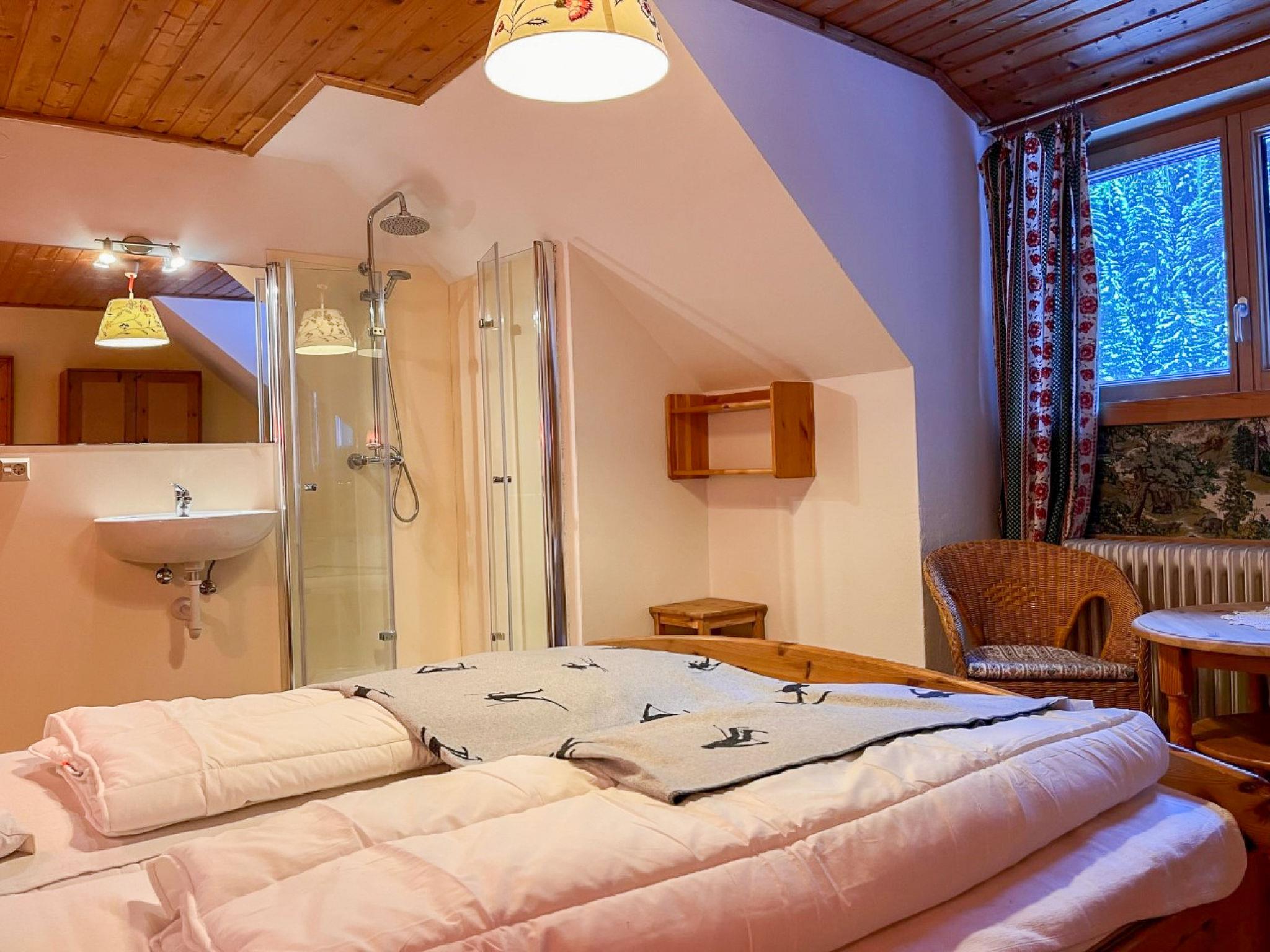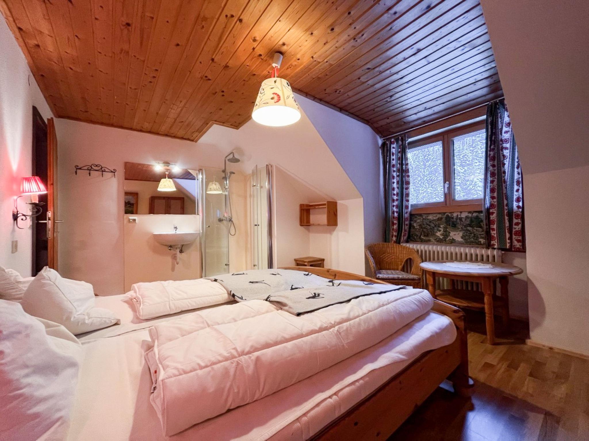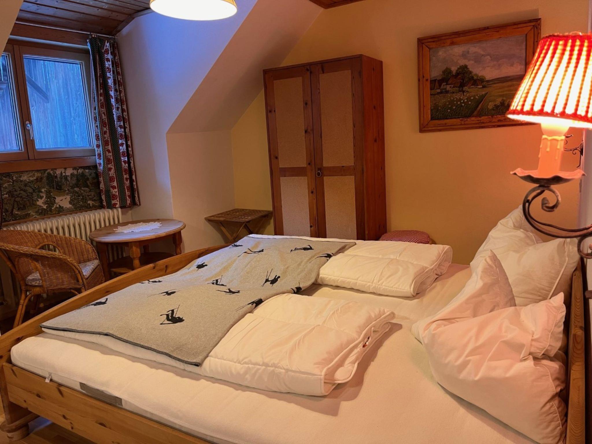 "Knaushof", 6-room apartment 110 m2 on 2nd floor. Partly with sloping ceilings, stylish and cosy furnishings: entrance hall with dining table. 1 room with 1 double bed, hand-basin and shower. Exit to the balcony. 1 room with 1 double bed, hand-basin and shower. 1 room with 1 double bed and hand-basin. 1 room with 2 beds, 1 double bed and hand-basin. Exit to the balcony. 1 room with 1 bed, 1 double bed, hand-basin and shower. Exit to the balcony. Kitchen-/living room (oven, dishwasher, 4 ceramic glass hob hotplates, toaster, kettle, microwave, electric coffee machine) with dining table. 2 sep. WC's. Wood heating. Wooden floors, carpet. Balcony. Facilities: children's high chair, baby cot. Internet (WiFi, free). Please note: maximum 1 pet/ dog allowed. Smoke alarm.