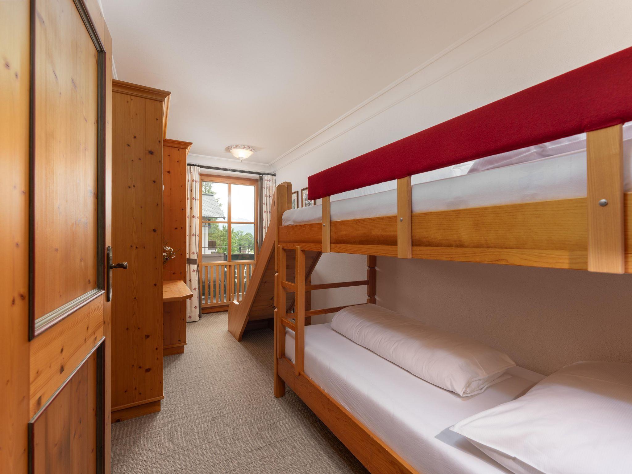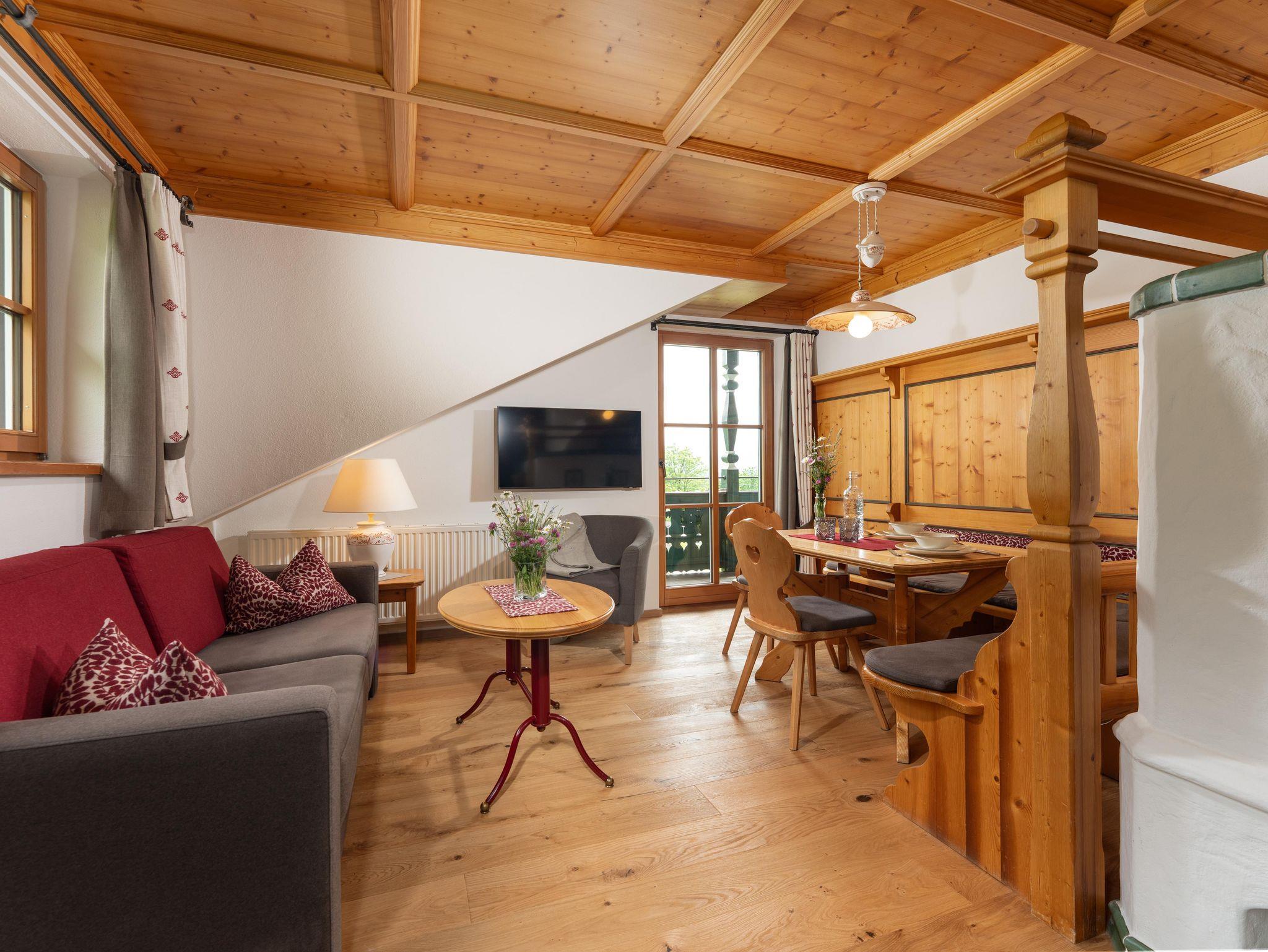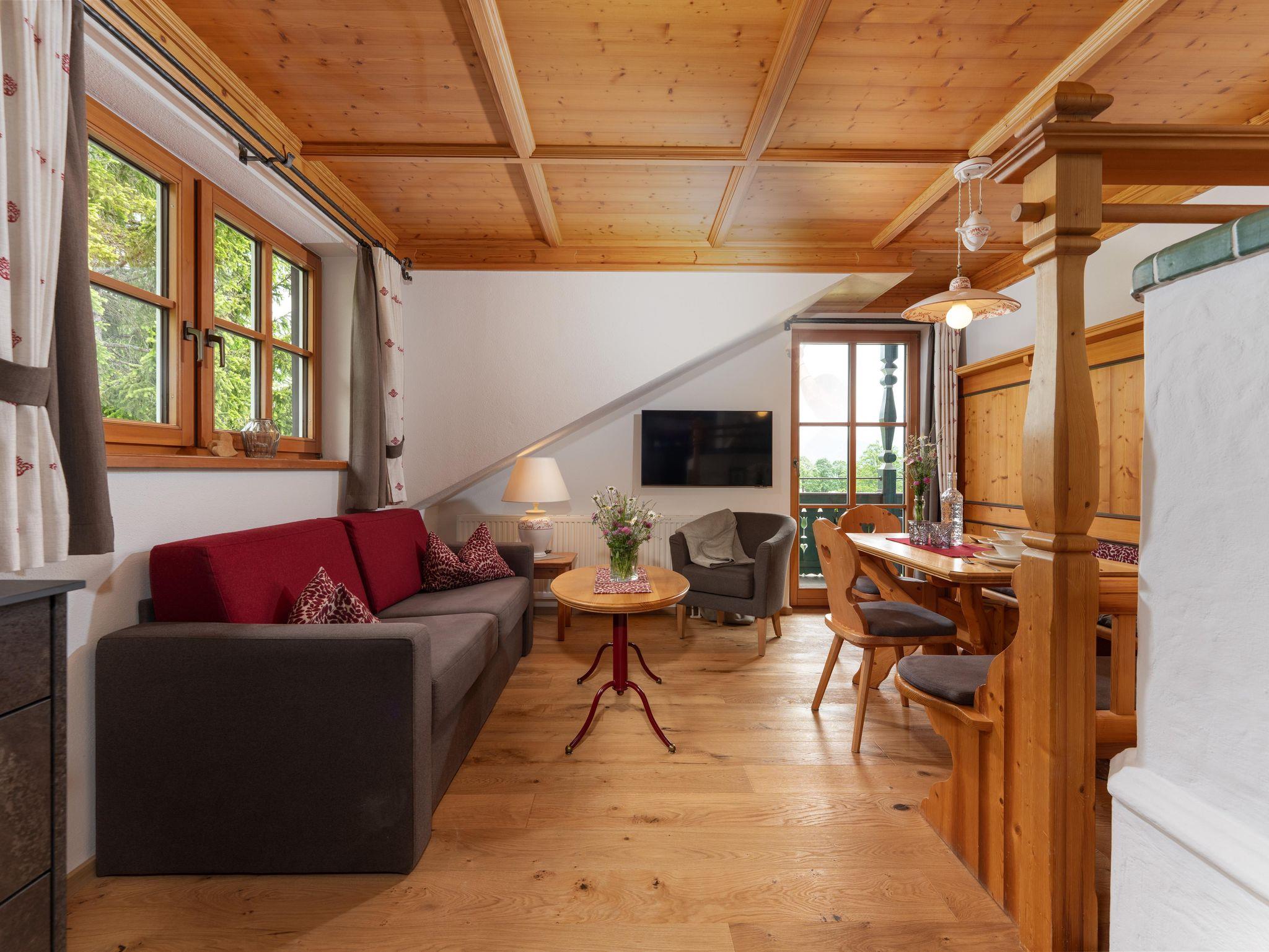 Das Appartement ist ausgestattet mit 2 Schlafzimmer (1x mit Stockbett), 1 Wohnzimmer (Ausziehcouch) mit Kachelofen, Sat-TV, Radio, Telefon, Mikrowelle, E-Herd, Kühlschrank, 2 Bad/Dusche, WC, Vorraum, Balkon