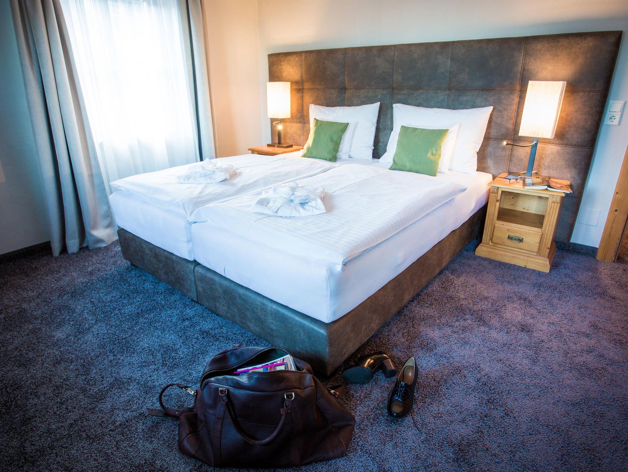 Die warmen Farbtöne und die großen Fenster im Doppelzimmer schaffen ein wohliges Ambiente in den lichtdurchfluteten Zimmern. Unsere gemütlichen Betten bieten höchsten Schlafkomfort und beste Qualität.