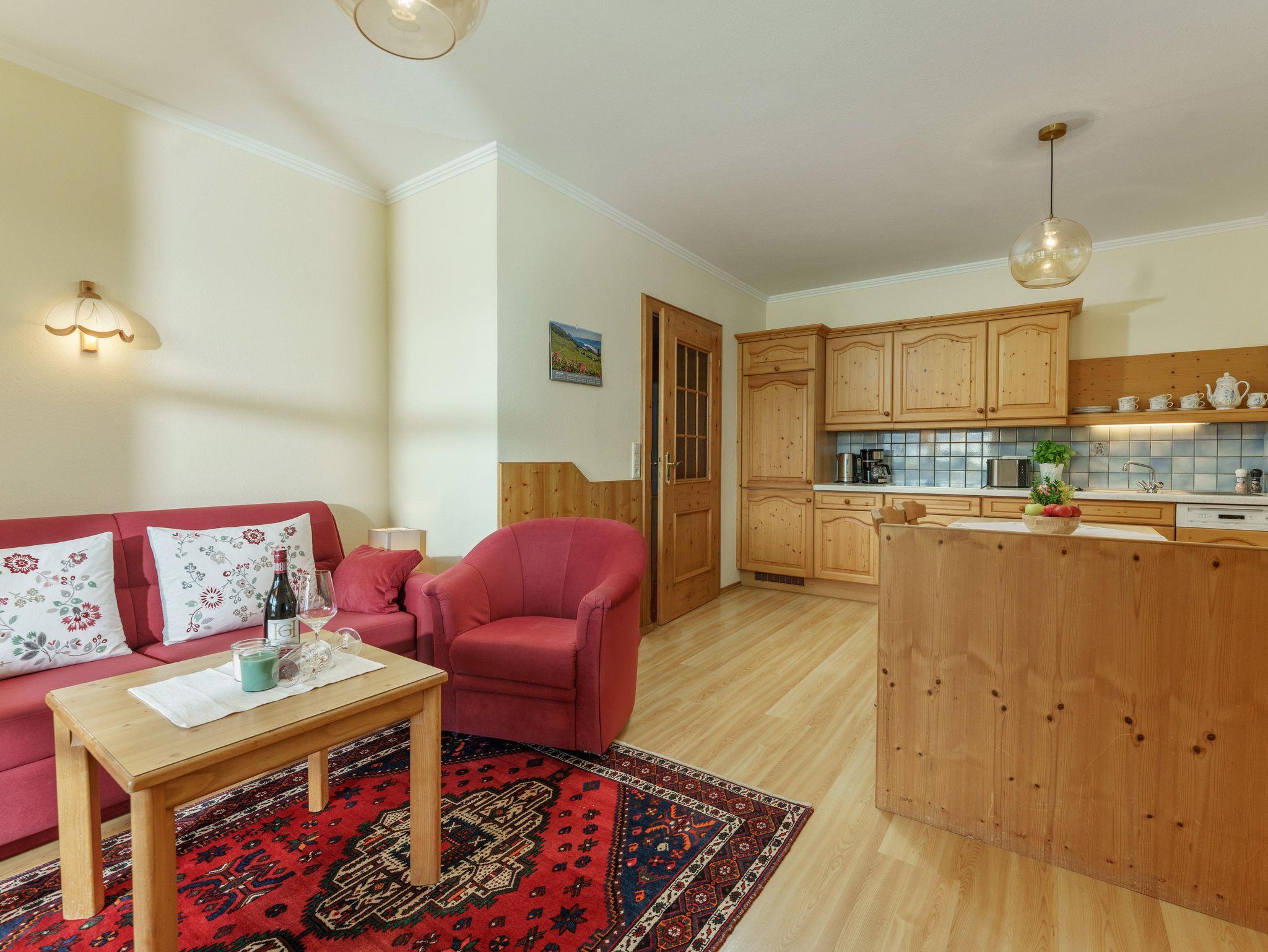 Sehr schönes, helles Appartement im Erdgeschoß. Das Appartement Alpengarten hat ca 47 m² mit einem Vorraum, einem Schlafzimmer, DU/WC getrennt und einem großen Wohnraum mit schöner Küchenecke und gemütlicher Wohnecke. Vom Wohnraum aus kommt man direkt in den Garten in Süd-Ost Richtung hinaus - schöne Liegewiese mit Liegestühlen - gemütliche Sitzgarnitur :) FLAT TV und Gratis W-LAN.