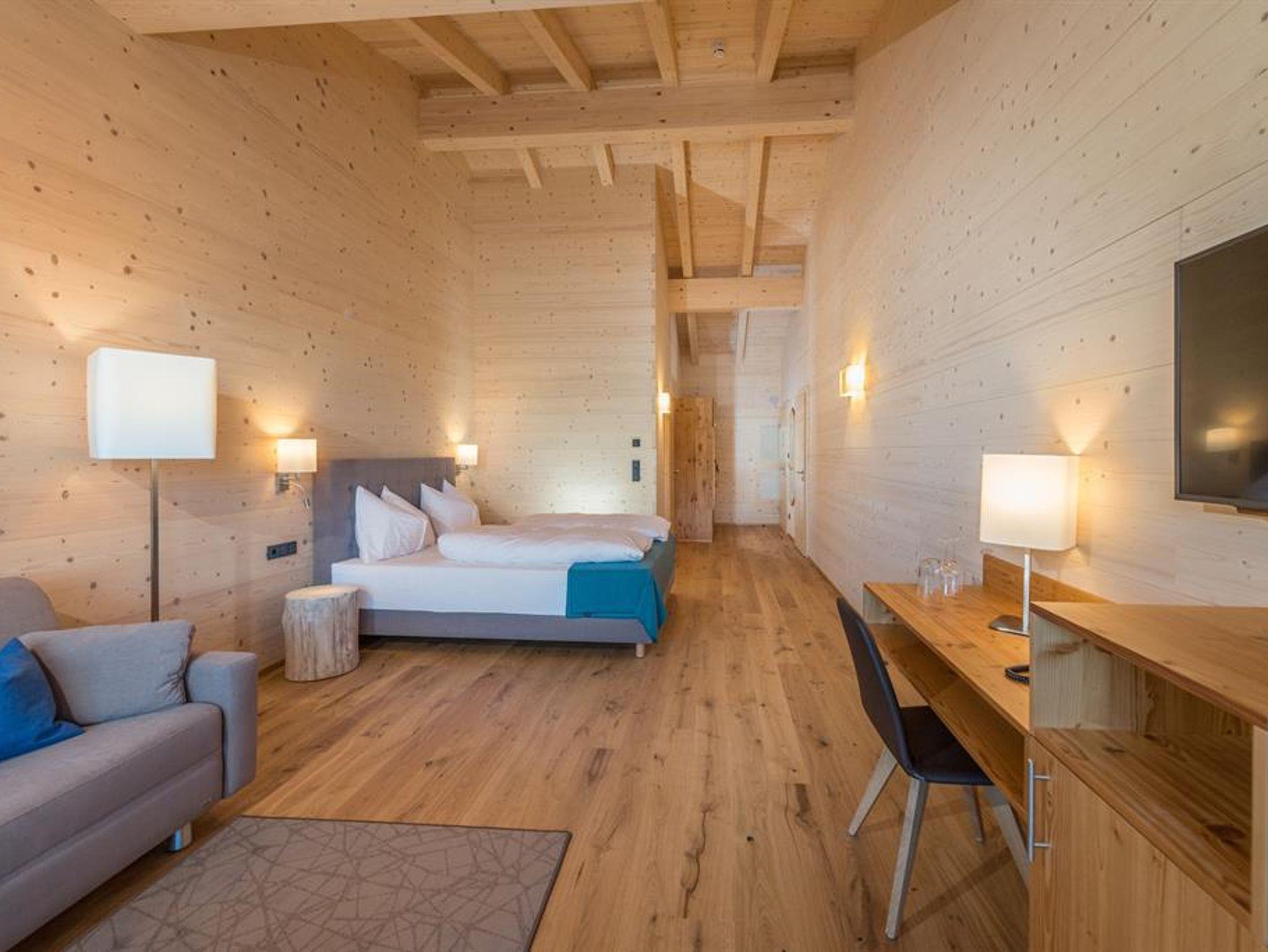 38 m² Wohnfläche für 1-3 Personen, Doppelbett und ausziehbare Schlafcouch, Badezimmer mit Dusche/WC, Balkon oder französischer Balkon, Bademantel, Schlapfen und Saunahandtücher, Flat-HD-SAT-TV mit Radio, free Wi-Fi, Safe, Mini-Kühlschrank, Telefon, Haartrockner.